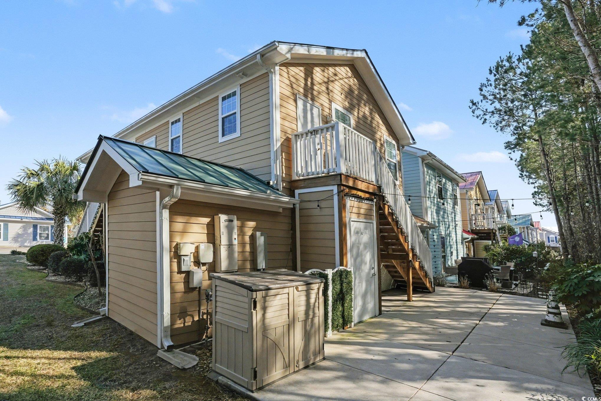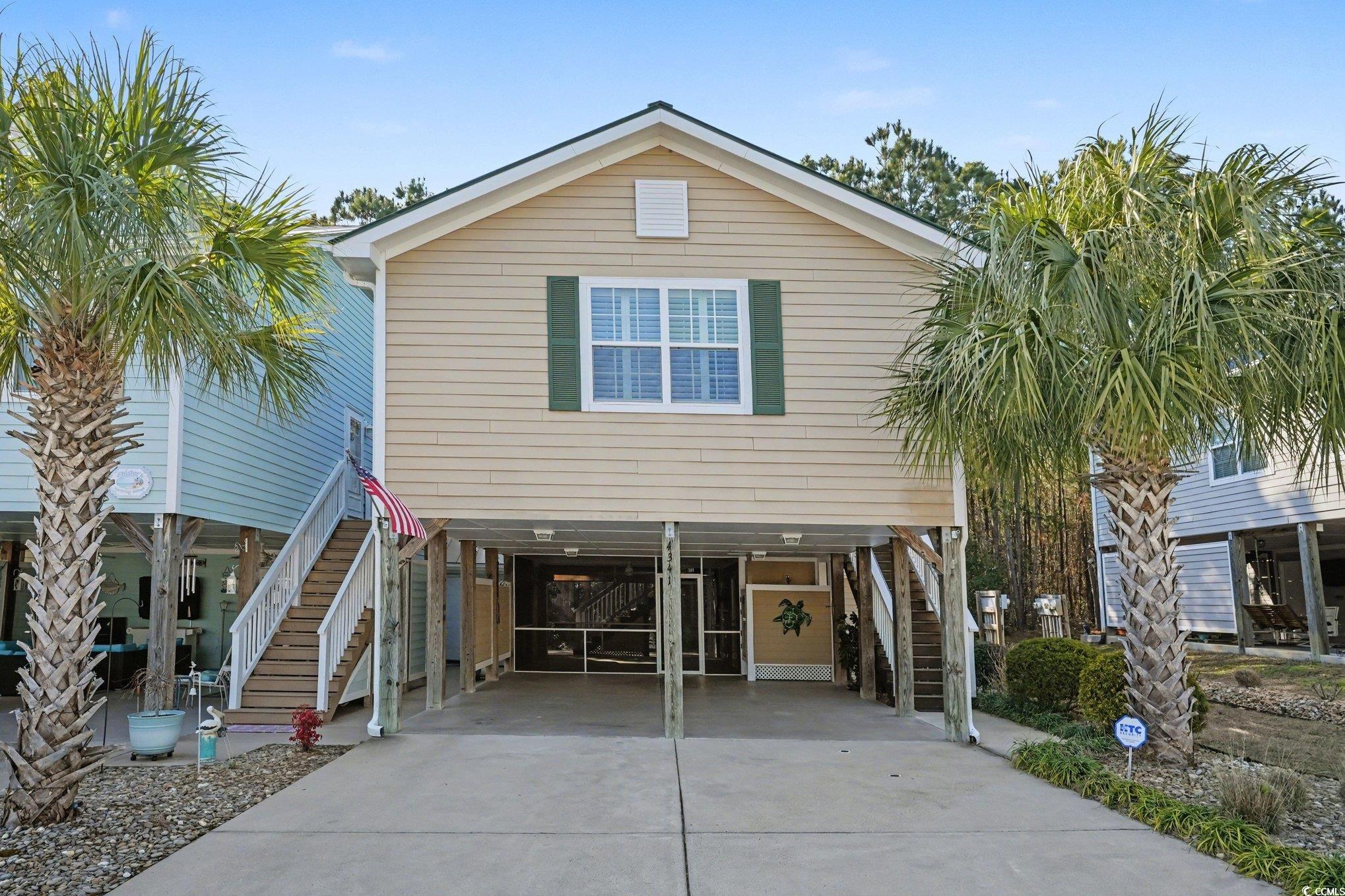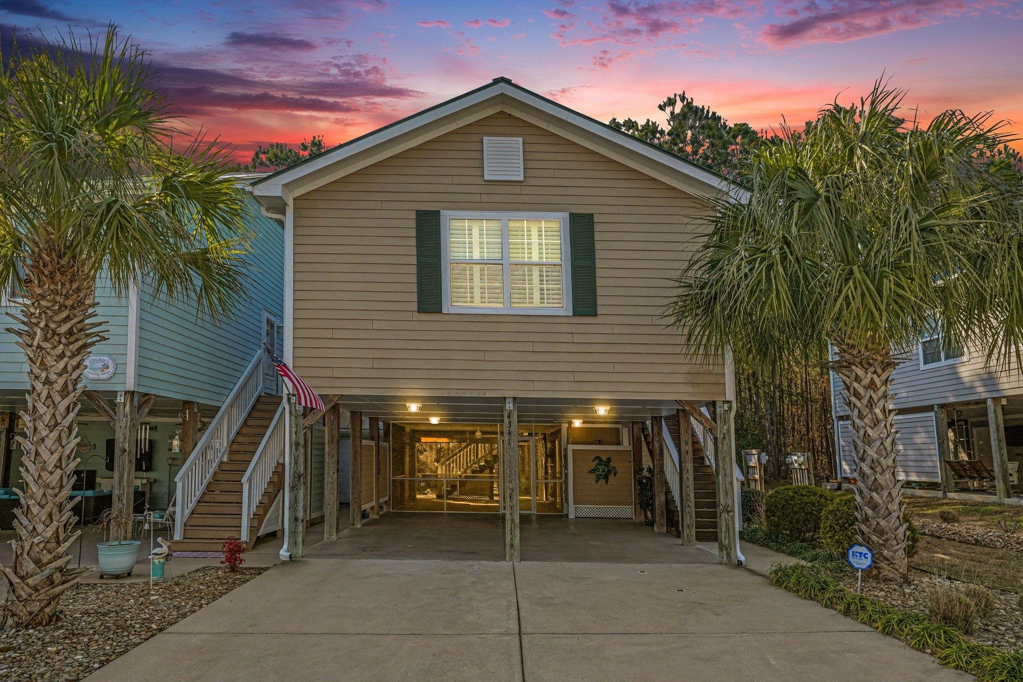 Experience the ultimate coastal lifestyle in this meticulously maintained home nestled in the desirable natural gas community of Grande Harbour. Situated just minutes to the Beach, golf and dining, this home is the perfect year-round retreat or weekend escape. The most unique feature of this home is the ground-floor entertainment area which opens up to a wooded backyard. The expansive screened-in patio retreat with lots of space includes a separate enclosed wet bar with commercial ice maker, beverage cooler and built-in sink with cabinets. An extra storage room with electric is great for those extra beach chairs and umbrellas. An outdoor shower is included for cleaning off the Beach sand before enjoying a dip in the community pool. Additional storage in the backyard with a patio shaded by private trees gives you more space to entertain. This move-in ready property features a bright, open layout enhanced by vaulted ceilings, abundant natural light, pocket doors for added space and timeless plantation shutters throughout. The kitchen is designed for entertaining with it's white raised-panel cabinetry, center island, granite countertops, recessed lighting, beautiful wood-like tile flooring and stainless steel appliances which include a gas stove, built-in microwave and refrigerator. Two over-sized bedrooms with en-suites on opposite sides of the living area for privacy, with ample closets and carpet that was replaced in 2022. Thoughtful upgrades include galvanized handrails on both front and back stairs, gutter guards and a professionally maintained HVAC system. All TV's and beds are included with FREE parking at Cherry Grove Beaches!! So bring your flip flops and sunscreen and start enjoying the Coastal lifestyle!