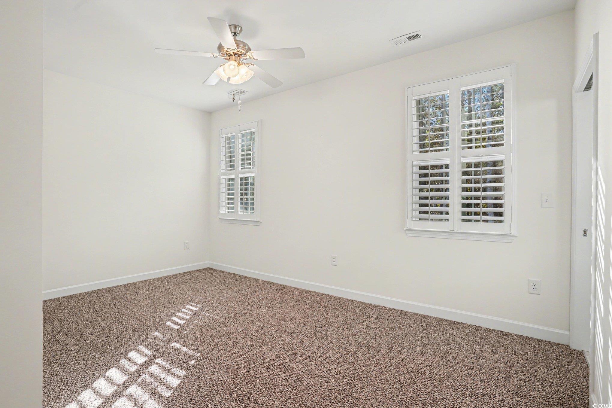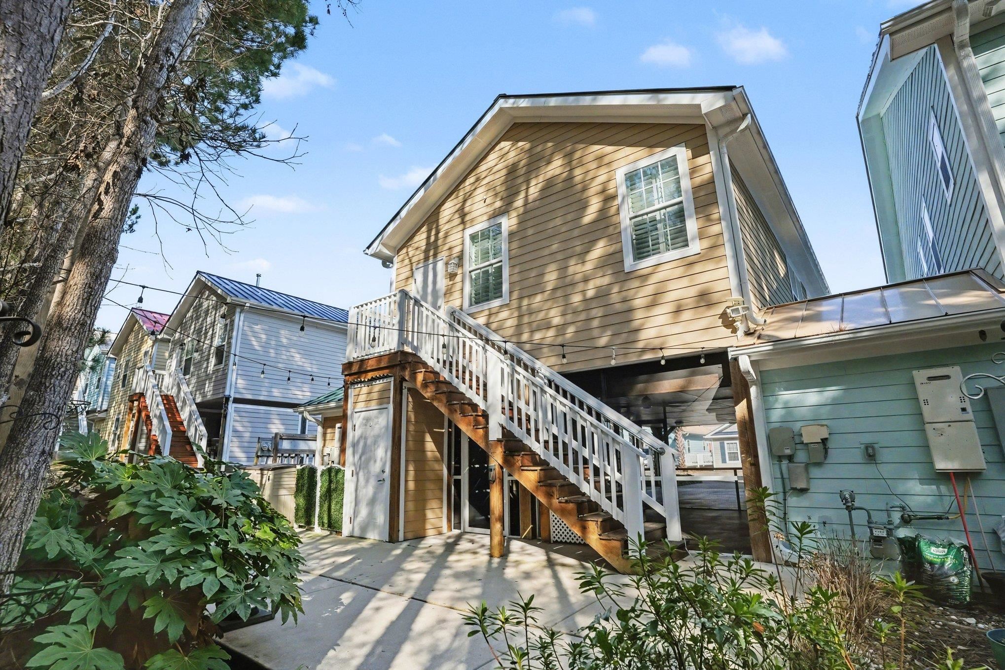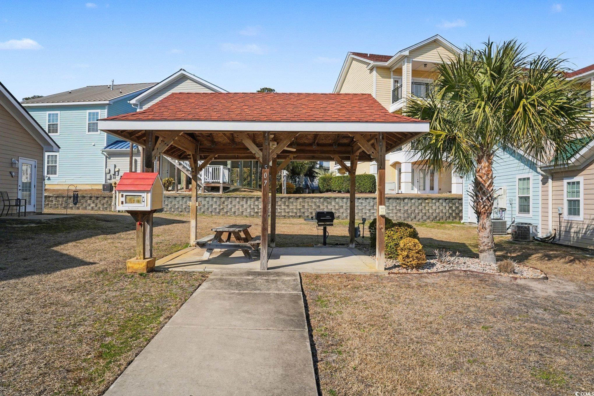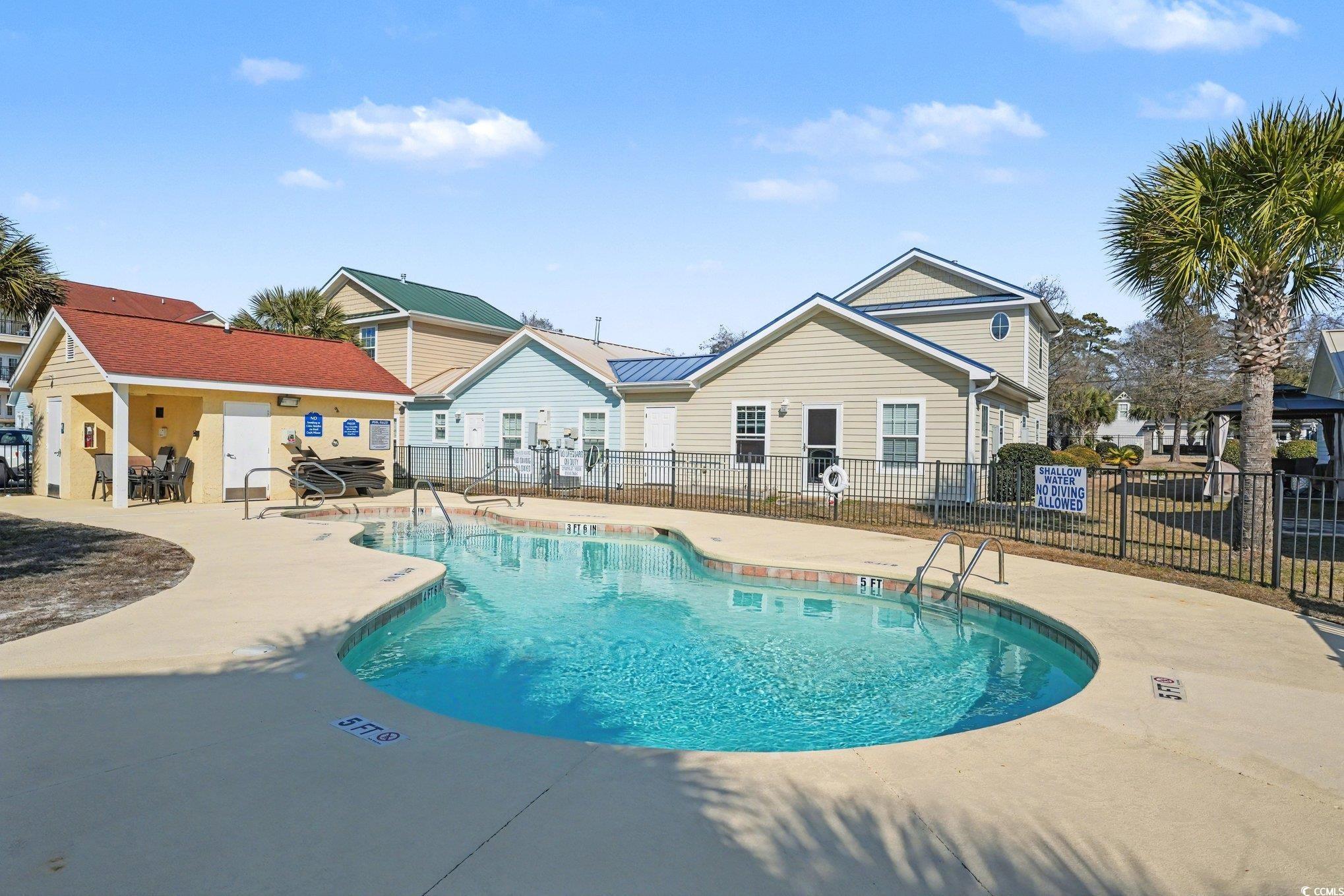 Experience the ultimate coastal lifestyle in this meticulously maintained home nestled in the desirable natural gas community of Grande Harbour. Situated just minutes to the Beach, golf and dining, this home is the perfect year-round retreat or weekend escape. The most unique feature of this home is the ground-floor entertainment area which opens up to a wooded backyard. The expansive screened-in patio retreat with lots of space includes a separate enclosed wet bar with commercial ice maker, beverage cooler and built-in sink with cabinets. An extra storage room with electric is great for those extra beach chairs and umbrellas. An outdoor shower is included for cleaning off the Beach sand before enjoying a dip in the community pool. Additional storage in the backyard with a patio shaded by private trees gives you more space to entertain. This move-in ready property features a bright, open layout enhanced by vaulted ceilings, abundant natural light, pocket doors for added space and timeless plantation shutters throughout. The kitchen is designed for entertaining with it's white raised-panel cabinetry, center island, granite countertops, recessed lighting, beautiful wood-like tile flooring and stainless steel appliances which include a gas stove, built-in microwave and refrigerator. Two over-sized bedrooms with en-suites on opposite sides of the living area for privacy, with ample closets and carpet that was replaced in 2022. Thoughtful upgrades include galvanized handrails on both front and back stairs, gutter guards and a professionally maintained HVAC system. All TV's and beds are included with FREE parking at Cherry Grove Beaches!! So bring your flip flops and sunscreen and start enjoying the Coastal lifestyle!