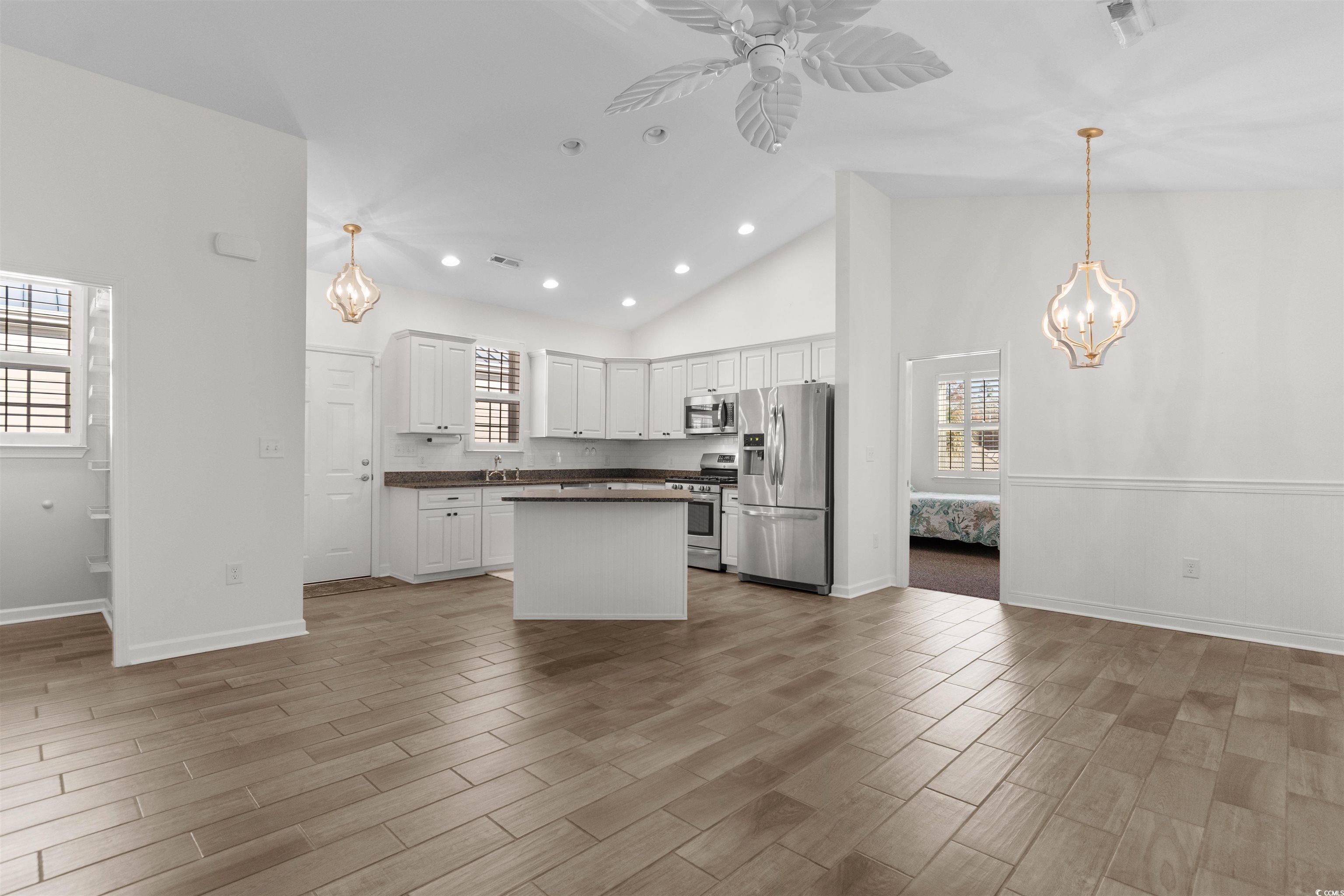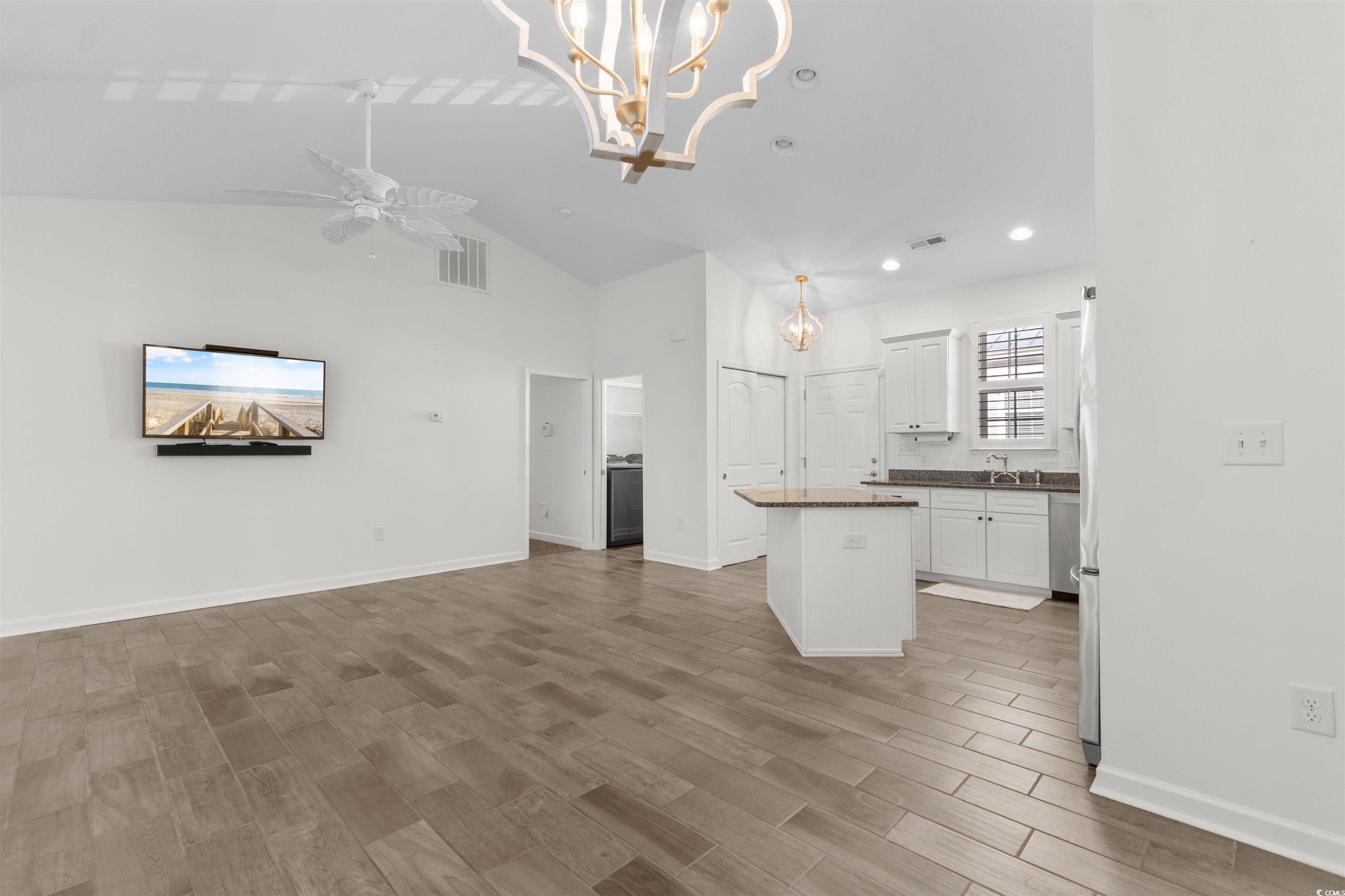 Set within the desirable natural gas community of Grande Harbour, this 2017-built home offers a bright, open layout and a peaceful coastal setting. From the moment you step inside, the vaulted ceilings and abundant natural light create a sense of spaciousness, while plantation shutters give each room a polished, timeless look. Wood-style tile flooring extends through the main living areas, tying the spaces together with an easy, modern flow. The kitchen is designed for both everyday living and entertaining, featuring crisp white raised-panel cabinetry, granite countertops, recessed lighting, stainless steel appliances, a gas cooktop, and a generous island that doubles as a gathering spot. Both bedrooms are oversized, allowing flexibility for dual primary suites. Large windows, ample storage, and thoughtful placement make each room feel private and comfortable. Out back, the property opens to a wooded backdrop that enhances the home’s sense of calm and privacy. The expansive screened-in area beneath the home becomes an inviting retreat—with room for lounging, dining, watching the game, or hosting friends. A separate enclosed space includes a built-in wet bar and commercial ice maker, perfect for entertaining, while the fully enclosed outdoor shower provides a refreshing spot to rinse off after a day at the beach. Additional storage rooms and an extra closet at the rear of the home make organization effortless. Thoughtfully updated over time, the home now includes bedroom carpeting installed in 2022, galvanized handrails added to both the front and back steps, gutter guards on the upper roof, and an HVAC system professionally maintained on a regular service program. The screened-in patio, outdoor shower enclosure, and wet bar with commercial ice maker elevate the home’s entertaining potential, while the TVs, bunk beds, exterior storage shed, and beverage cooler that convey make moving in a breeze. Move-in ready and exceptionally cared for, this property offers a truly effortless and comfortable coastal lifestyle.Located just minutes from shopping, dining, golf, water activities, and the beautiful Atlantic shoreline, this home places the best of coastal living right at your fingertips—whether you plan to stay year-round or escape here on weekends.