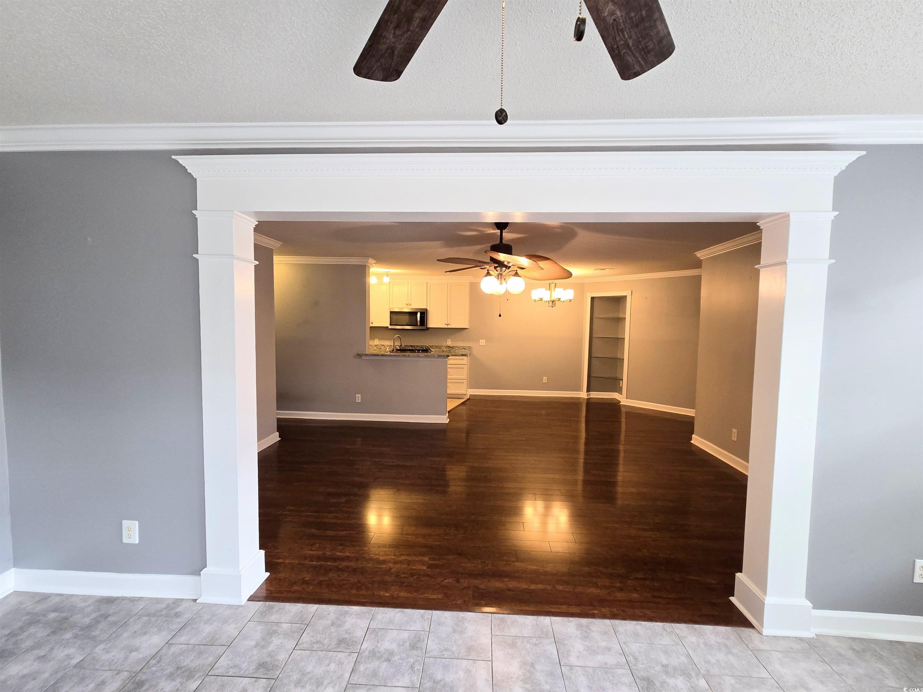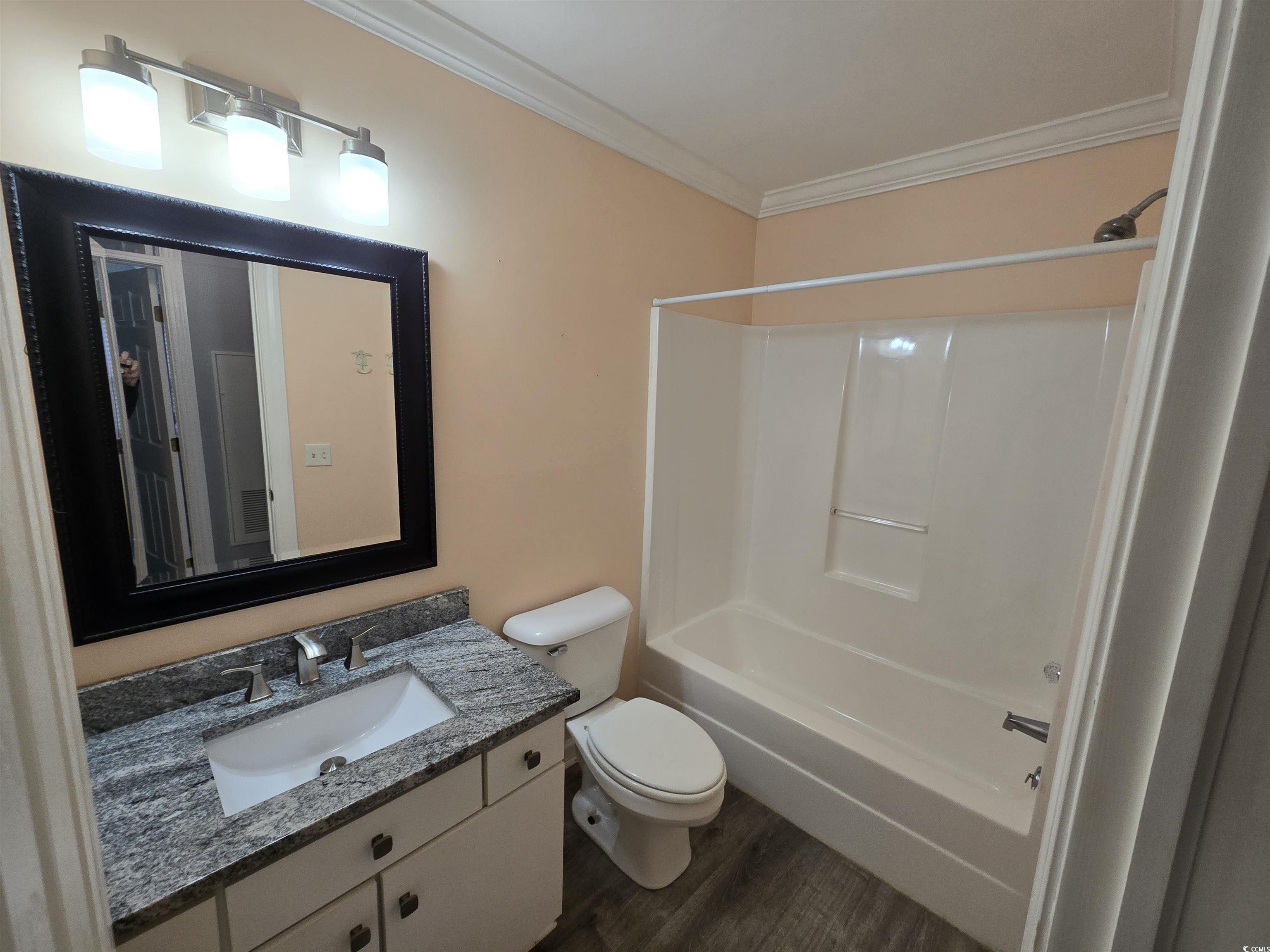 Welcome to this spacious first floor, three bedroom, two bath condo in the popular community of Riverwood. Step inside to your living area with an adjoining sun room, dining area, and upgraded kitchen. Kitchen features granite counter tops, modern cabinets, stainless steel appliances, and a dedicated pantry. Crown moulding is throughout the unit. Master Suite has two walk in closets and the large master bath features both a soaking tub and walk in shower and provides plenty of vanity space along with a linen closet. The two additional bedrooms share the second full bath with granite counter top and upgraded sink, faucet, mirror, and light fixture. Laundry room with washer & dryer. Shared patio behind the building backs to wooded area. Riverwood features a community pool, clubhouse, tennis courts, and basketball. The prime location is just a short drive to Murrells Inlet MarshWalk, golf courses, shopping, dining, Waccamaw Community Hospital, and beaches.