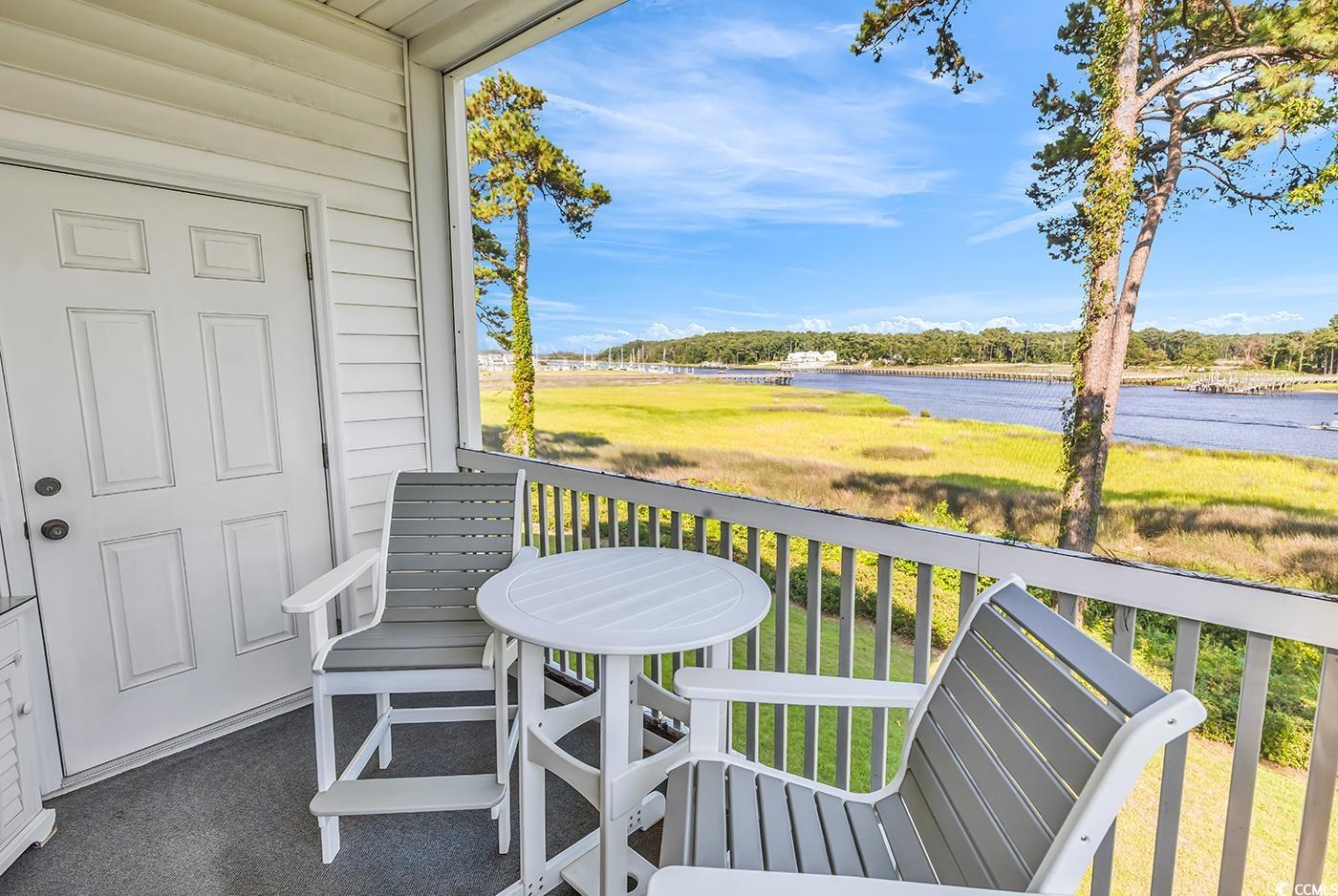 Spectacular waterway views of the intracoastal waterway from this gorgeous 3 BR, 2 BA second floor end unit at the Moorings in the Eastport golf course community in the heart of Little River. It has been loved and meticulously maintained in excellent condition by only one owner who has never rented it. The very best of intracoastal waterway views are offered from the screened porch, living room, kitchen, owner's suite and bay window. Selling beautifully furnished and decorated, this special unit exudes class, boasts many upgrades and is turn key ready to enjoy. The floor plan is well designed with a split bedroom plan with privacy for the owner's suite with large walk-in closet and overlooking views of the waterway while two guest bedrooms share a guest bathroom as you enter the foyer. Laundry offers a full size washer & dryer. Abundant cabinetry, pantry and work space in the kitchen along with stunning granite counter tops and 10" wide breakfast bar are sure to please the chef. Additional features include plantation shutters, ceiling fans in all bedrooms, recessed lighting in kitchen and storage room off screened porch. The building is exceptionally positioned on the end of a cul-de-sac offering unique tranquility, solitude and privacy from this beautiful end unit. Spectacular views from this end unit are among the very best to be found anywhere on the waterway. The Moorings is peacefully tucked away at Eastport golf course and offers a salt water community pool along with the golf course being located a short distance across the street. This Little River location provides easy access to water front dining, many wonderful restaurants and numerous golf courses as well as being only minutes to abundant shopping and the beach. This exceptional water front living experience offers a panorama of the best waterway views imaginable and will be ideal as a full time residence, second home getaway or an investment rental.