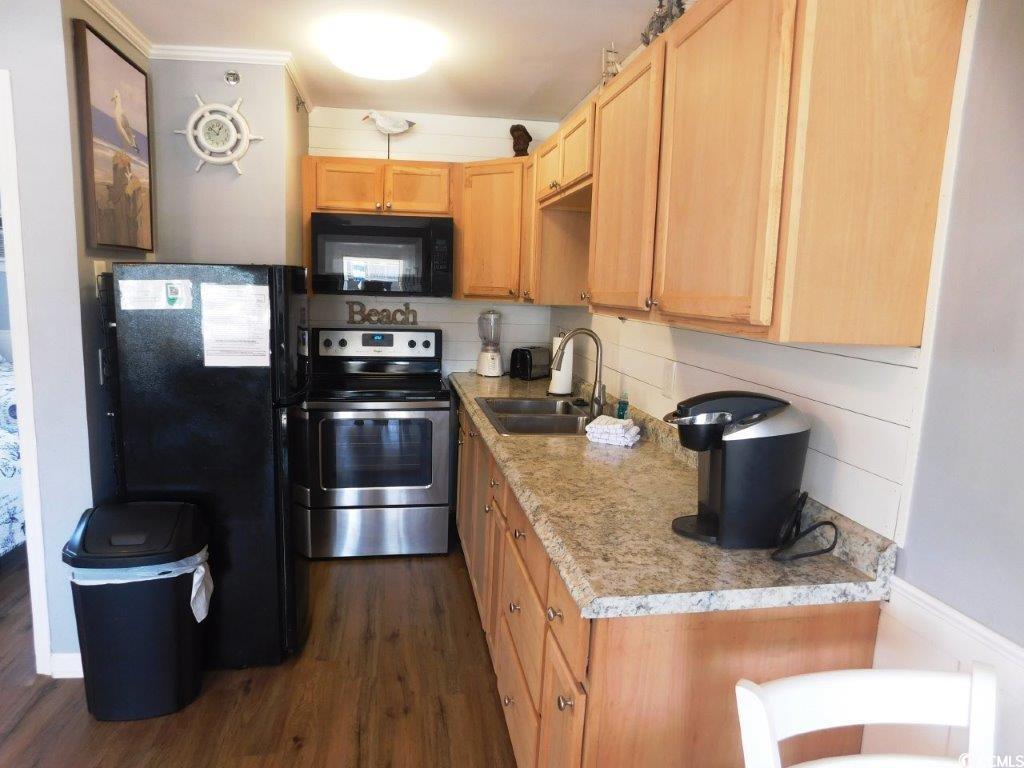Absolutely adorable updated 1 bedroom, 1 bath 1st floor end unit. The unit is fully furnished and directly across the street from the ocean, only steps to the beach. Cute beyond words! Open this bright, light corner unit and be surprised at the tastefully decorated Coastal décor. Be greeted by luxury vinyl floors that flow seamlessly from the door, kitchen, family room, dining area, bedroom, and full bath. Enter and appreciate the design featuring white chairs and squares in dining area and shiplap in the precious kitchen. Open, airy concept throughout with family room totally open to dining and kitchen areas. Walls throughout are a light Coastal blue with white floor and ceiling molding to make the unit totally “POP!” There’s a great storage area, plus kitchen comes with stainless steel smooth top range/oven, microwave, refrigerator, plenty of cabinets and drawers for your essentials. There’s a darling dining area as well. Walk into the spacious bedroom boasting white chairs and squares on wall, plenty of windows to provide the bright, light welcoming feeling and spectacular views of the channel from your window. The bedroom features 2 double beds, closet, and full bath with window overlooking channel views, tub/shower, comfort toilet, and stylish high sink, plus luxury vinyl floors. This unit is adorable and provides phenomenal channel views from the bedroom, spectacular blue Atlantic Ocean across the street, lovely large convenient swimming pool at your front door, and a front porch sitting area and side porch for your grilling and enjoyment. Whether you have been wanting your own “beach bungalow” for your second home or rental income, you don’t want to miss this jewel in the heart of Cherry Grove, and all that North Myrtle Beach has to offer- shopping, restaurants, golf, entertainment, shagging, and much more. Awesome unit, you’ll want to call it yours.