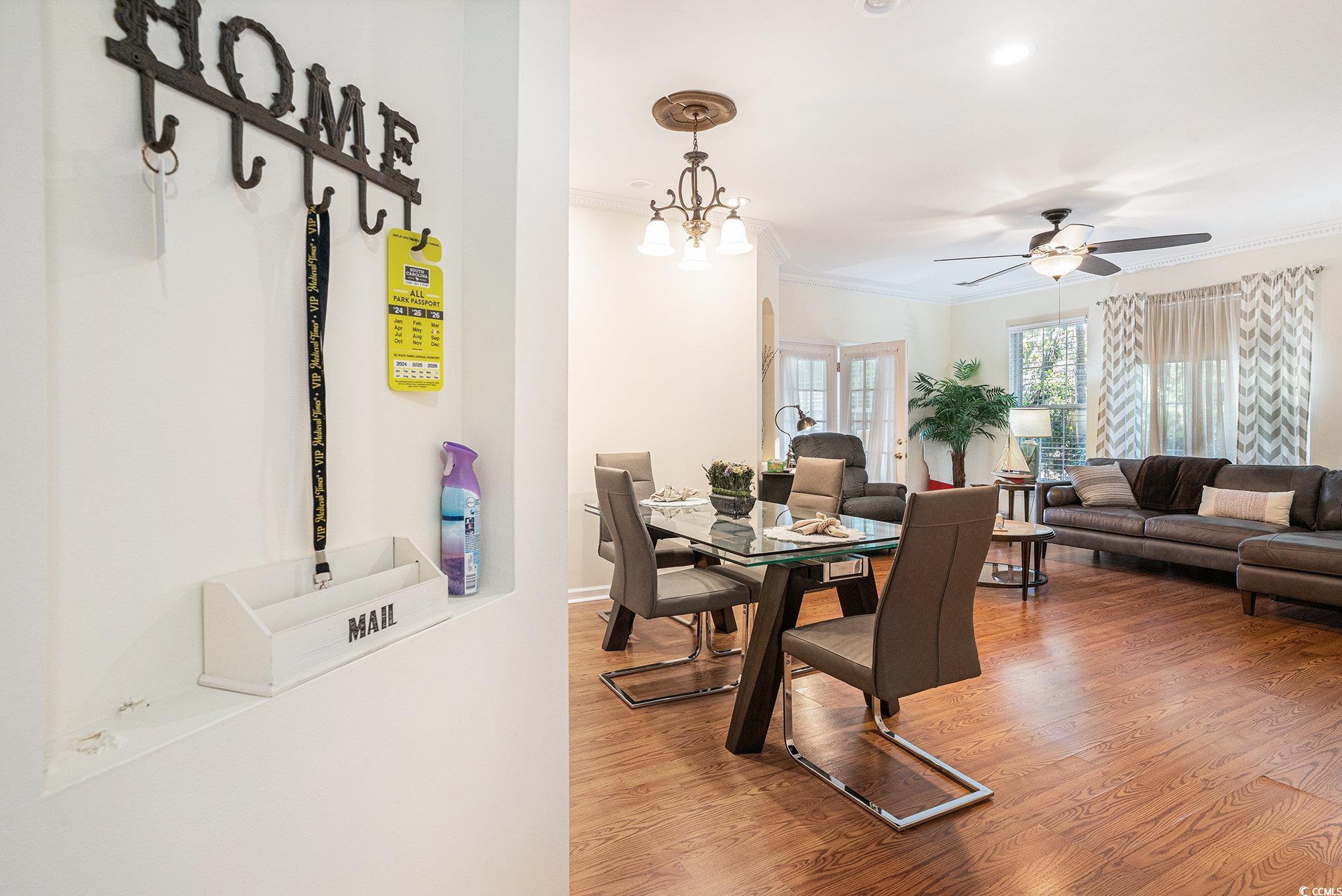 This beautifully maintained first-floor condo features 2 bedrooms, 2 bathrooms, a private one-car garage, and a bright Carolina room. The open layout includes laminate flooring in the main living areas, tile in the kitchen, bathrooms, and laundry room, and custom crown molding throughout. The kitchen offers stainless steel appliances along with generous cabinet and counter space. The primary suite includes a ceiling fan, walk-in closet, and ensuite bath with a fiberglass shower. The guest bedroom provides direct access to the Carolina room, which is also accessible from the living room--perfect for relaxing or entertaining. This condo is perfect as a primary residence, investment property or peaceful vacation retreat. Located in Wyngate at Wachesaw East, a gated community in Murrells Inlet, this home offers an ideal blend of comfort, convenience, and coastal lifestyle. Enjoy resort-style amenities including two outdoor pools, a fully equipped fitness center, tennis and pickleball courts, scenic walking and biking trails, and 24/7 gated security. Just minutes from the beach, the MarshWalk, Brookgreen Gardens, local restaurants, shopping, and Waccamaw Hospital,
