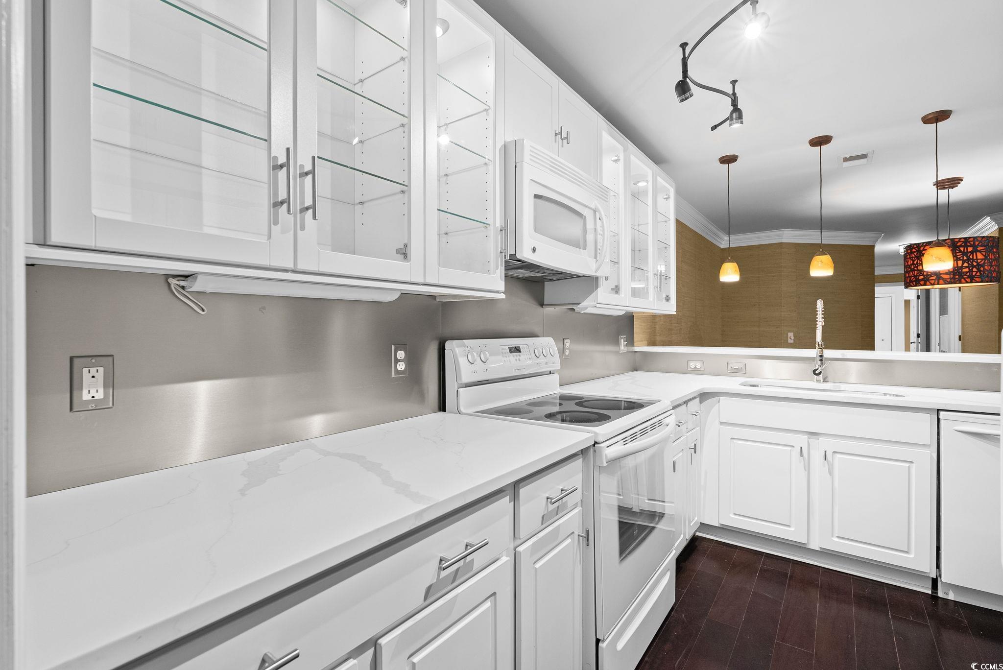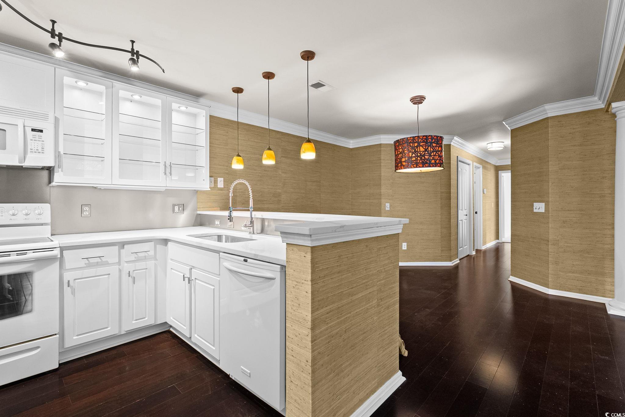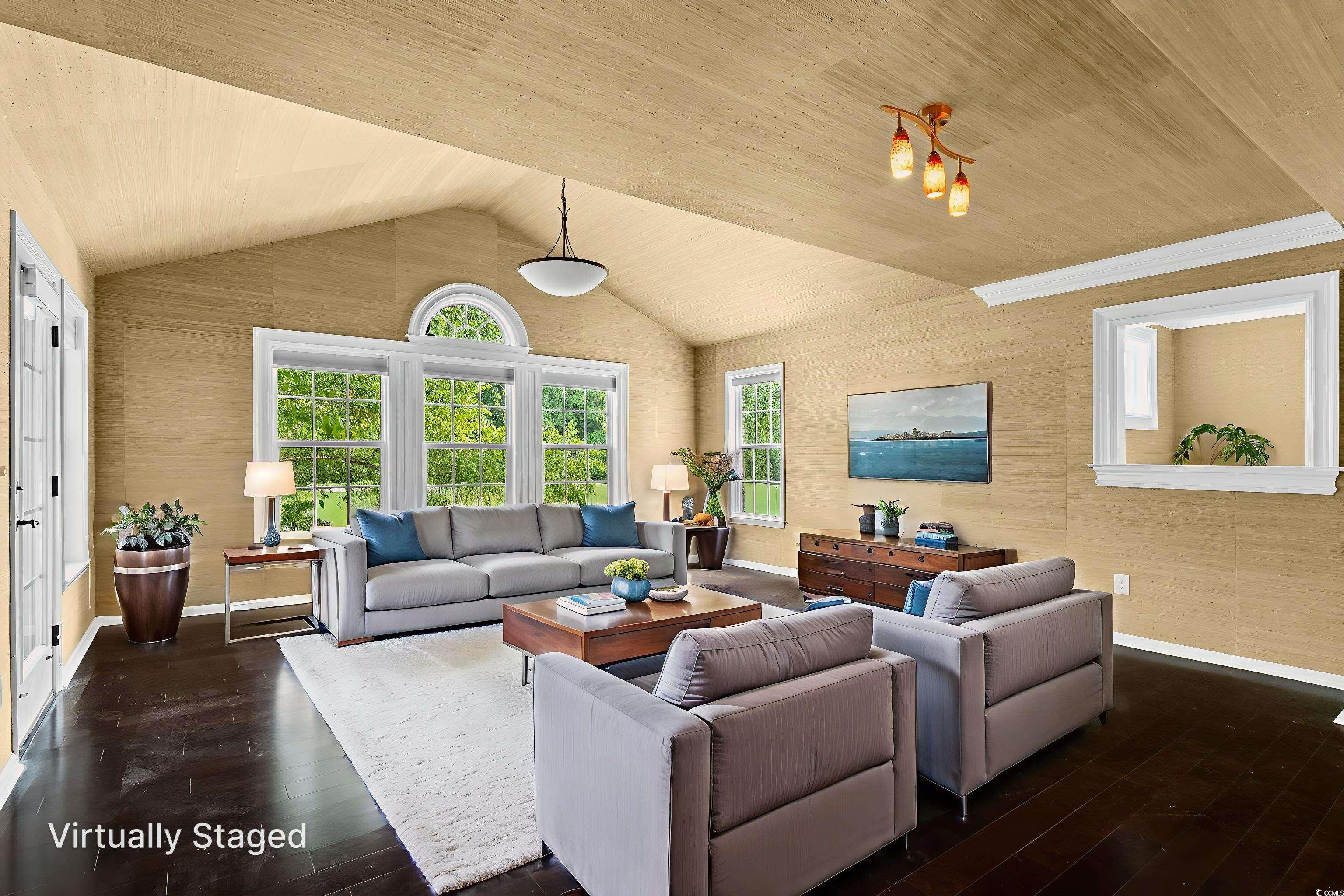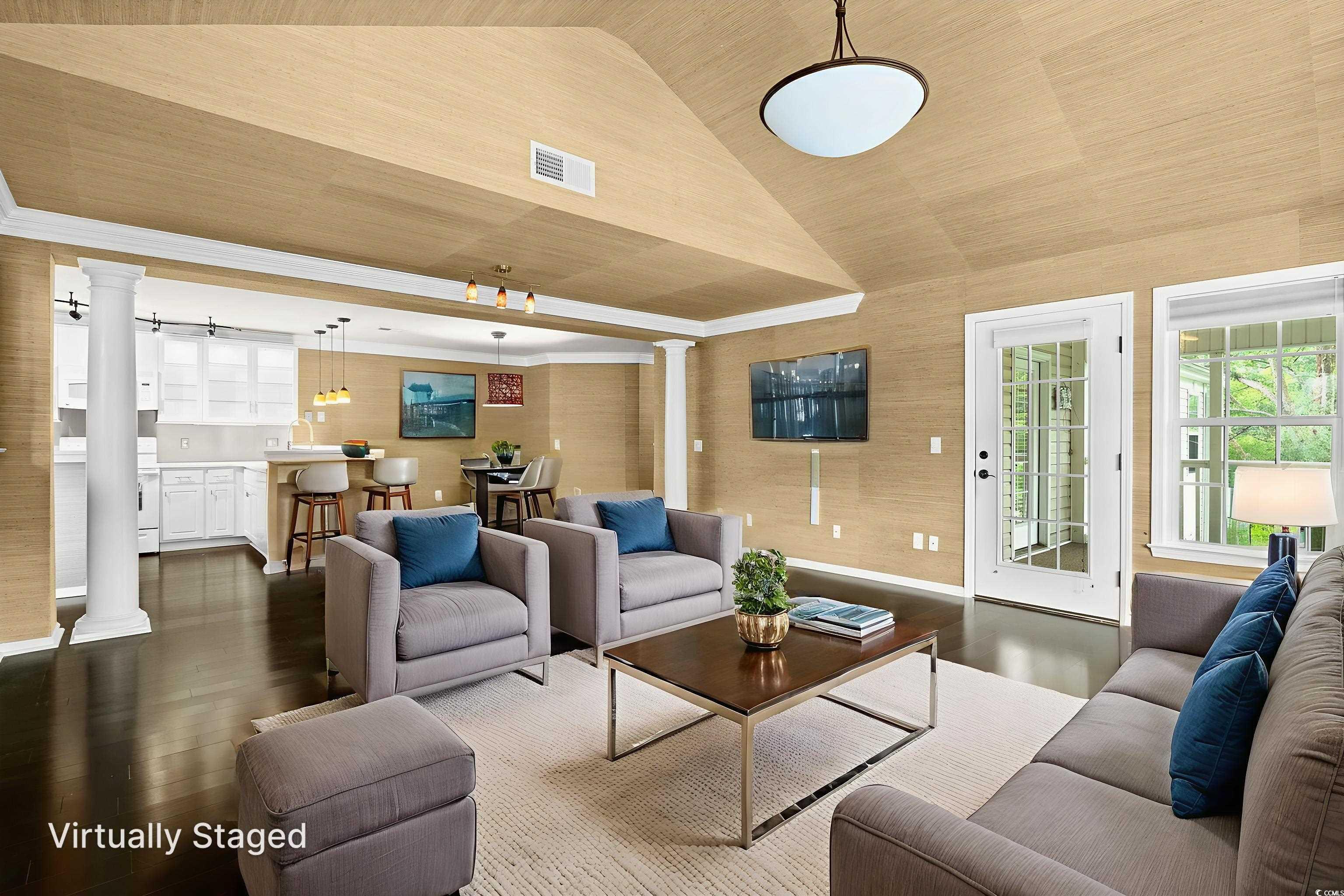 Discover your dream home in Wyngate- located at Wachesaw East in Murrells Inlet. This gated-community condo was updated by the current owner/interior designer and has vaulted ceilings for a spacious feel- with breathtaking private golf course views. It has decorative columns, custom molding, and hardwood flooring throughout the living area, brand new berber carpeting in bedrooms, dimmable designer light fixtures, new quartz countertops, custom-templated stainless steel kitchen backsplash, and ‘California Closets’ installed in pantry room, guest rooms, and both walk-in master bedroom closets. Wachesaw East amenities consist of a large community pool, fitness room, tennis/pickleball courts and walking trails. Ideal location nears the beach, Inlet Marsh-walk, Brookgreen gardens, boat landing on the Intracoastal waterway, amazing restaurants and Waccamaw hospital. Truly, one of a kind! Living room, dining room and screened-in porch have vitually staged pictures.