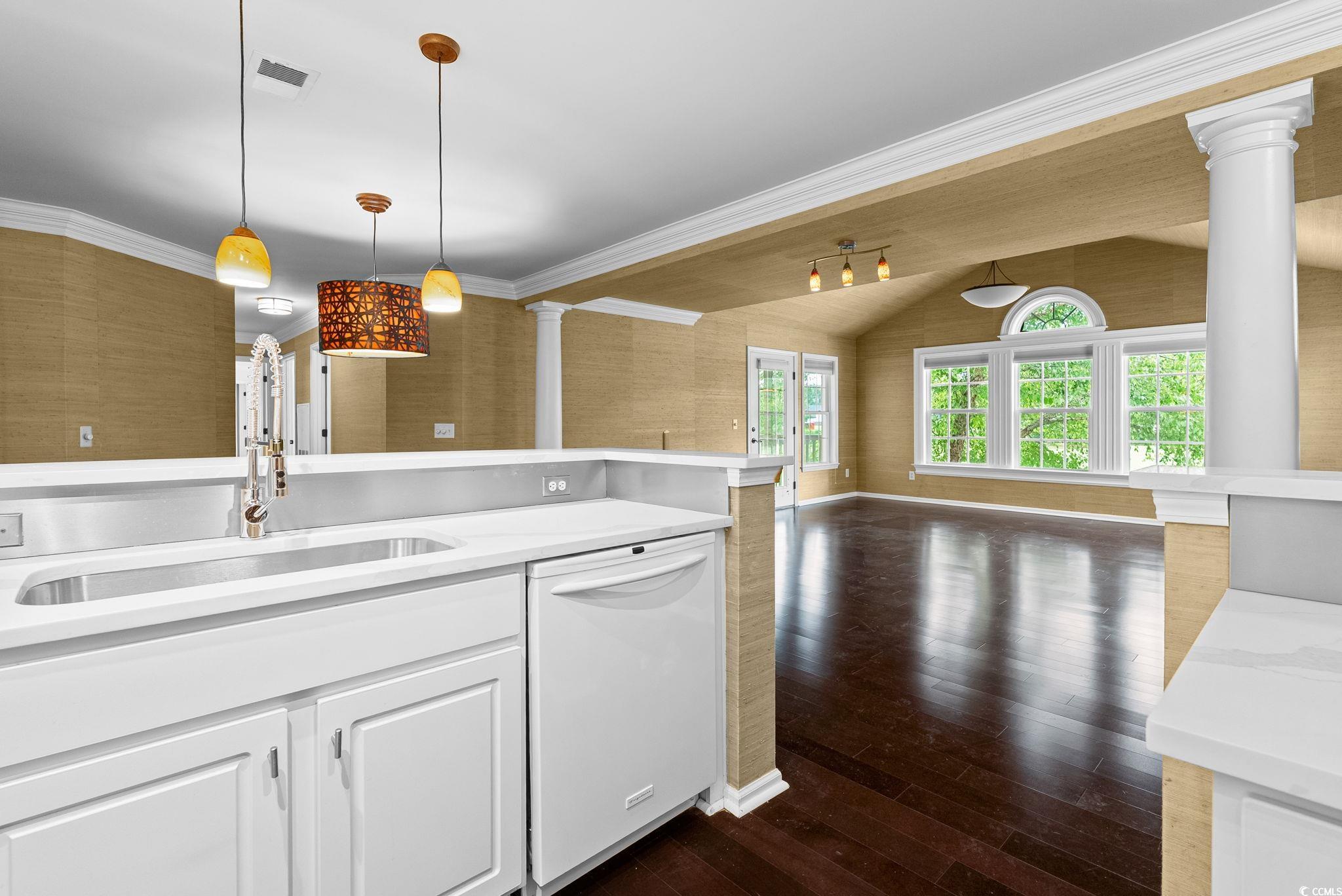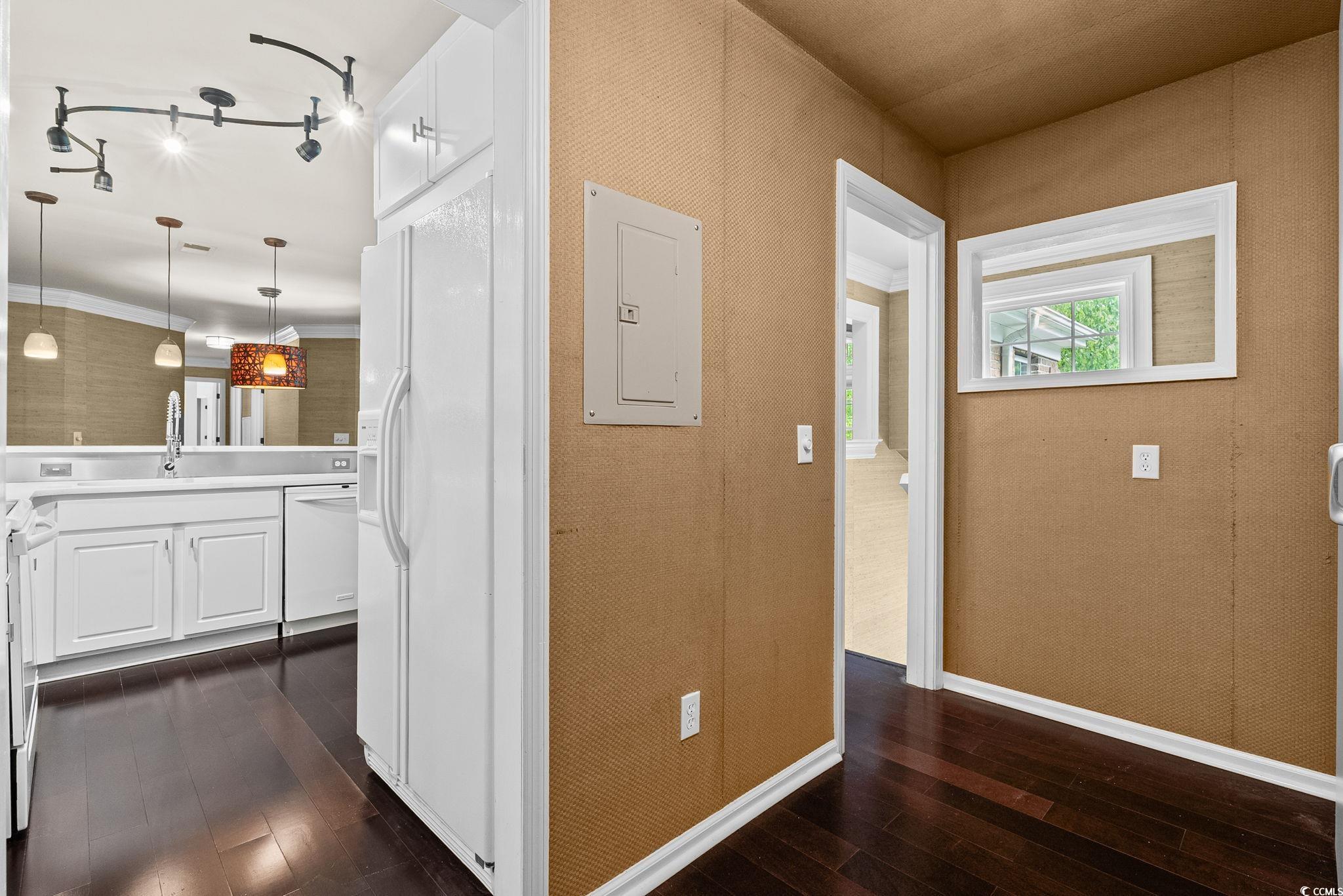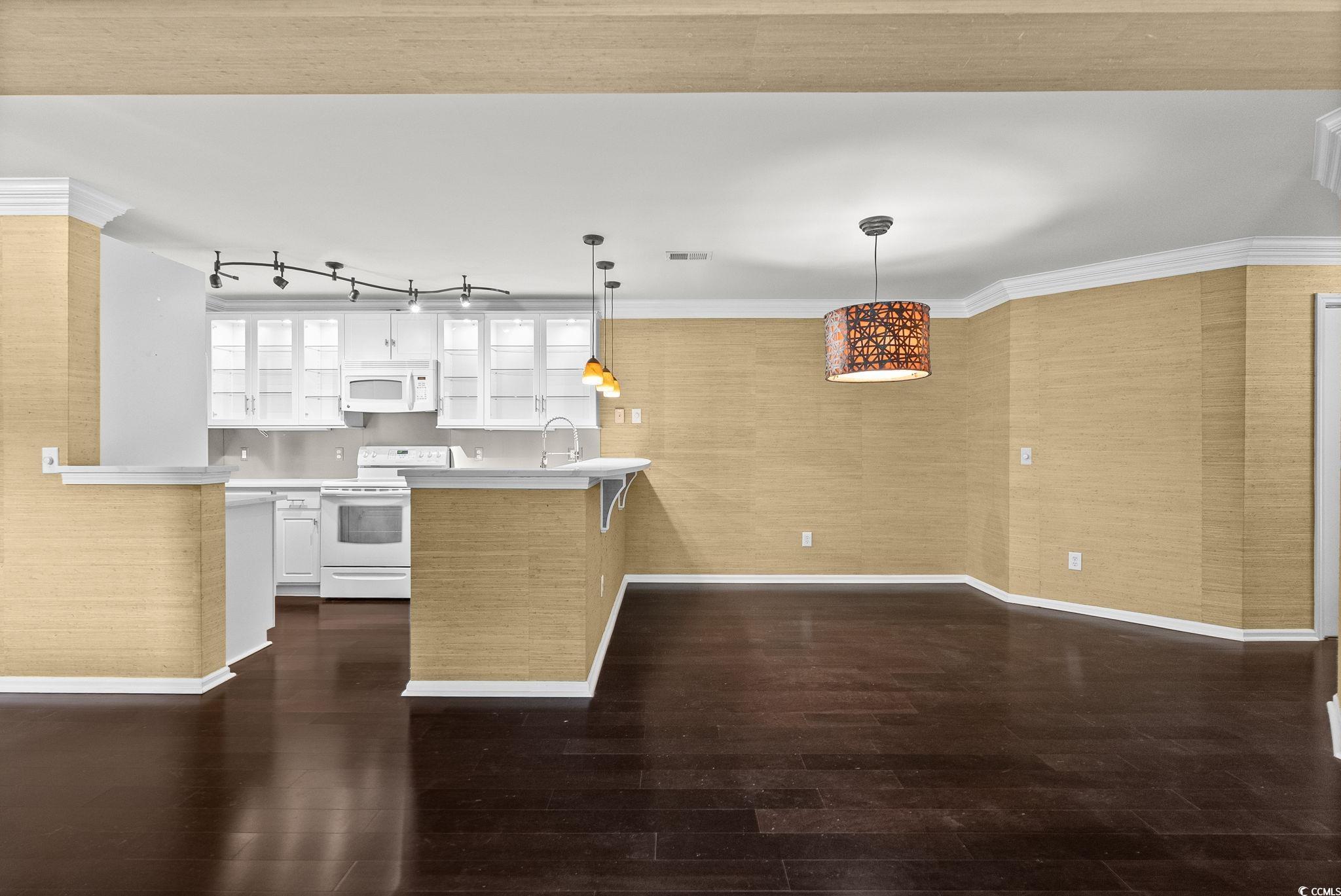 Discover your dream home in Wyngate- located at Wachesaw East in Murrells Inlet. This gated-community condo was updated by the current owner/interior designer and has vaulted ceilings for a spacious feel- with breathtaking private golf course views. It has decorative columns, custom molding, and hardwood flooring throughout the living area, brand new berber carpeting in bedrooms, dimmable designer light fixtures, new quartz countertops, custom-templated stainless steel kitchen backsplash, and ‘California Closets’ installed in pantry room, guest rooms, and both walk-in master bedroom closets. Wachesaw East amenities consist of a large community pool, fitness room, tennis/pickleball courts and walking trails. Ideal location nears the beach, Inlet Marsh-walk, Brookgreen gardens, boat landing on the Intracoastal waterway, amazing restaurants and Waccamaw hospital. Truly, one of a kind! Living room, dining room and screened-in porch have vitually staged pictures.