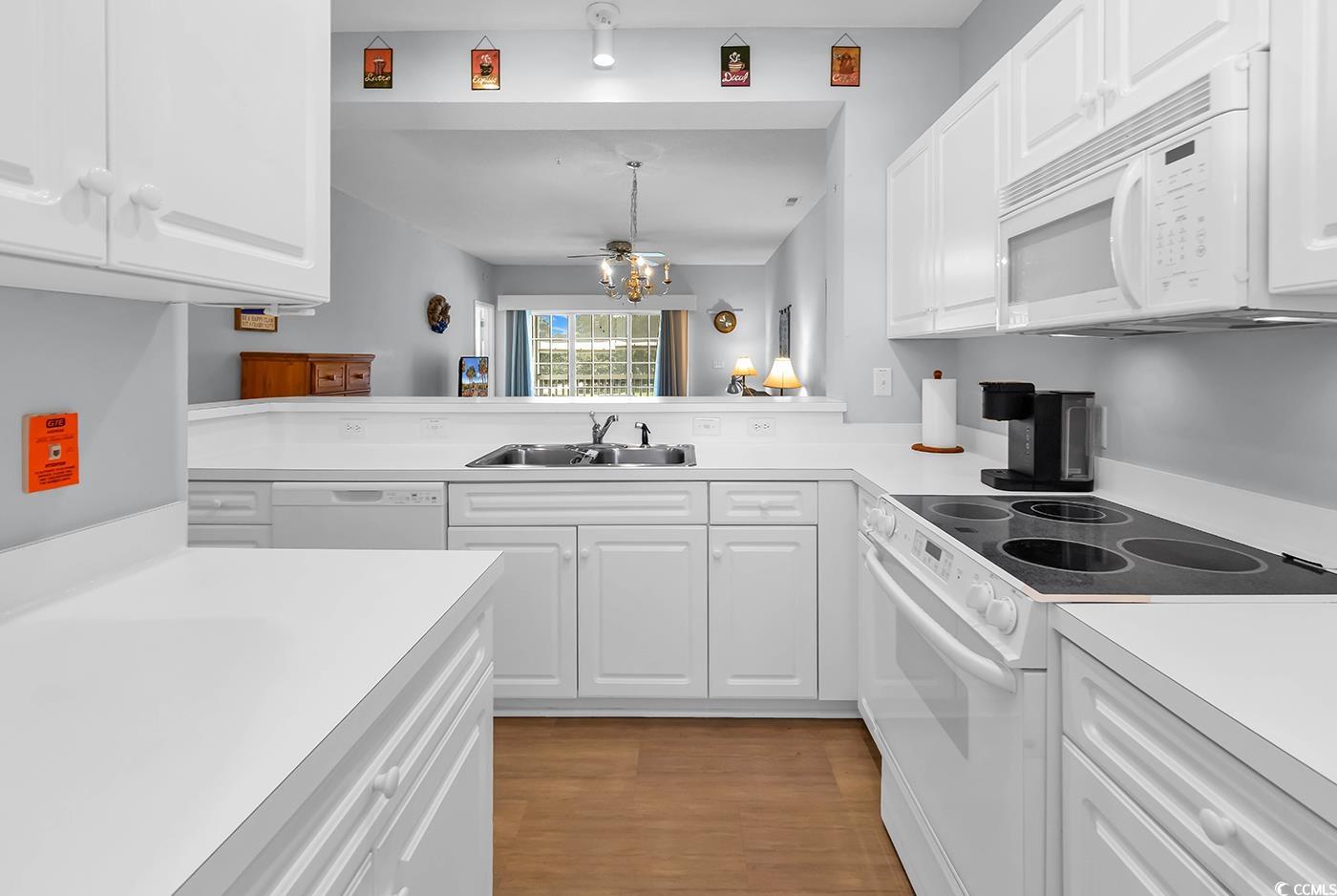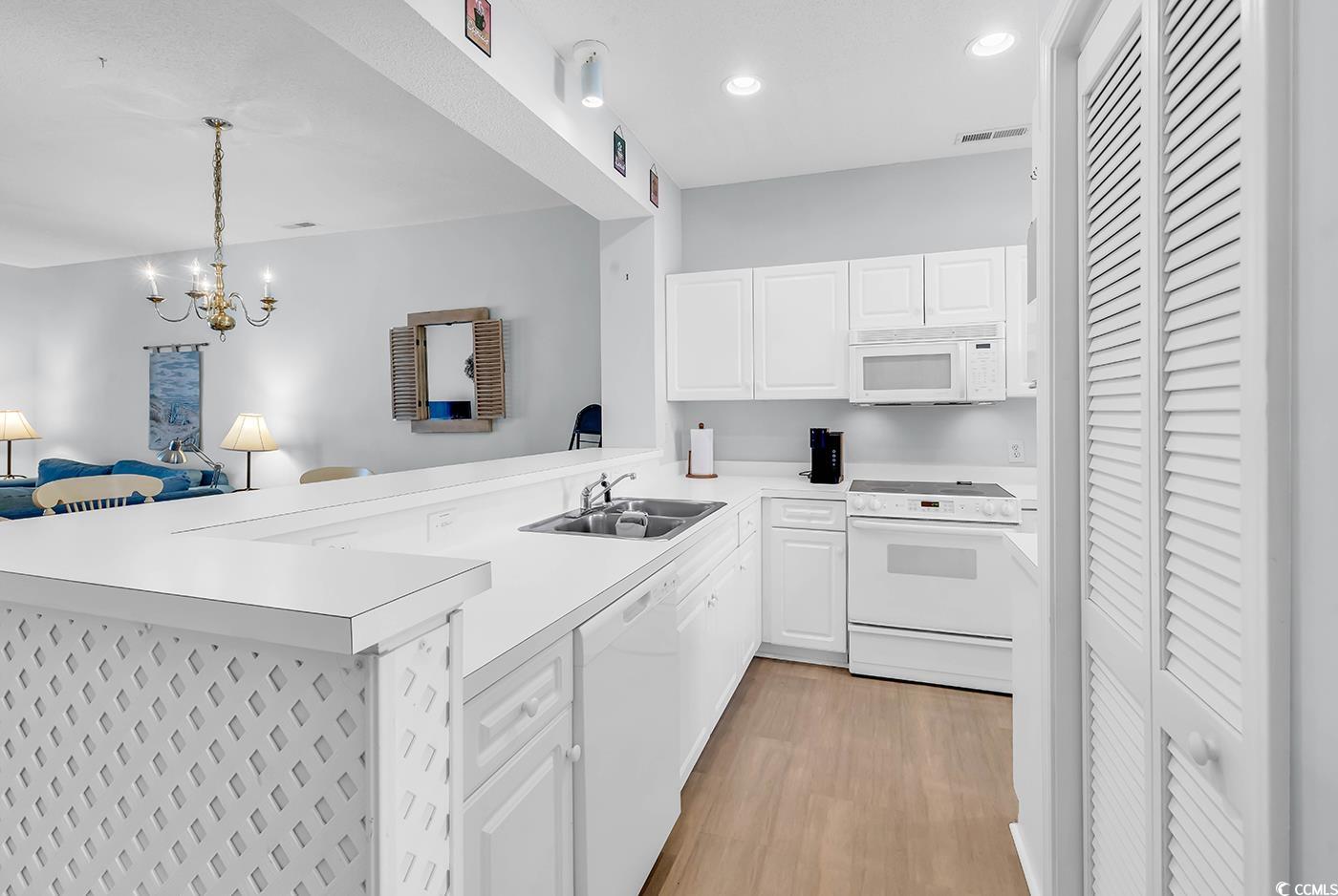 Top-floor living at The Moorings inside the sought-after Eastport community in Little River! This spacious 2-bedroom, 2-bath condo offers privacy and comfort with no units above. Enjoy a full-size kitchen perfect for everyday cooking, solid flooring throughout for easy maintenance, and a bright open layout. Step outside to your private oversized screened-in balcony featuring serene golf course and pond views, ideal for morning coffee or evening relaxation. An extra storage closet on the balcony provides convenient space for seasonal items, while the in-unit washer and dryer add everyday ease. Located in a peaceful waterfront community near marinas, dining, and just minutes from the beach, this condo blends quiet retreat with coastal convenience. Schedule your appointment today!