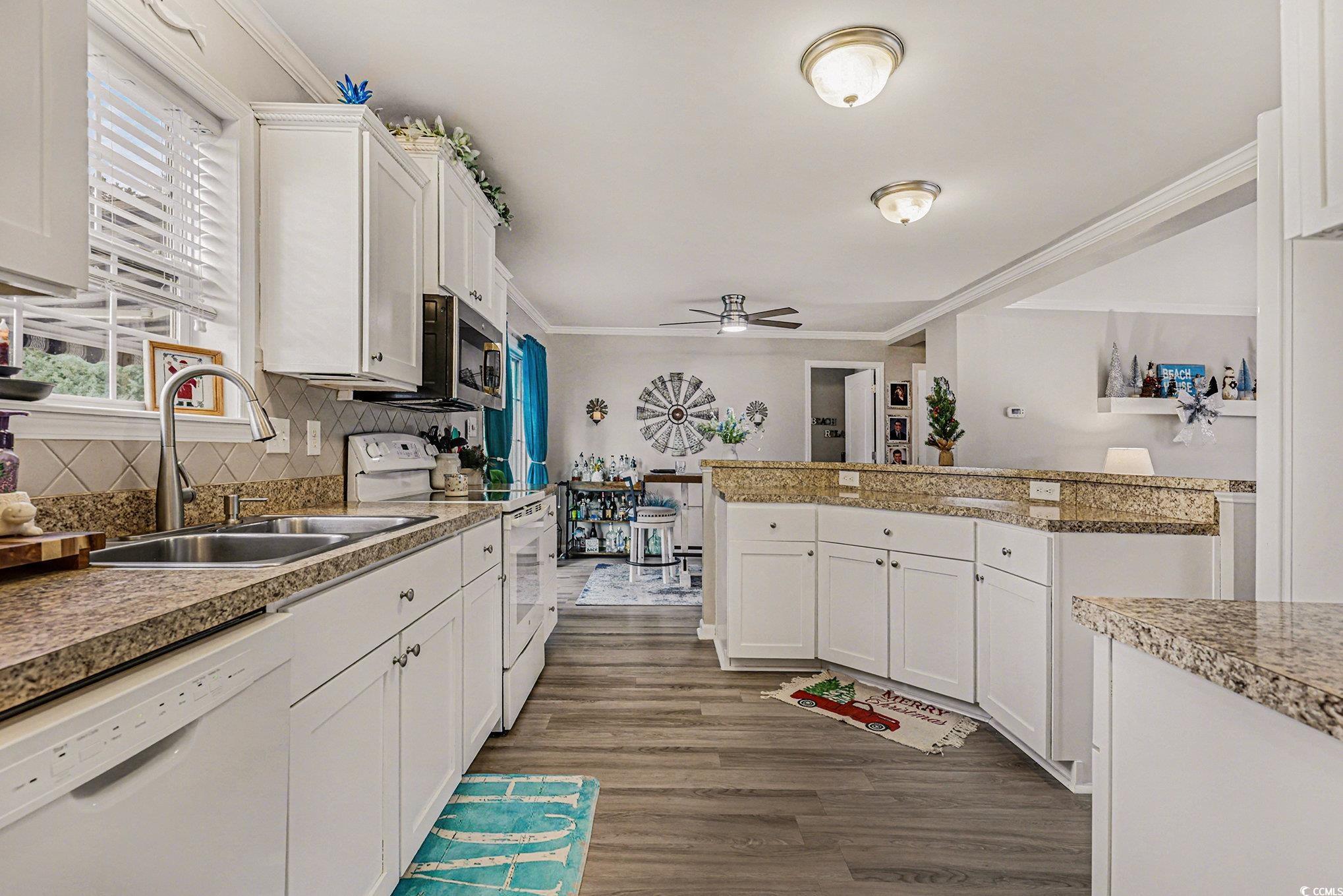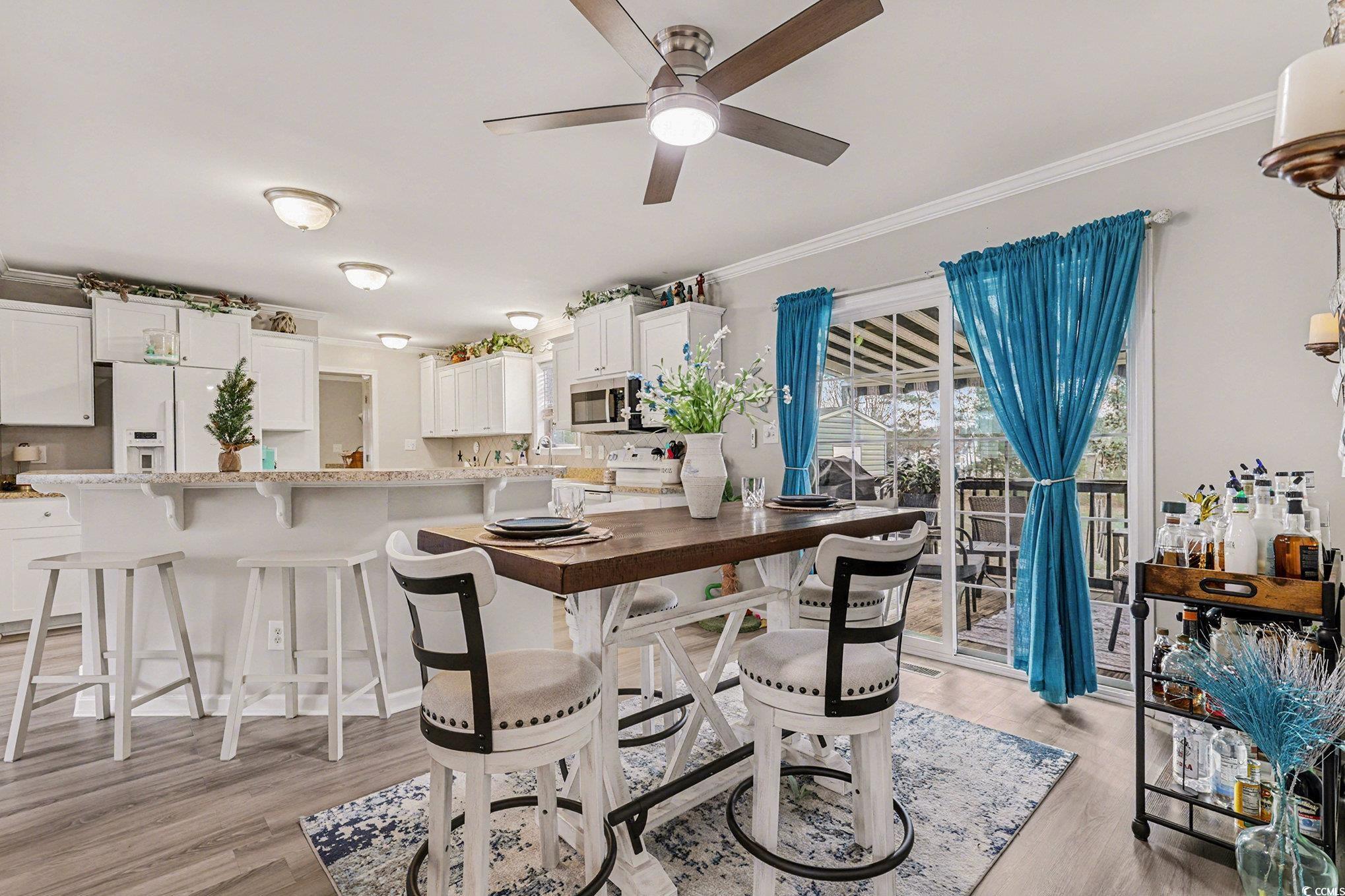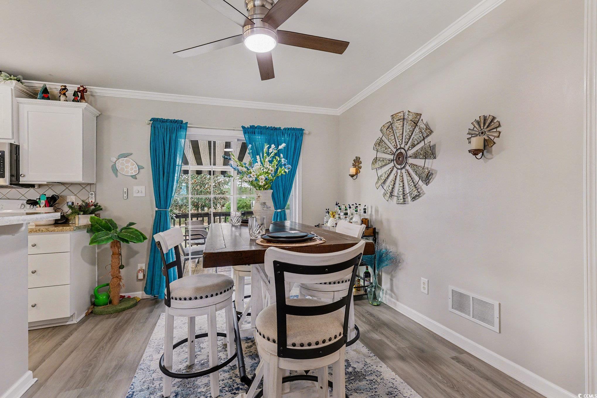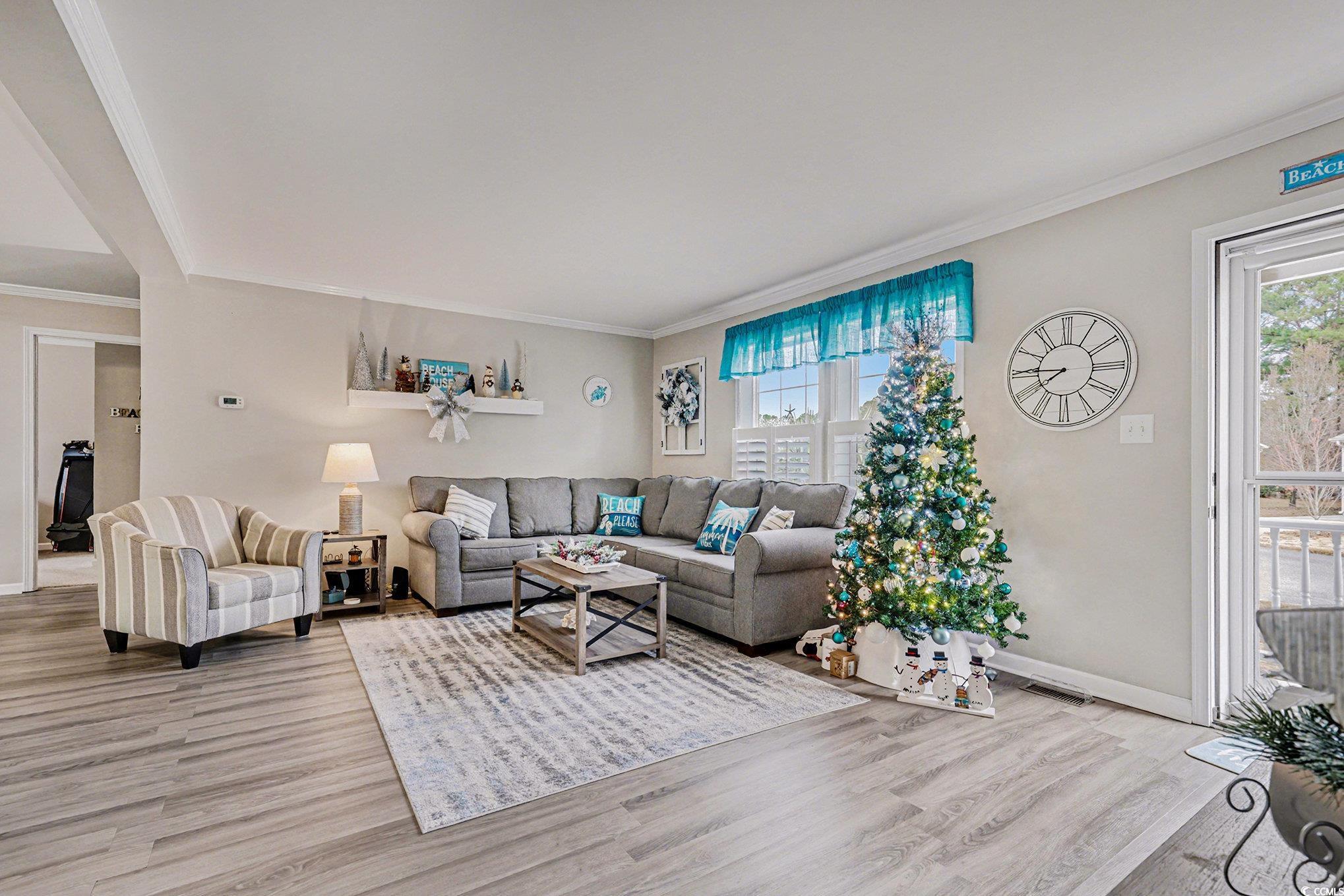 Welcome to this beautifully maintained 3-bedroom, 2-bathroom home located in the highly sought-after gated community of Country Lakes in Little River. Offering a blend of comfort, style, and low-maintenance living, this move-in-ready home is perfect as a primary residence, coastal getaway, or easy-living retirement retreat. The spacious living room is the heart of the home, showcasing beautiful natural light, modern flooring, and tasteful crown molding. Plantation shutters add a touch of charm while giving the room a clean, timeless look you’ll love coming home to. The kitchen is generously sized with ample cabinet space, a breakfast bar, and an open layout that flows seamlessly into the dining area. Sliding glass doors lead to the large back deck, complete with a retractable awning to enjoy outdoor living all year long. The primary suite is a peaceful retreat featuring a spacious bedroom, large windows, a walk-in closet, and an en-suite bathroom with a sink and vanity and step-in shower. Two additional bedrooms provide flexibility for guests, a home office, or hobby room. A separate laundry room with storage and a utility sink adds daily convenience. The private backyard also includes a detached storage shed, offering plenty of space for tools, beach gear, or hobbies. Country Lakes is known for its quiet, friendly atmosphere and fantastic amenities—including a community pool, gated entry, and beautifully maintained grounds—all just minutes to the Little River waterfront, Cherry Grove Beach, shopping, dining, and top-rated golf. Buyer is responsible for verifcation.