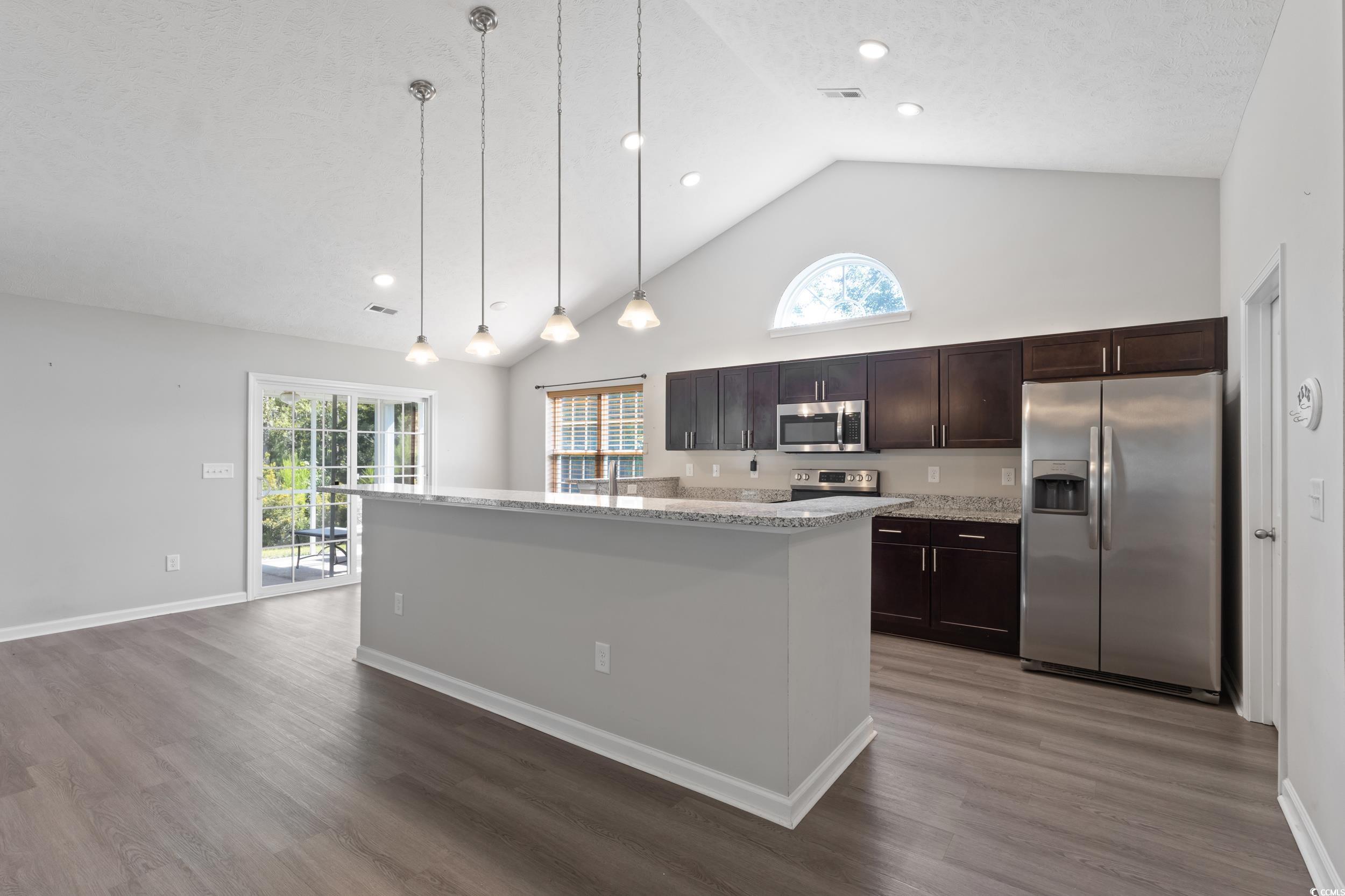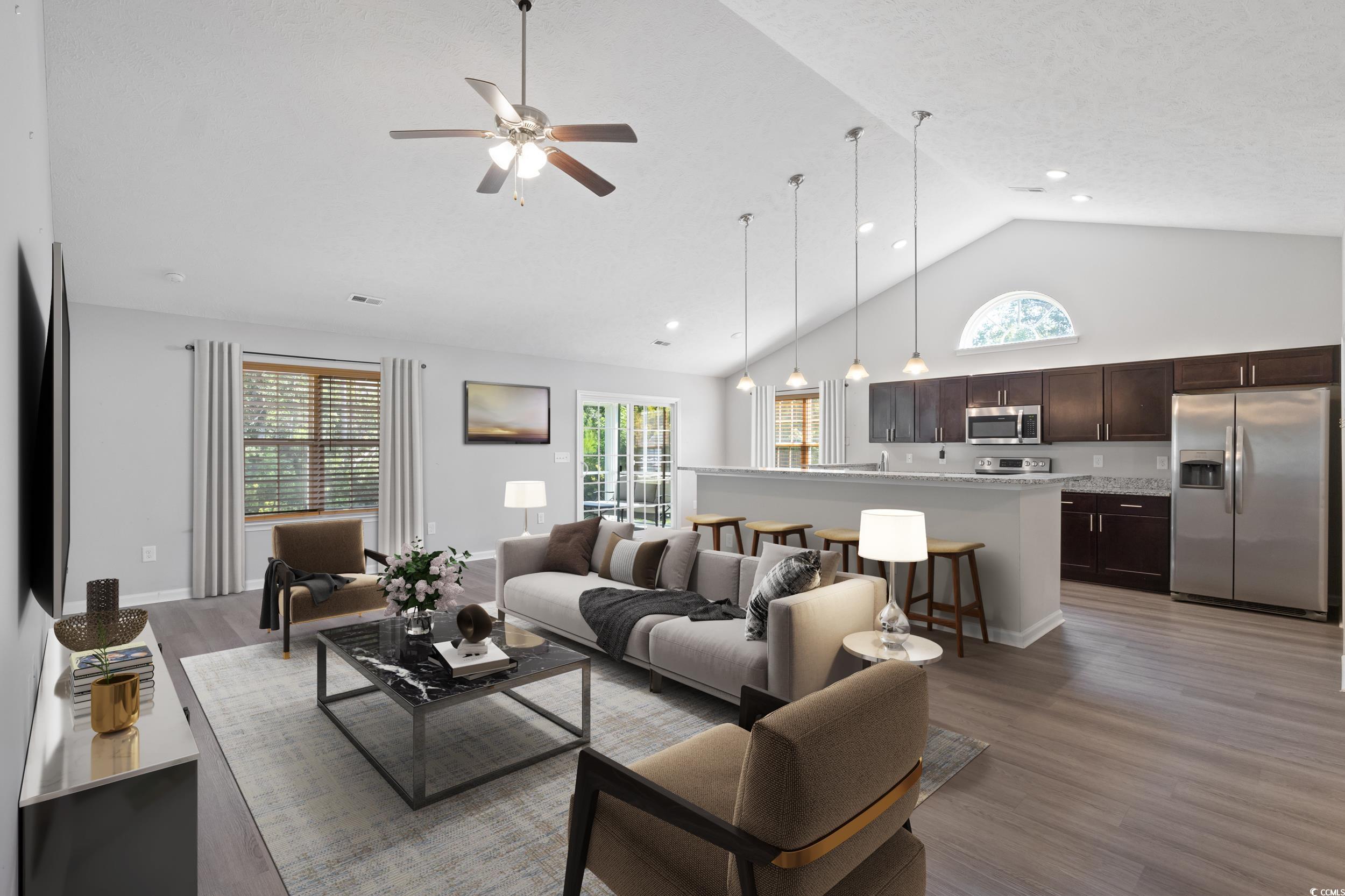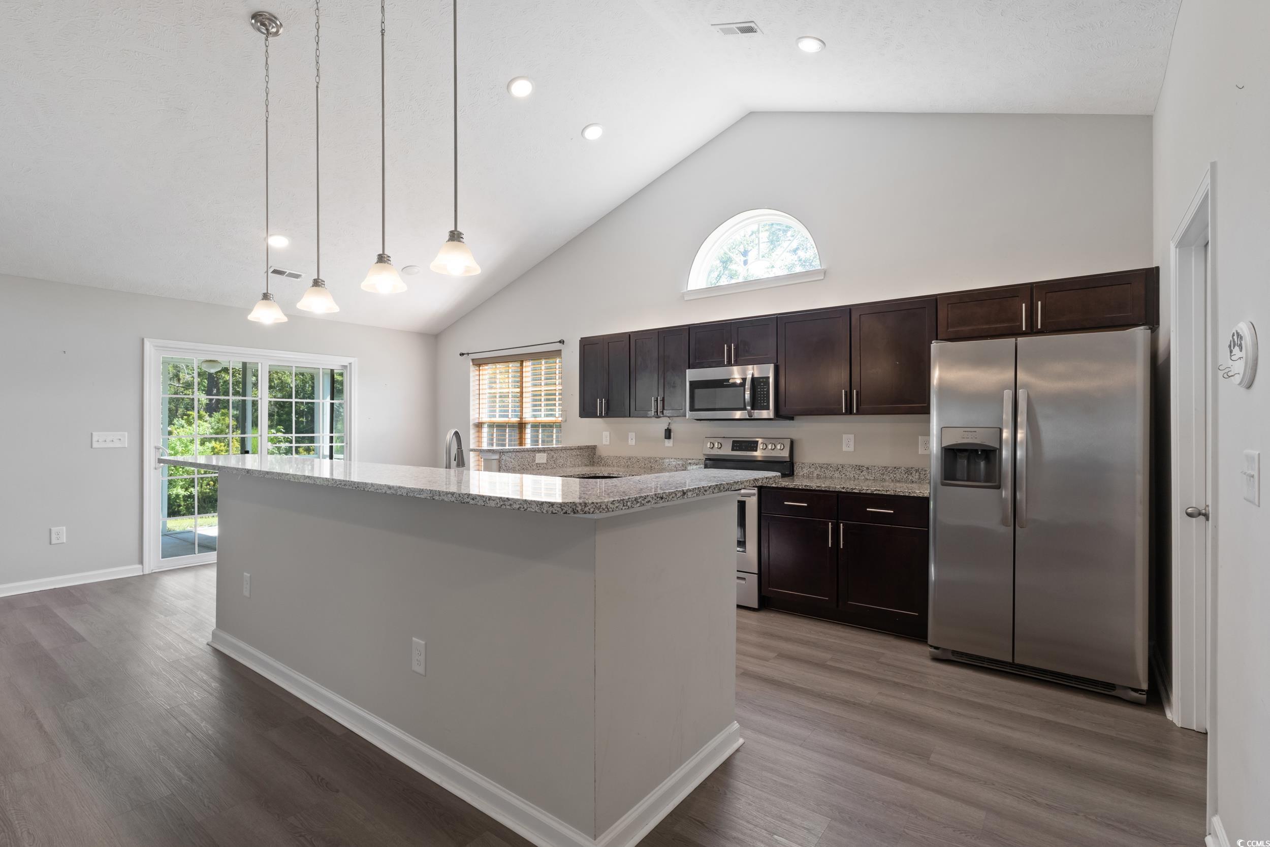 Welcome to this charming single level 3 bedroom, 2 bathroom home offering comfort, privacy, and thoughtful design. Tucked away with only one neighboring house, this property is surrounded by wooded serenity on the side and behind, creating a peaceful and private retreat. Step inside to a spacious open floor plan featuring beautiful LVP flooring and soaring cathedral ceilings that enhance the natural light pouring in through the abundant windows. The kitchen is a standout with stainless steel appliances, a large center island with seating for bar stools, and plenty of counter space for cooking and gathering. An eat-in kitchen area and a separate dining room provide flexibility for casual meals or formal entertaining. The primary bedroom is spacious with its own cathedral ceiling, primary bathroom and a generous walk-in closet. Two additional bedrooms provide flexibility for guests, a home office, or growing households. Enjoy outdoor living on the screened-in back porch plus additional patio area, ideal for relaxing while taking in the wooded views. Gutters are equipped with gutter guards as well for easy maintenance. A dedicated laundry room conveniently connects to the two car garage, which includes pull down attic stairs leading to a floored storage space for added convenience. This home blends comfort and functionality with a beautiful natural setting don’t miss the opportunity to make it yours.