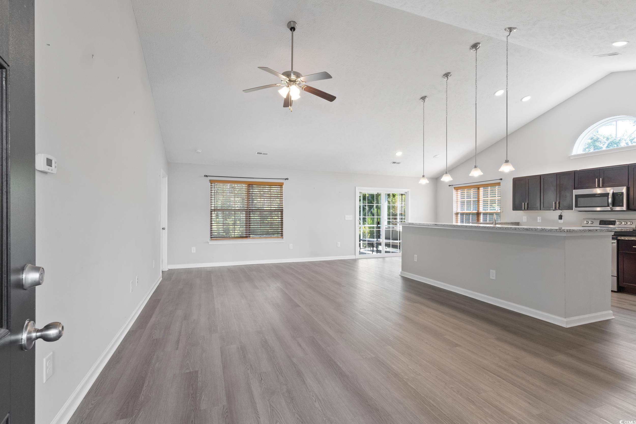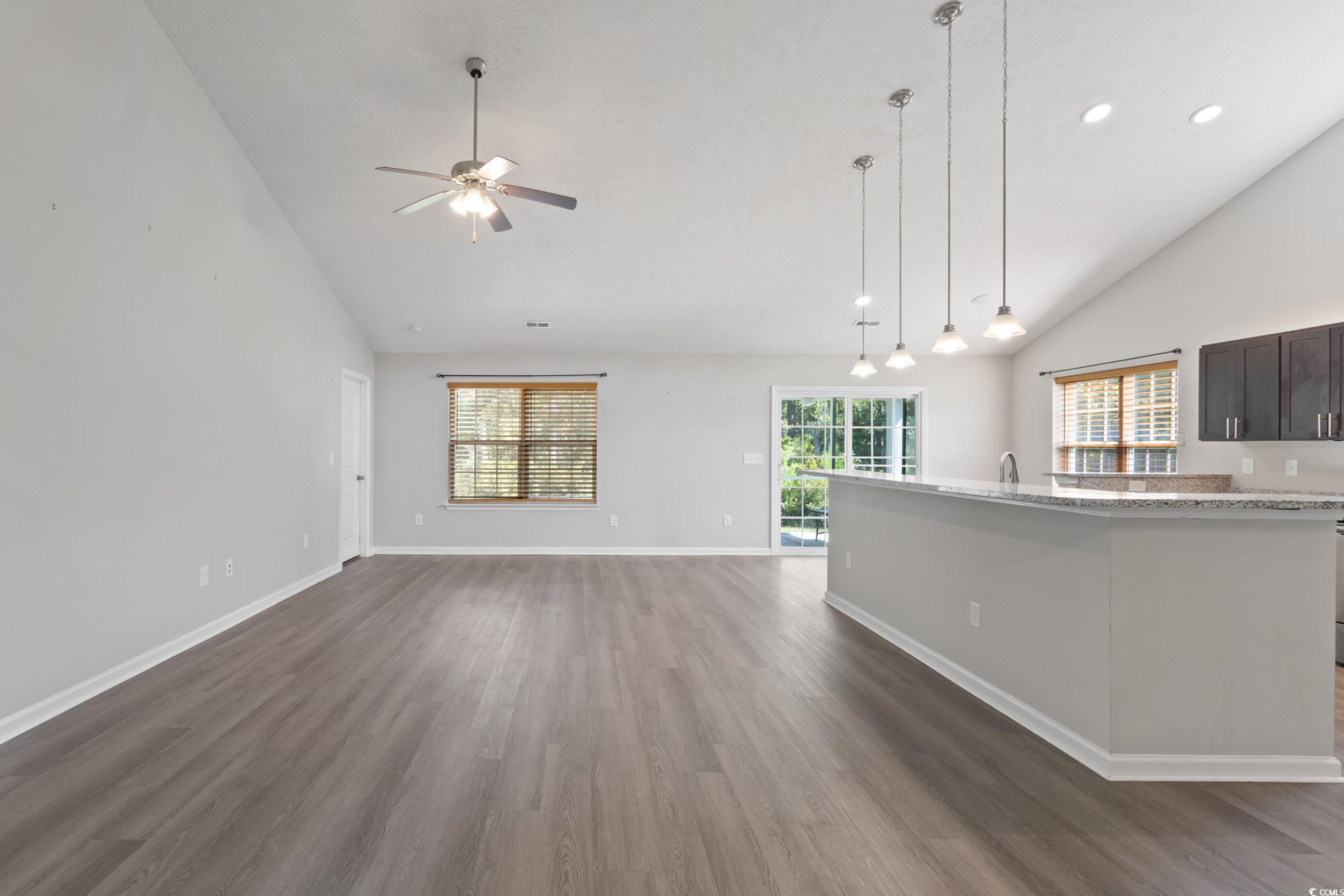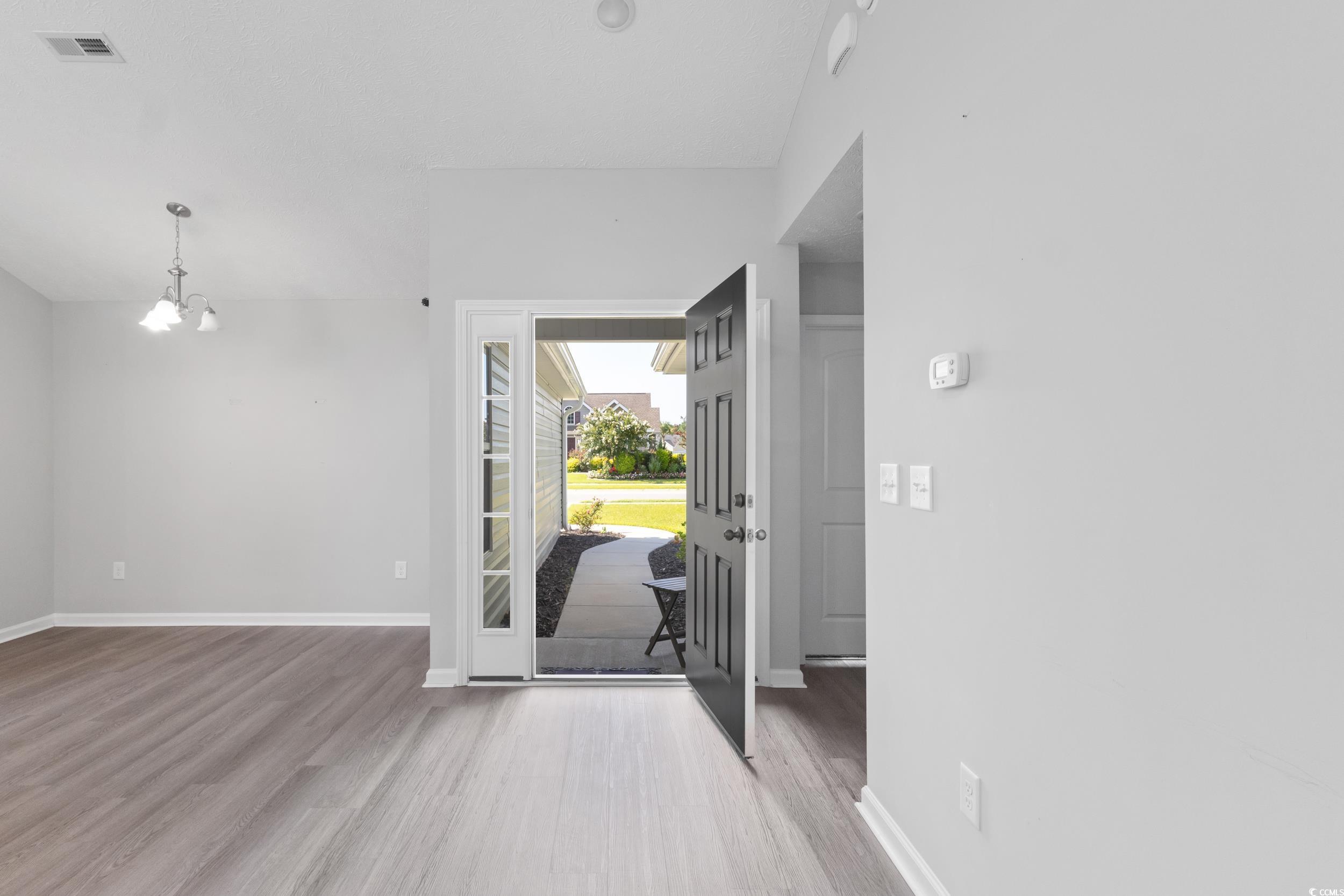 Welcome to this charming single level 3 bedroom, 2 bathroom home offering comfort, privacy, and thoughtful design. Tucked away with only one neighboring house, this property is surrounded by wooded serenity on the side and behind, creating a peaceful and private retreat. Step inside to a spacious open floor plan featuring beautiful LVP flooring and soaring cathedral ceilings that enhance the natural light pouring in through the abundant windows. The kitchen is a standout with stainless steel appliances, a large center island with seating for bar stools, and plenty of counter space for cooking and gathering. An eat-in kitchen area and a separate dining room provide flexibility for casual meals or formal entertaining. The primary bedroom is spacious with its own cathedral ceiling, primary bathroom and a generous walk-in closet. Two additional bedrooms provide flexibility for guests, a home office, or growing households. Enjoy outdoor living on the screened-in back porch plus additional patio area, ideal for relaxing while taking in the wooded views. Gutters are equipped with gutter guards as well for easy maintenance. A dedicated laundry room conveniently connects to the two car garage, which includes pull down attic stairs leading to a floored storage space for added convenience. This home blends comfort and functionality with a beautiful natural setting don’t miss the opportunity to make it yours.