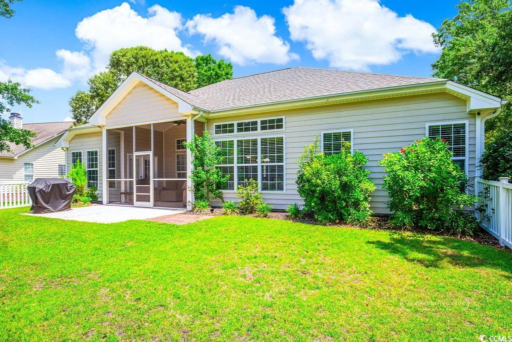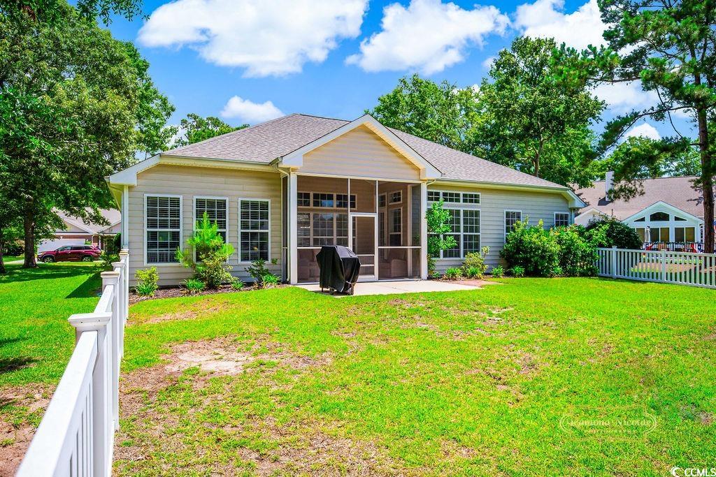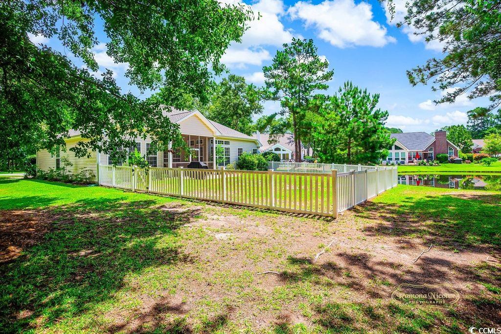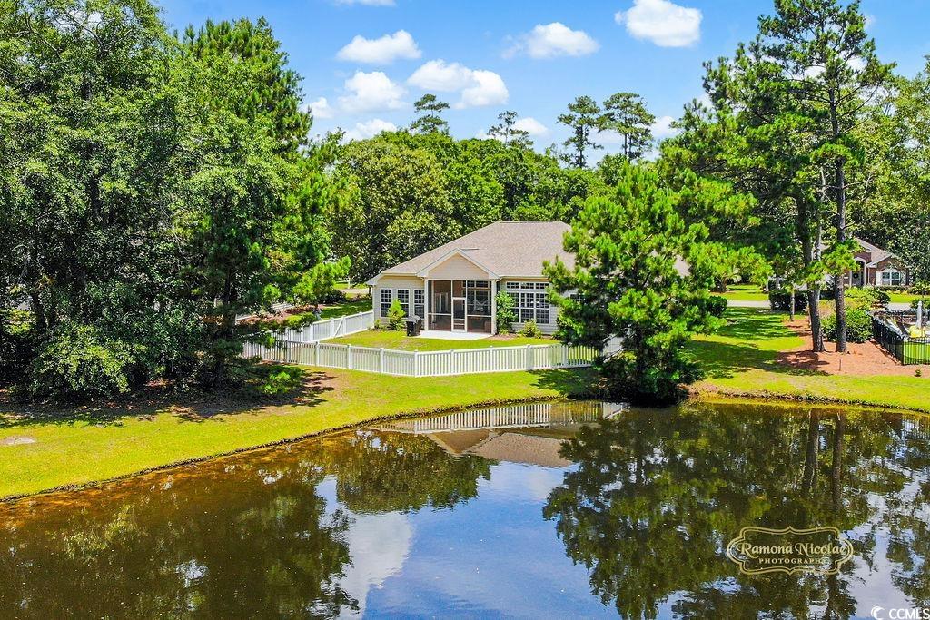 LAKE FRONT , PEACFUL & INVITING : This brick front, one-level, well-designed home in the Highly Desirable Wachesaw East Community features 4 Bedrooms and 2 Full Baths with an open floor plan that also offers privacy with the split bedroom design. Entering this bright and cheerful home you will take notice of the attractive EVP wood flooring that adds further splendor to the home . The large kitchen boasts gorgeous granite countertops & backsplash, stainless steel appliances with lots of cabinetry, corner pantry, breakfast bar and spacious breakfast nook extends seamlessly to the 19’ x 18’ Family Room with its soaring 10’vaulted, smooth ceiling. The Dining Room with Tray Ceiling and easy access from the kitchen, is located at the front of the home and is the perfect place for family gatherings or when entertaining friends. Large primary bedroom with tray ceiling & ceiling fan and enough room for a cozy sitting area or desk and there is access to the screen porch for your morning coffee. The en suite bathroom has double sinks, a walk in shower, soaking tub and a large 14 x 6 walk-in closet. The 3 Guest Bedrooms & Guest Bath are tucked on the other side of the home to offer a quiet retreat. Just off the kitchen, you will find the large and private screen porch with water views, a patio for cookouts and fenced in backyard. The oversized 2 car Carriage Style attached garage offers great convenience plus additional storage that is provided with pull-down steps to the generous space located above and plenty of additional parking for guests. Conveniently located in a24 hour secured gated community with amenities that include a pool, tennis/pickle ball courts, fitness center and walking/fitness trails throughout. This home is close to the Murrells Inlet Marshwalk, Huntington Beach State Park and Wacca Wache Marina. Don't miss this opportunity to make this stunning property your home! NEW ROOF , NEW HVAC COLD HOT HEAT PUMP , NEW COMFORT HEIGHT TOILETS .