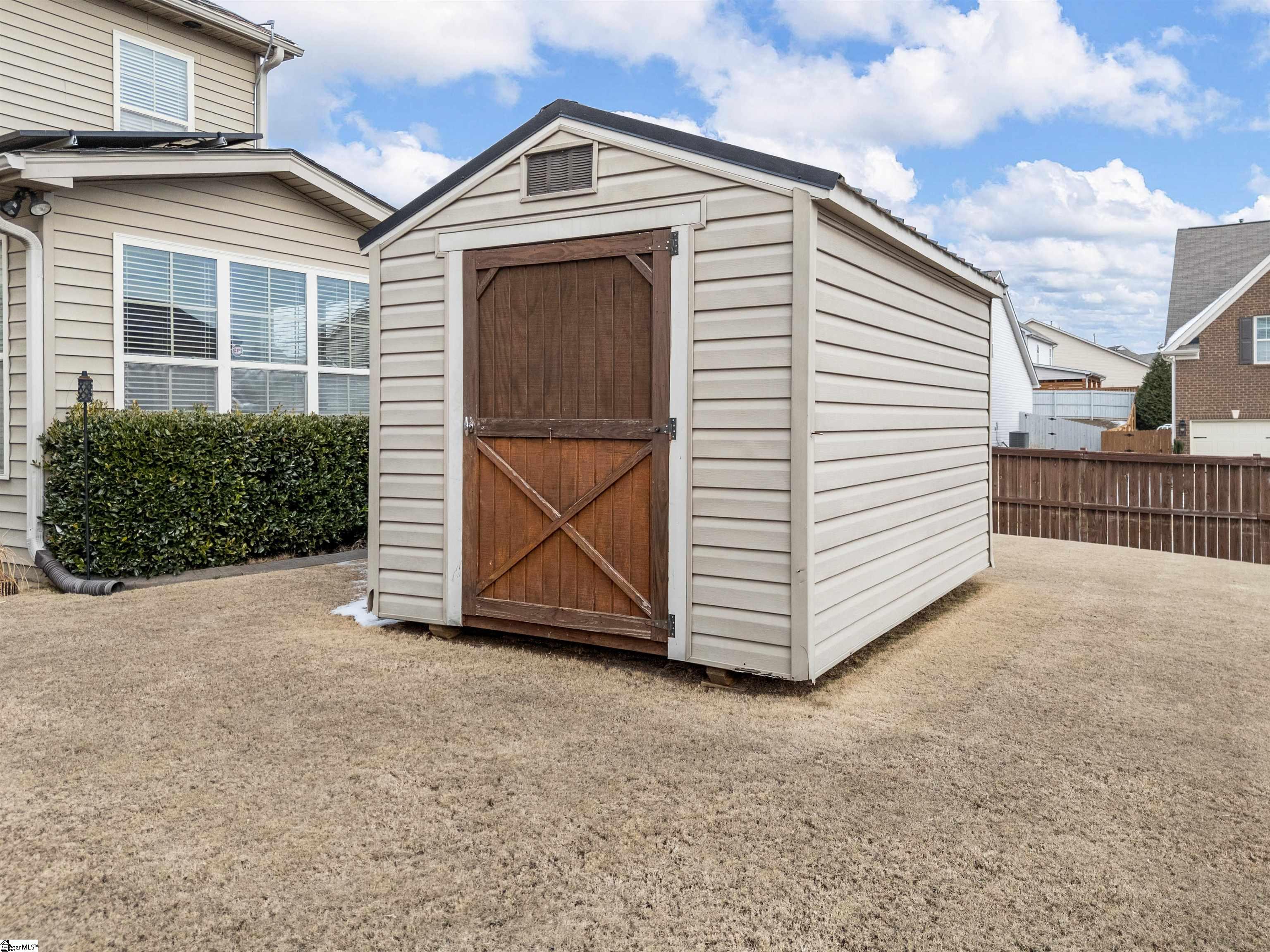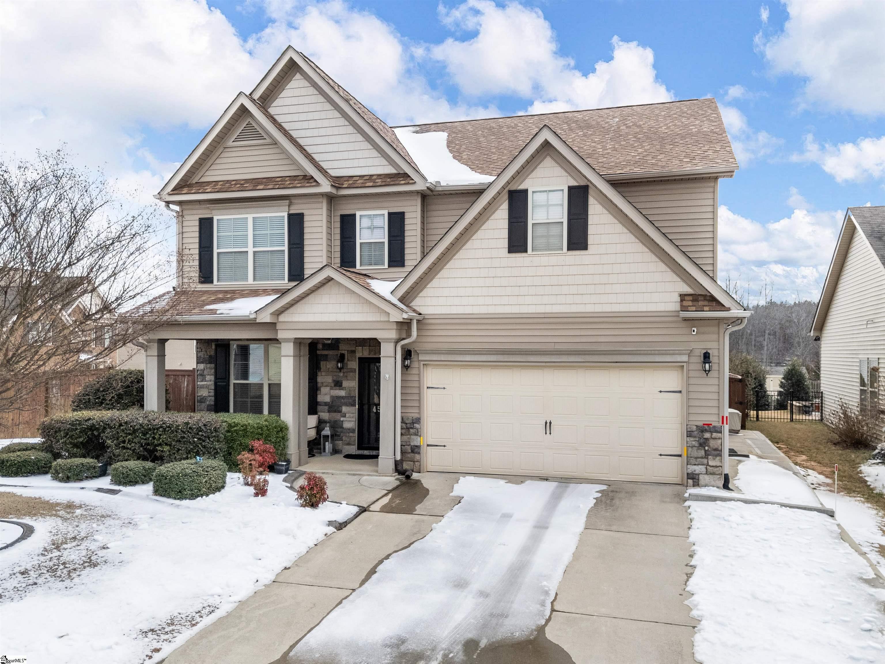 Welcome to 450 Bucklebury Road a beautiful five bedroom, four bathroom home in a prime location. The moment you enter from the front porch you’ll be greeted by a foyer that seamlessly integrates the living, dining, and kitchen areas. The kitchen is equipped with granite countertops, tile backsplash, stainless steel appliances (including a gas range), a pantry, and large center island. The breakfast area leads to a sunroom where you can access the backyard. There you will find an oversized concrete patio with a gas hook-up for your grill, storage building that conveys, and fenced in backyard. Back inside, The great room is open to the kitchen and includes a cozy corner fireplace with gas logs. Finishing out the main floor is a bedroom (Murphy bed will convey) and full bath that provides convenience for potential guest. On the second level you will find one bedroom that was used as a walk-in closet for the current owner and a full hall bath. Two additional spacious bedrooms provide comfort and share access to a full bathroom. The primary suite features a large bedroom area, en-suite bathroom with a tile shower, jetted tub, dual vanities, and walk-in closet. The walk-in laundry room is also located on the 2nd floor with close proximity to all bedrooms. The roof was replaced in 2025 and solar panels are owned, to help lower the cost of energy bills. This home is situated on an upgraded corner lot in Franklin Pointe, a highly desirable community where you'll enjoy access to the neighborhood pool, clubhouse, and playground. Conveniently located near BMW, GSP Airport, I-85, and just minutes from downtown Greer and Greenville. Don't miss out on all this lovely home has to offer!
