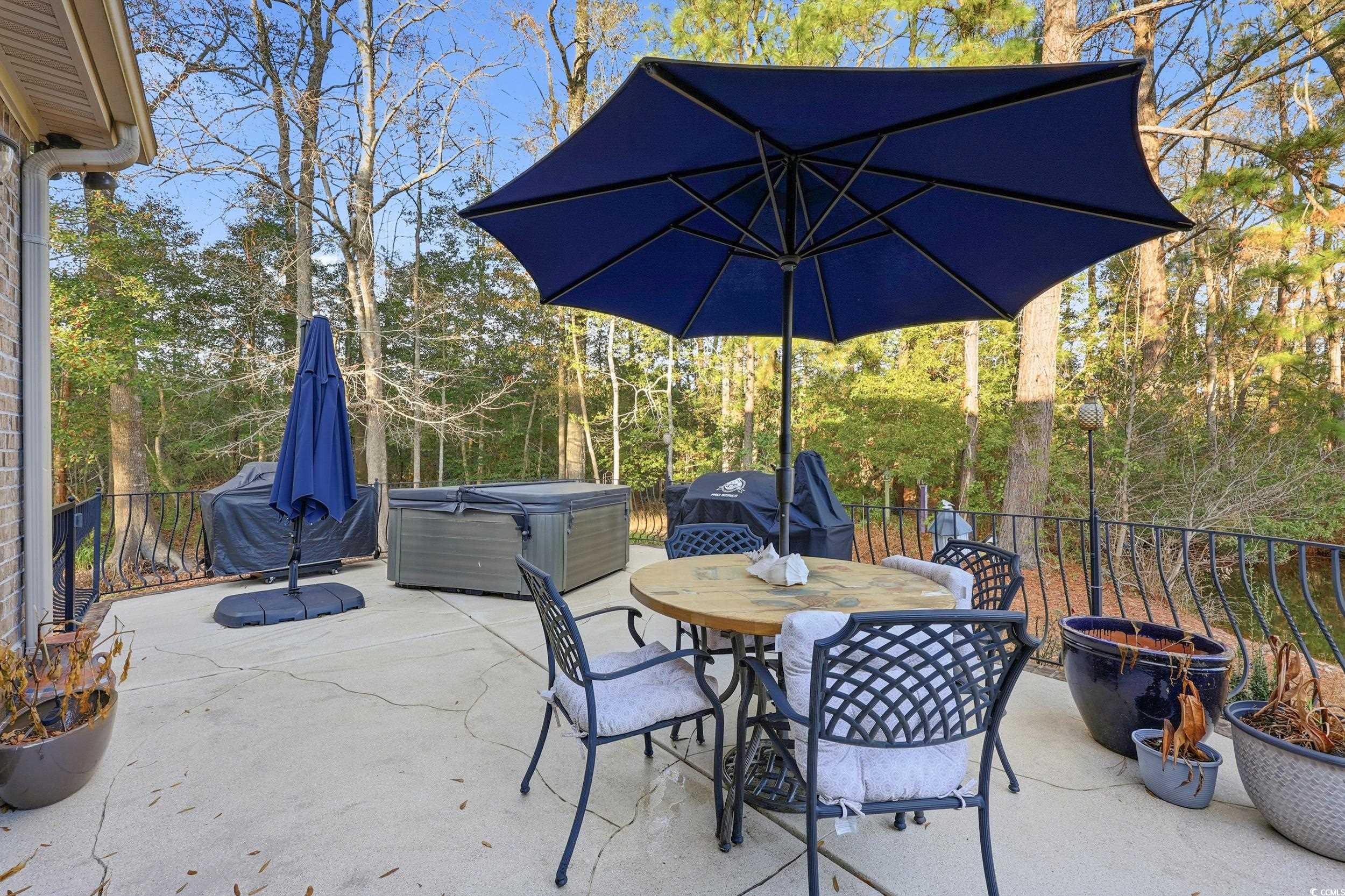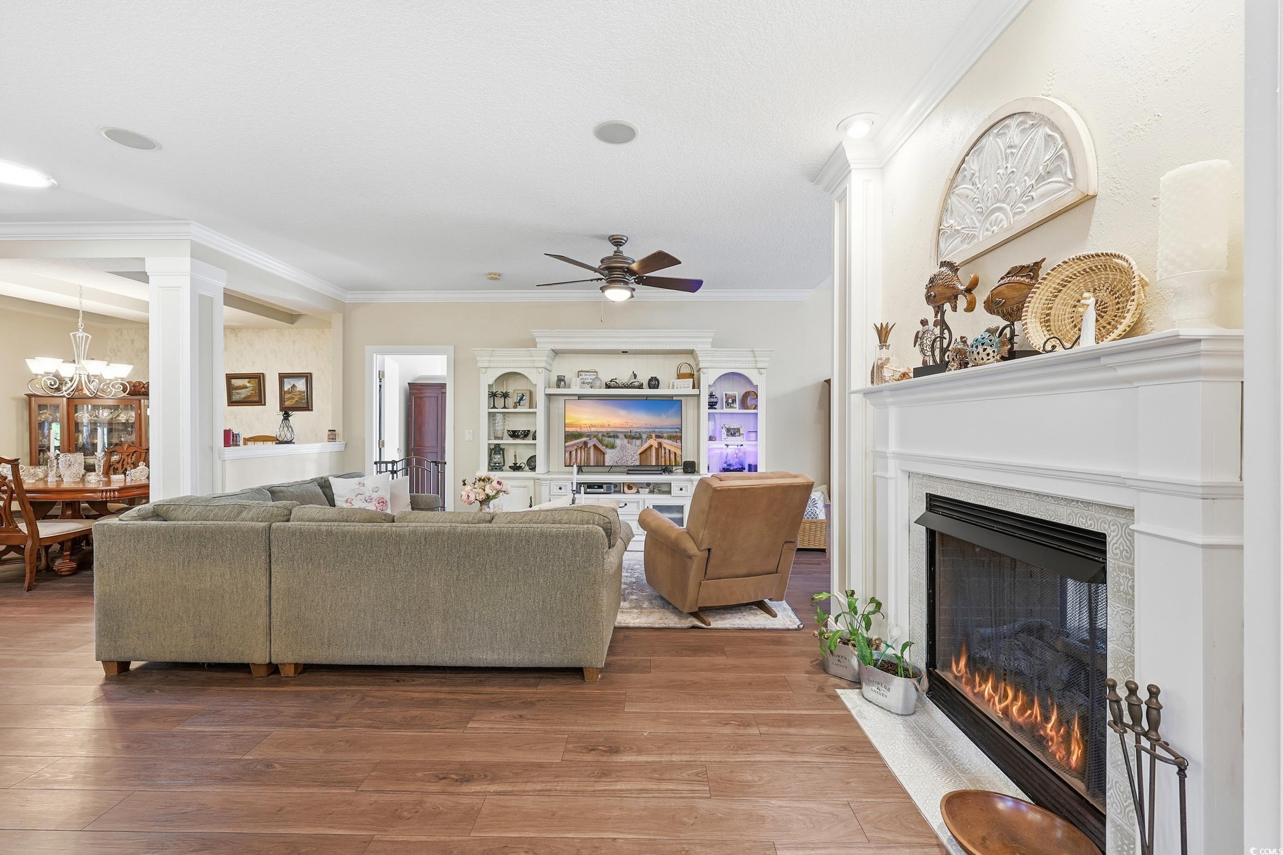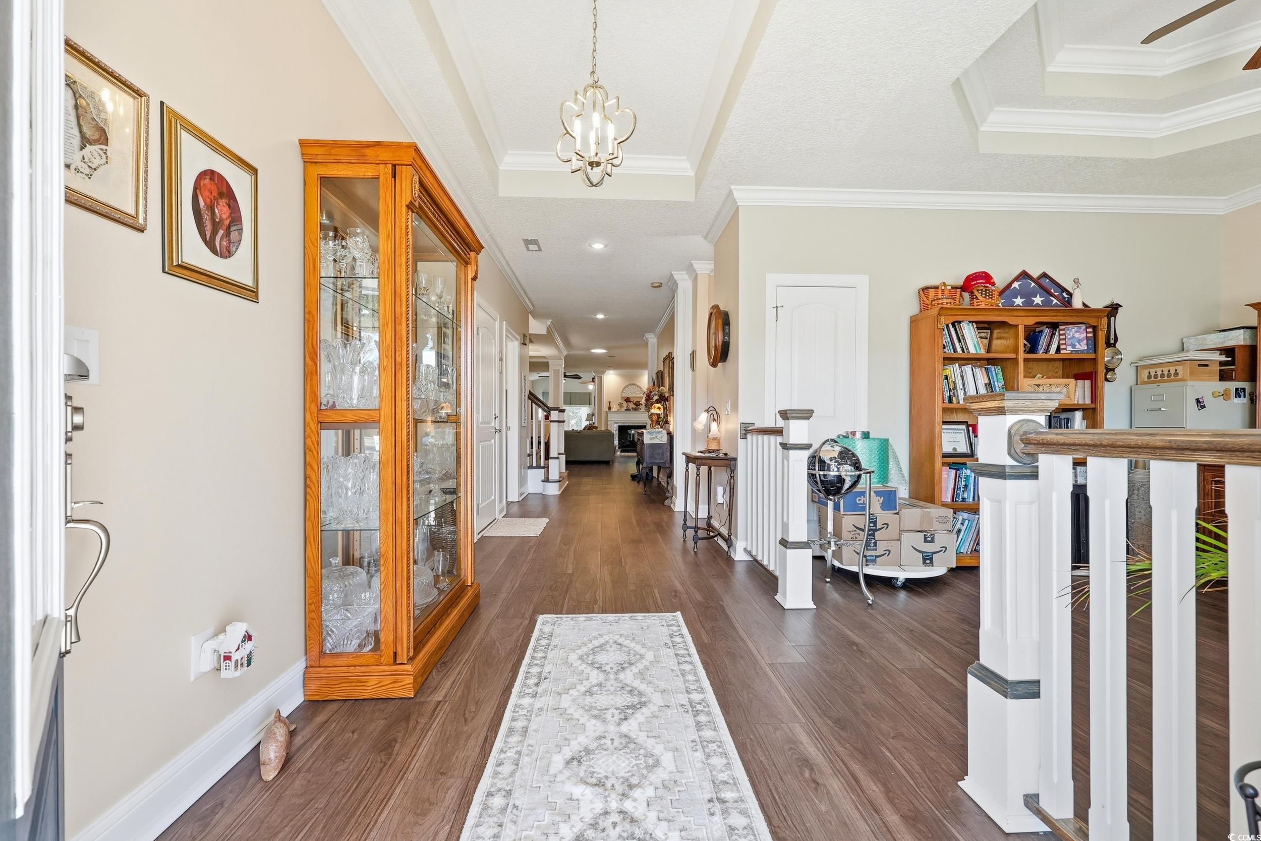 Set within the established Aberdeen Golf community, this all-brick four-bedroom, three-bath residence offers refined design, thoughtful upgrades, and a layout that balances everyday comfort with elevated living. From the moment you enter, the home makes a strong first impression with a tray ceiling in the foyer and crown molding that continues throughout, setting a polished tone carried through every space. The front sitting room is ideal as a home office or quiet retreat and it features an eye-catching octagon-shaped coffered ceiling, while the formal dining room is enhanced with its own coffered detailing and chandelier, creating a sense of architectural depth and distinction. Throughout the home, Levolor blinds provide a clean, tailored finish on every window, and natural light flows easily through the open layout. At the center of the home, the kitchen is designed for both function and presence, featuring staggered custom cabinetry, a large L-shaped island, solid-surface countertops, and stainless steel appliances, including a gas double-oven 6 burner GE Café range. Whether preparing meals or entertaining, the space connects seamlessly to the living room and Carolina room, where views of the pond draw your attention outdoors. Outdoor living is thoughtfully designed with two separate rear patio spaces, one on each side of the home that are both accessible from the Carolina room and positioned to capture warm afternoon sunlight or there left and peaceful pond views on the right. These spaces provide flexibility for relaxing, dining, or hosting, all framed by a whole-house exterior irrigation system that maintains the landscaped setting. The primary suite offers a private retreat with a tray ceiling, generous his and hers walk-in closet, and a well-appointed bath featuring dual vanities and a walk-in shower with built-in jets. A main-level guest bath also includes a tiled walk-in shower, providing comfort and convenience for visitors. Upstairs, additional bedrooms, a full bath, a loft, and a spacious bonus room allow the home to adapt to a variety of lifestyles and needs. Additional highlights include an oversized two-car garage with the ability to park a golf cart, a heated and cooled enclosed attached storage room on the side of the home that's ideal for storage of lawn equipment, hobbies, or seasonal use and the durability and timeless appeal of full brick construction. Located within a scenic golf community known for its preserved natural surroundings, this home also offers convenient access to beaches, dining, shopping, entertainment, and everyday essentials. The result is a residence that feels both refined and livable, offering a lifestyle defined by quality, comfort, and thoughtful design.
