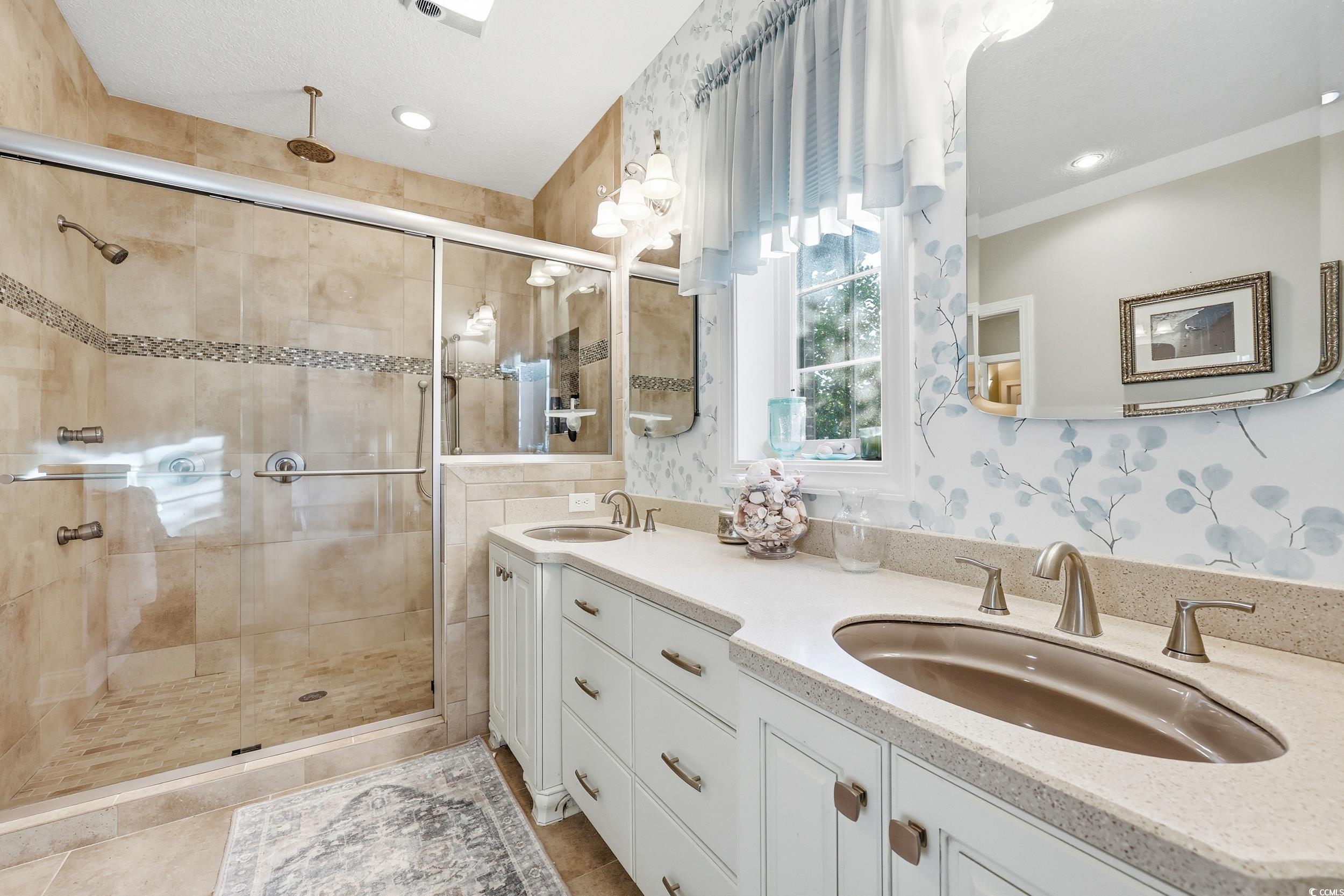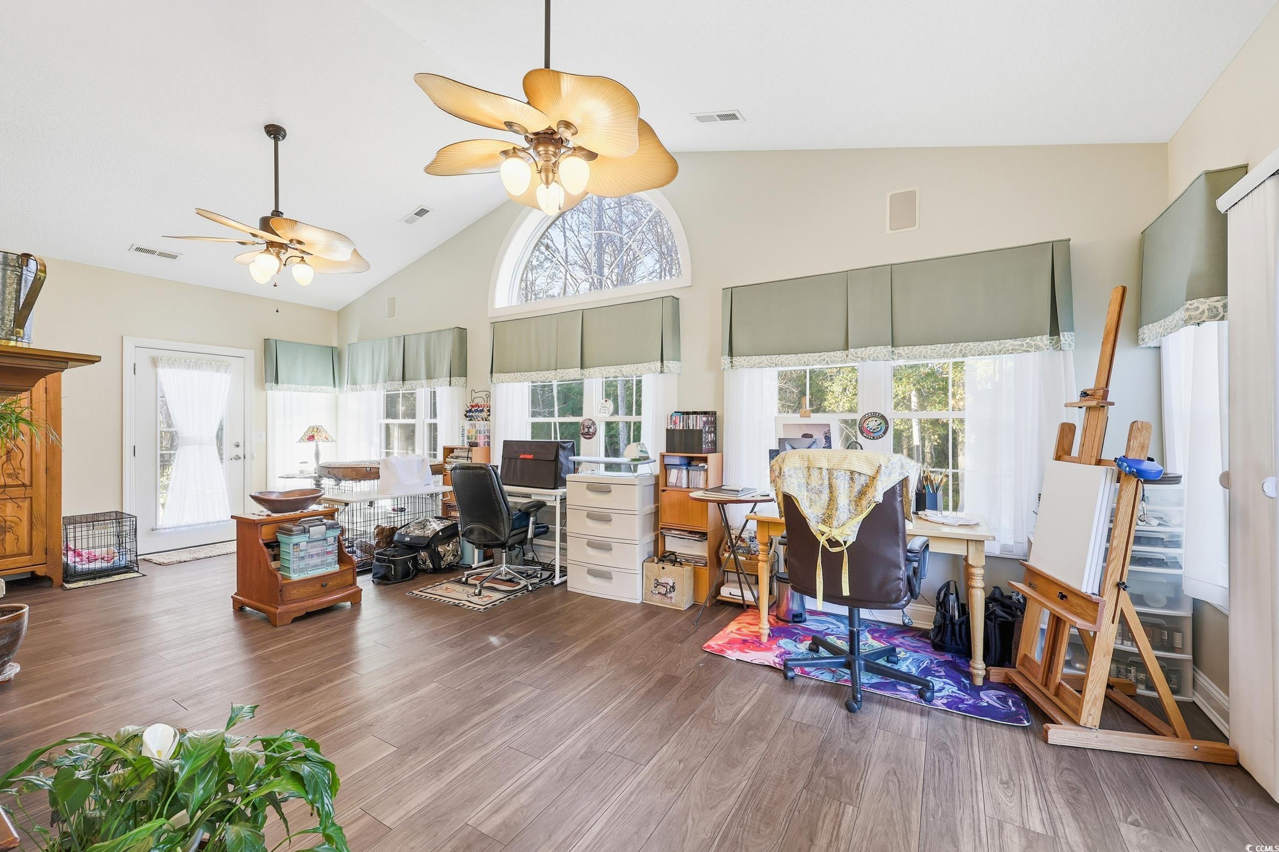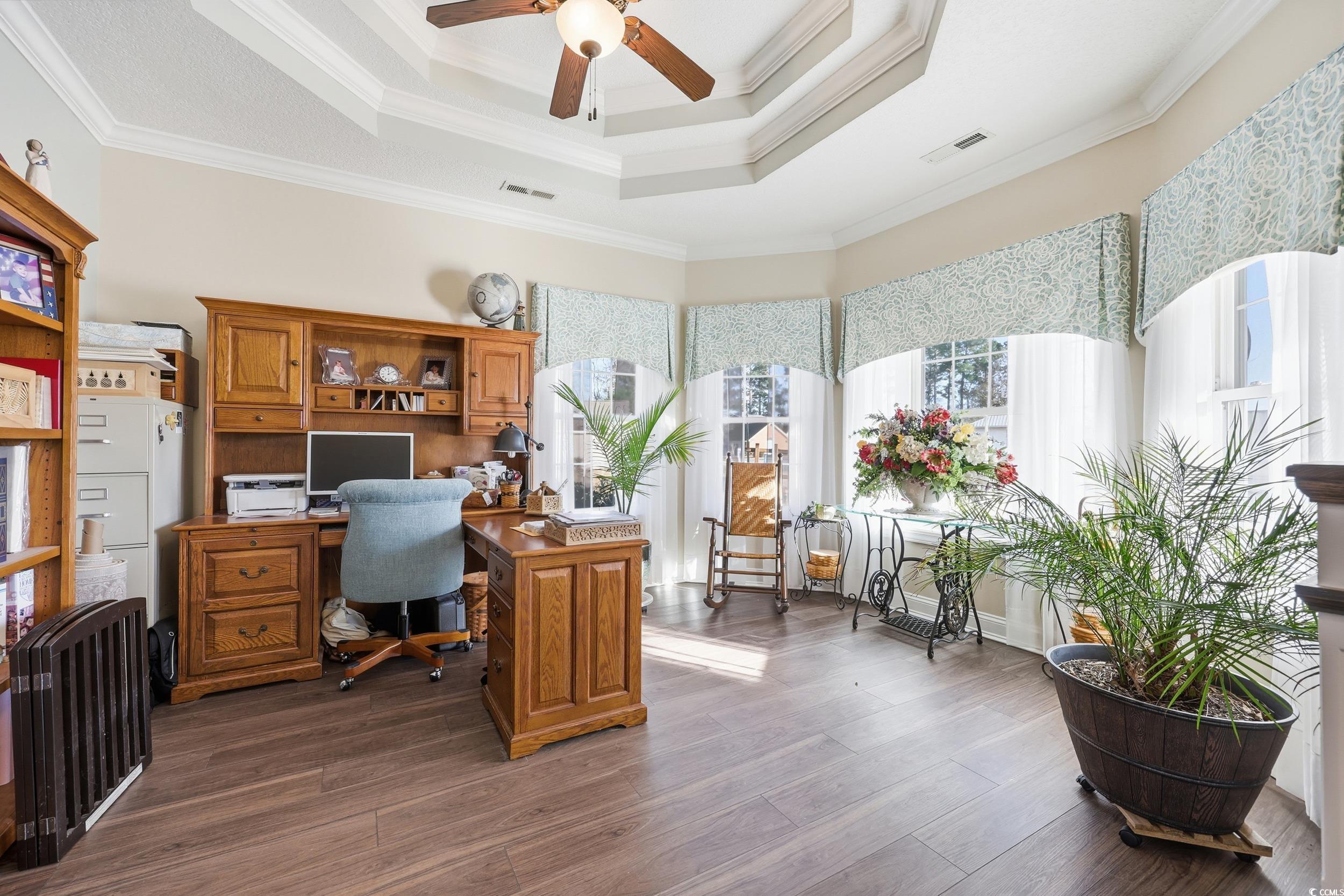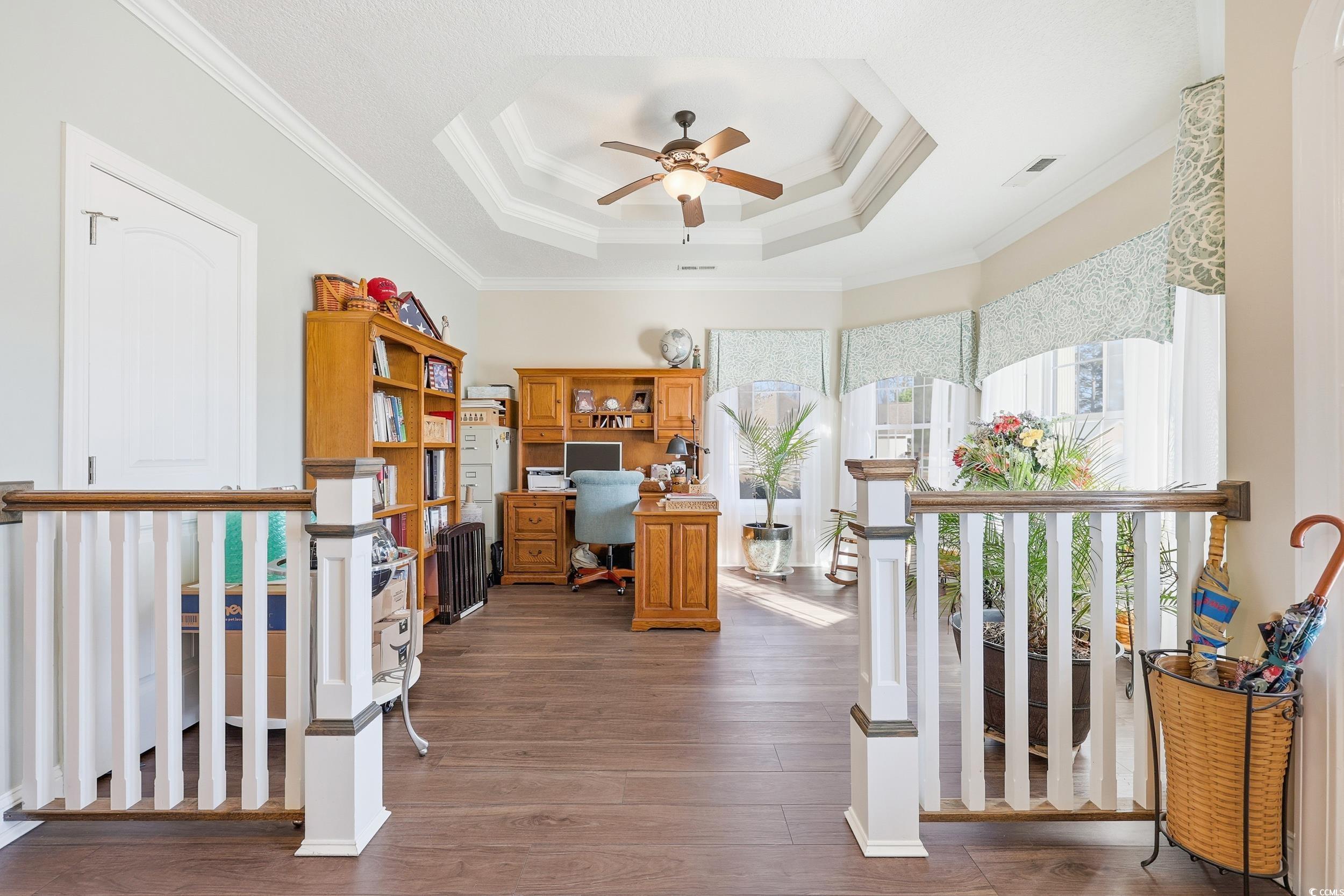Set within the established Aberdeen Golf community, this all-brick four-bedroom, three-bath residence offers refined design, thoughtful upgrades, and a layout that balances everyday comfort with elevated living. From the moment you enter, the home makes a strong first impression with a tray ceiling in the foyer and crown molding that continues throughout, setting a polished tone carried through every space. The front sitting room is ideal as a home office or quiet retreat and it features an eye-catching octagon-shaped coffered ceiling, while the formal dining room is enhanced with its own coffered detailing and chandelier, creating a sense of architectural depth and distinction. Throughout the home, Levolor blinds provide a clean, tailored finish on every window, and natural light flows easily through the open layout. At the center of the home, the kitchen is designed for both function and presence, featuring staggered custom cabinetry, a large L-shaped island, solid-surface countertops, and stainless steel appliances, including a gas double-oven 6 burner GE Café range. Whether preparing meals or entertaining, the space connects seamlessly to the living room and Carolina room, where views of the pond draw your attention outdoors. Outdoor living is thoughtfully designed with two separate rear patio spaces, one on each side of the home that are both accessible from the Carolina room and positioned to capture warm afternoon sunlight or there left and peaceful pond views on the right. These spaces provide flexibility for relaxing, dining, or hosting, all framed by a whole-house exterior irrigation system that maintains the landscaped setting. The primary suite offers a private retreat with a tray ceiling, generous his and hers walk-in closet, and a well-appointed bath featuring dual vanities and a walk-in shower with built-in jets. A main-level guest bath also includes a tiled walk-in shower, providing comfort and convenience for visitors. Upstairs, additional bedrooms, a full bath, a loft, and a spacious bonus room allow the home to adapt to a variety of lifestyles and needs. Additional highlights include an oversized two-car garage with the ability to park a golf cart, a heated and cooled enclosed attached storage room on the side of the home that's ideal for storage of lawn equipment, hobbies, or seasonal use and the durability and timeless appeal of full brick construction. Located within a scenic golf community known for its preserved natural surroundings, this home also offers convenient access to beaches, dining, shopping, entertainment, and everyday essentials. The result is a residence that feels both refined and livable, offering a lifestyle defined by quality, comfort, and thoughtful design.