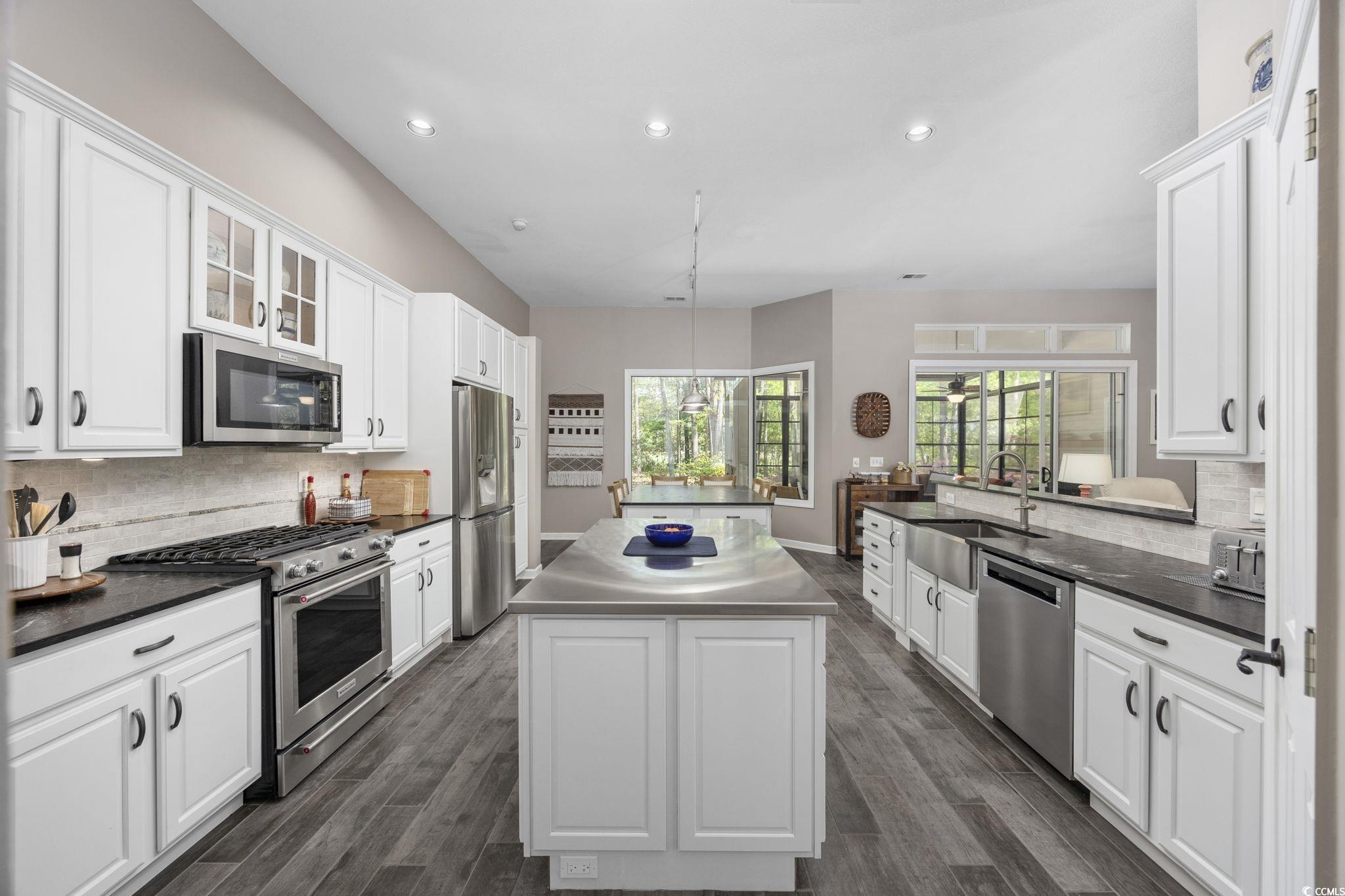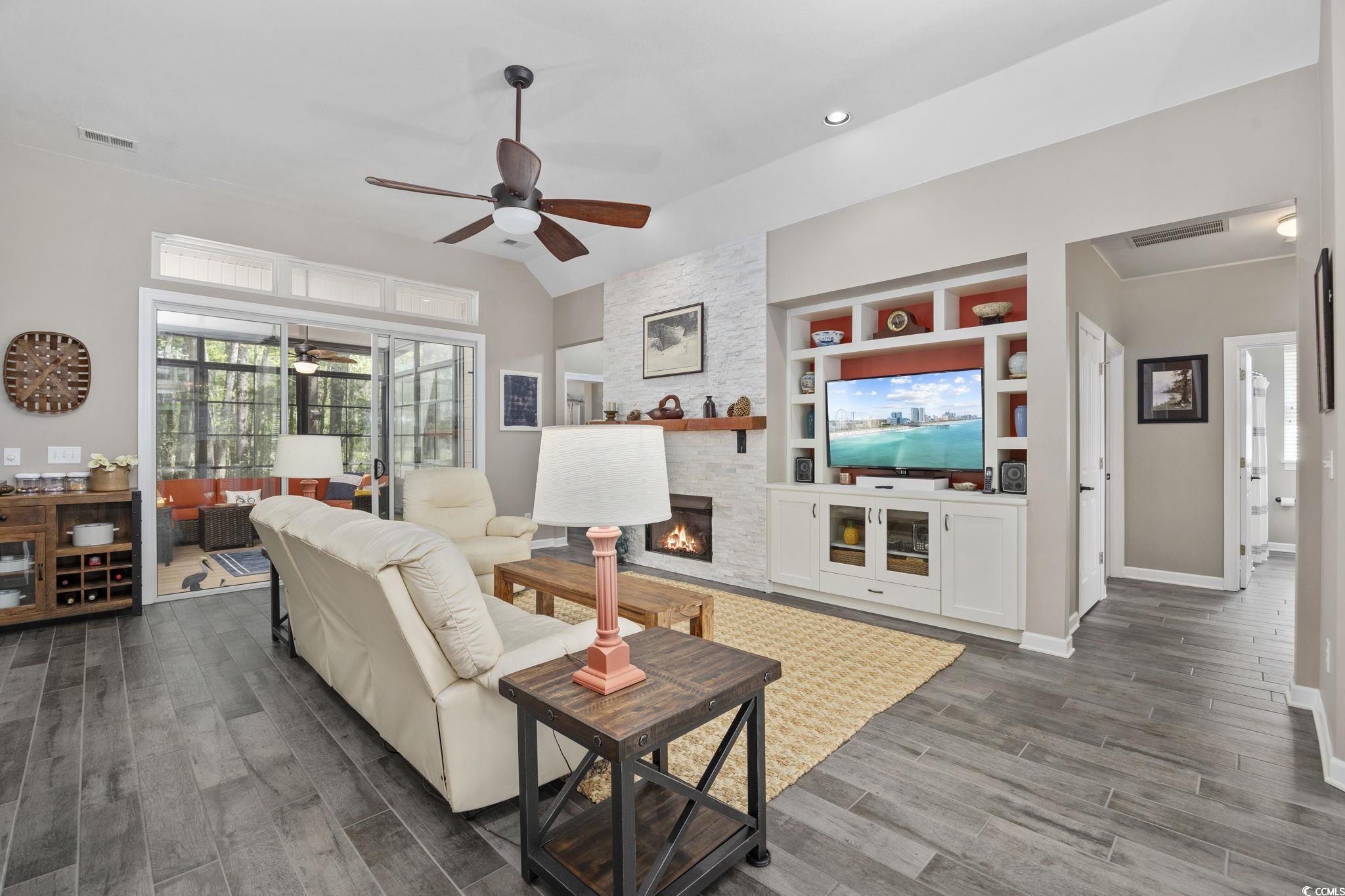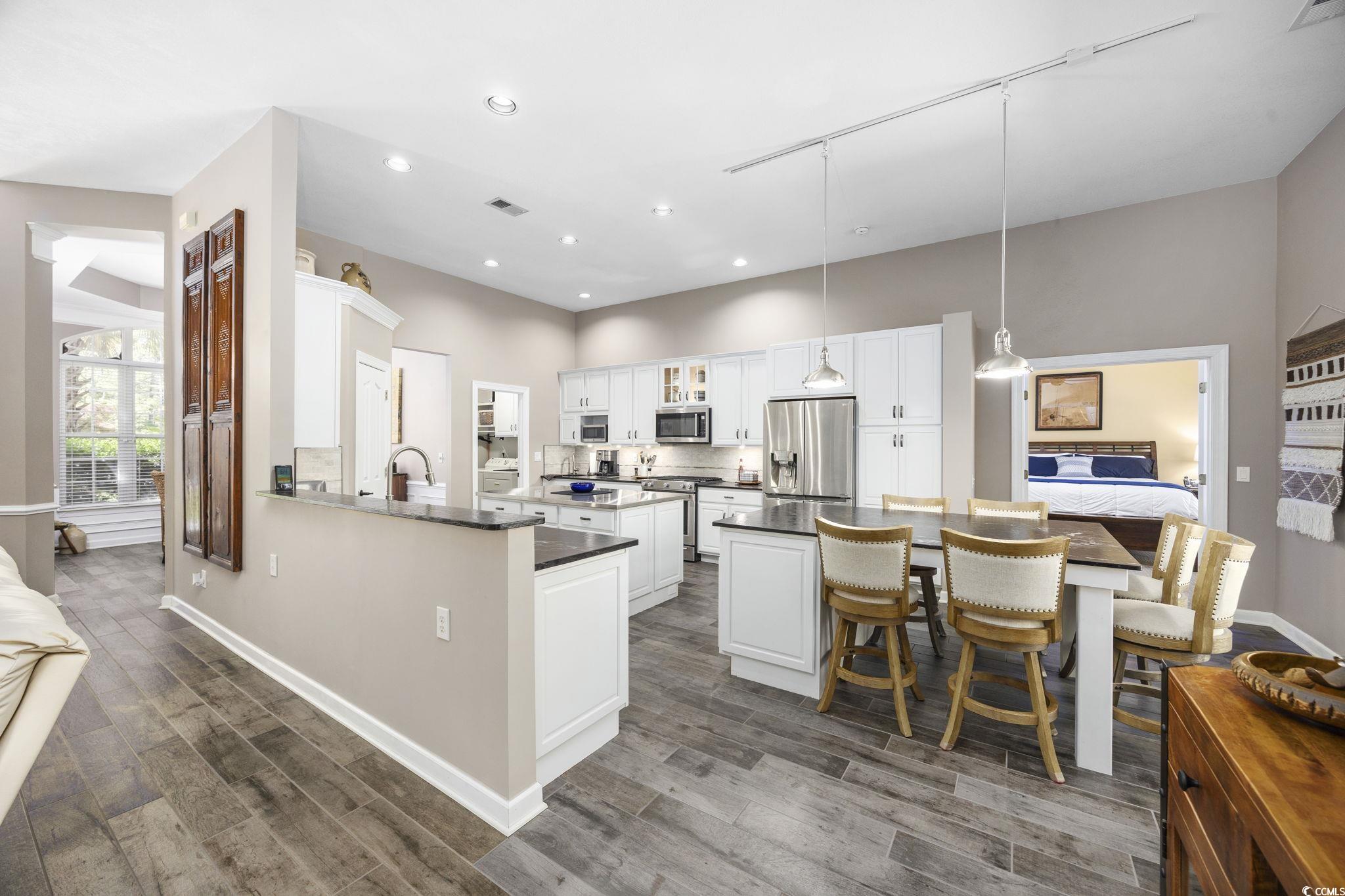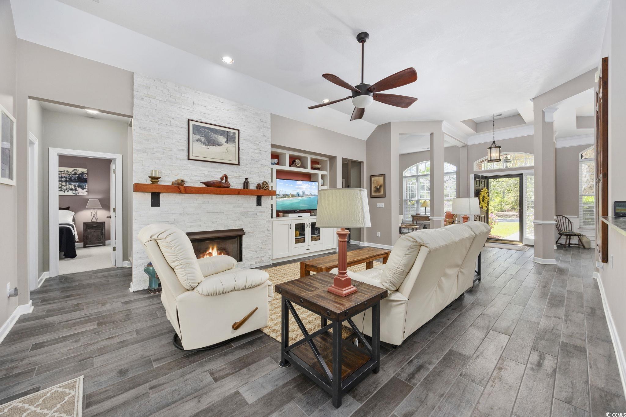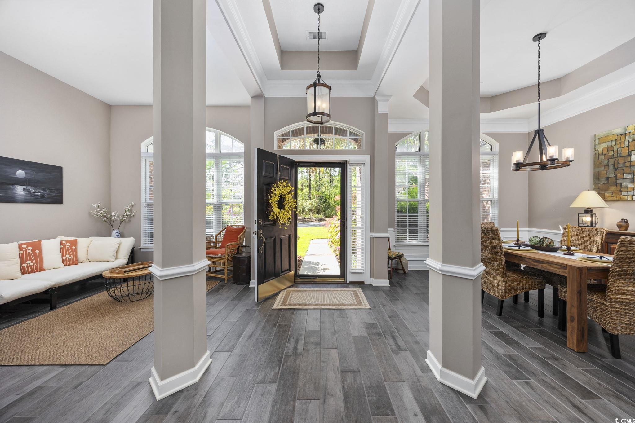 Large home on a meticulously landscaped lot! Located in coveted, Wachesaw Plantation East, a gated community in Murrells Inlet, perched on a generous sized lot, this home offers serene privacy as well as golf course & pond views. The current owners have lovingly updated this home using high quality materials. Inside, the open flow of this stunning floorplan lends itself to effortless entertaining and owner-suite privacy. The oversized kitchen has an abundance of prep space, custom wood cabinets w/ pullouts plus newer stainless steel appliances and gas for cooking! Commune with nature as you relax in the light and airy sunroom addition! The updates are too numerous to list here so be sure to view the virtual tour. Upstairs, find a large room with private bath as potential second Primary or guest suite, media room, etc. Wachesaw East community features: 24-7 uniformed security, HTC Fiber Optics recently installed offering High speed cable & Internet. Surrounded by a beautiful, affordable golf course, walking /fitness trails throughout, 2 pools, tennis courts and workout room. PRIME Location:1 mile to the famous Murrell's Inlet Marshwalk, or 1 mi. out the back gate to the marina on the Intercoastal waterway with public boat landings. Close to the pristine beaches of Huntington State Park, Brookgreen Gardens, Hospital and shopping.