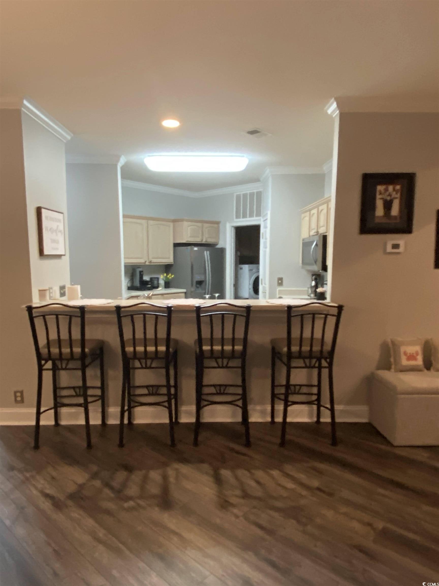 Must see this stunning, bright and airy golf villa located in the highly desirable Grand Villas at Wachesaw Plantation East! Tastefully updated with modern finishes from the LVP flooring to the 12 foot ceilings & soaring windows, clad with new plantation shutters! The flow of the open floorplan in this one-level villa allows for entertaining with ease and elegance. Kitchen has newer appliances and all convey with the sale, including pedestal washer & dryer. This villa is one of the larger floorplans with a spacious primary bedroom and two additional bedrooms, a screened porch and patio overlooking the second fairway. Attached, private, oversized 2 car garage also has a utility room with shelving. Community amenities include pool, tennis courts (+pickleball), miles of walking-fitness paths, fitness room and 24 hour security guard at gate. All exterior maintenance, pest control & insurance are included in HOA dues. Location is unbeatable: close to famous Murrells Inlet Marshwalk, Hospital, many medical providers, grocery store within a mile, Huntington State Park with its pristine natural beach and nationally acclaimed Brookgreen Gardens! Come, live the dream and embrace the Low Country Lifestyle!