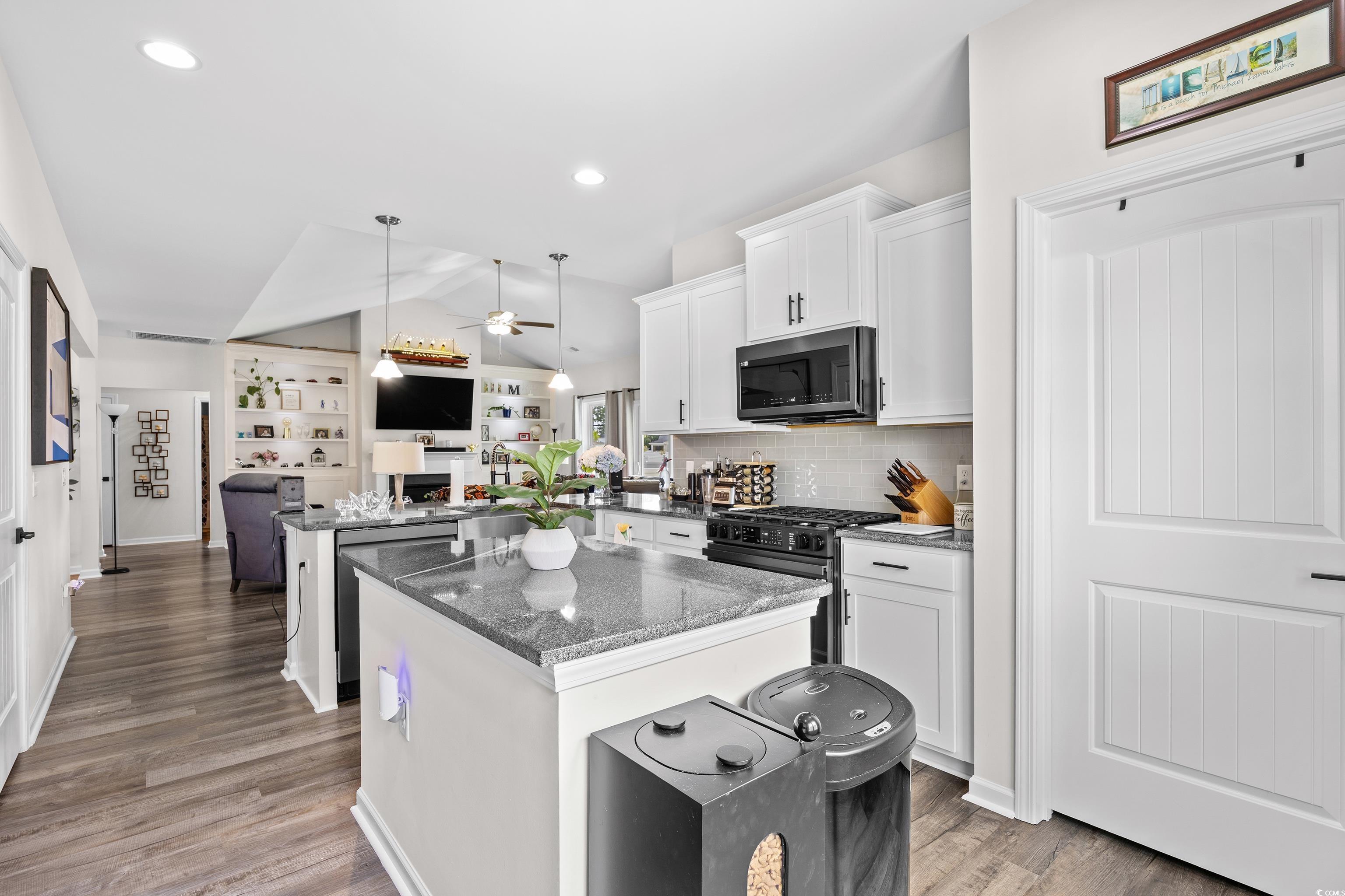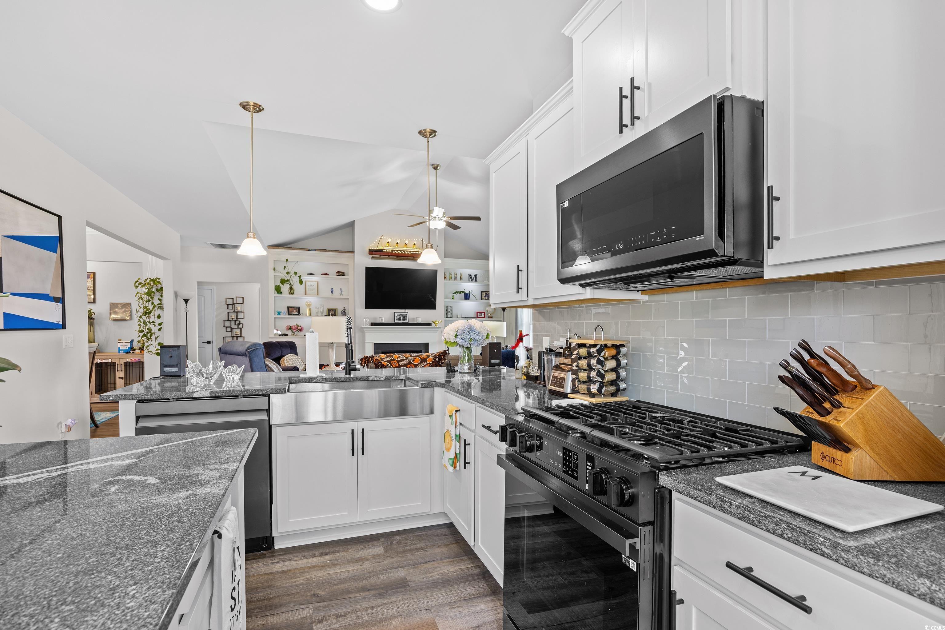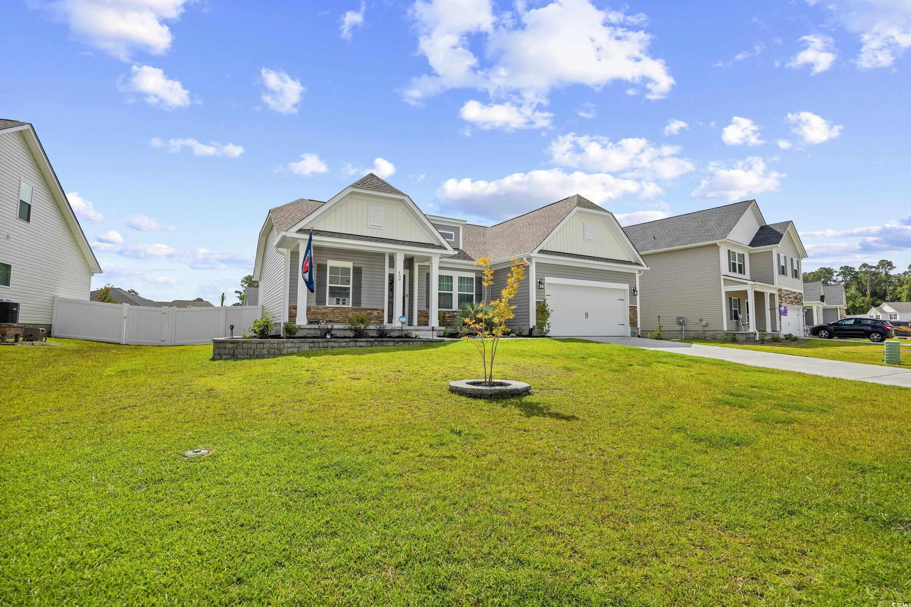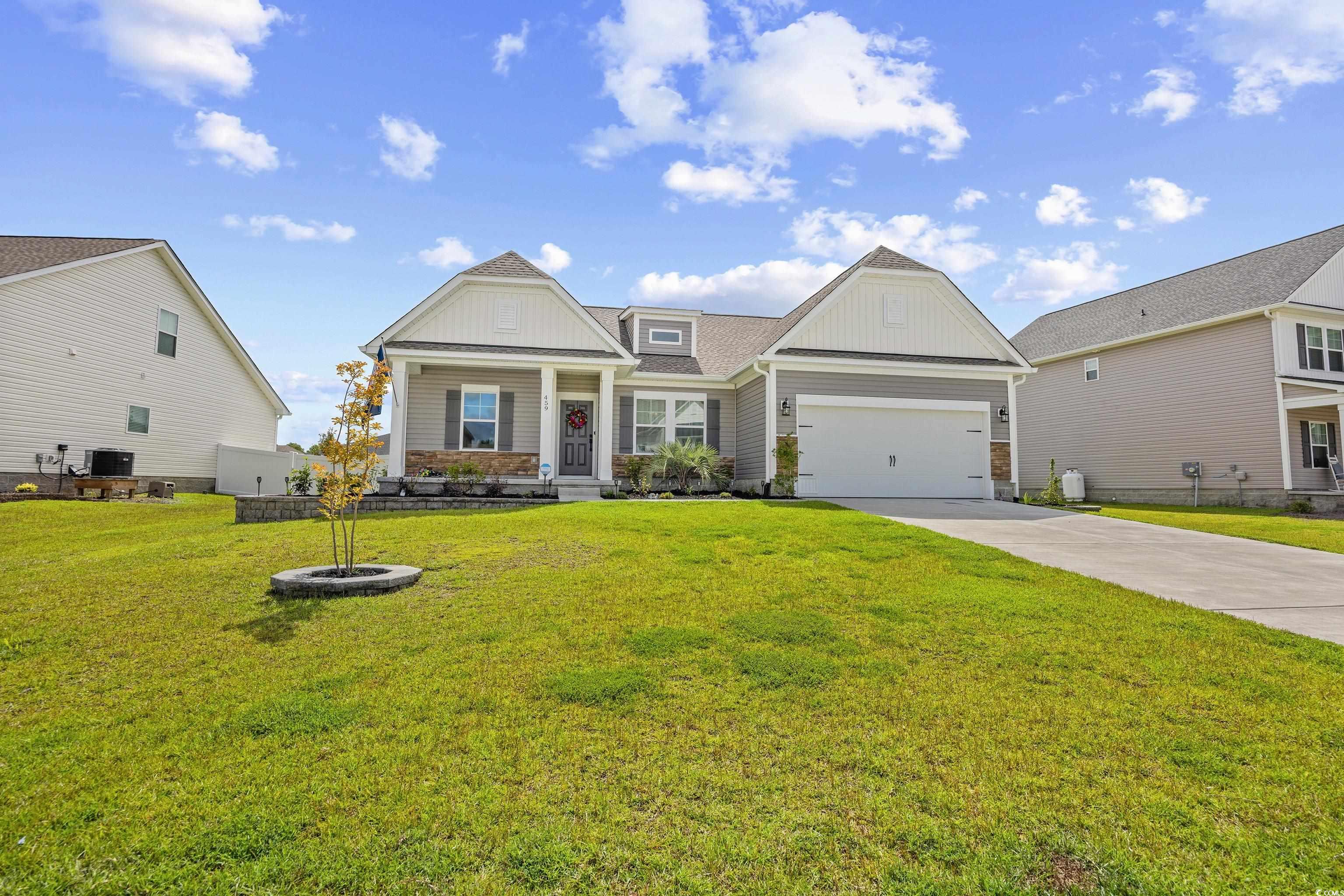 This popular Wisteria E ranch home is beautifully appointed with high quality upgrades! Vaulted ceiliings in the greatroom and Owner's suite make the well designed plan even more open and airy. Upgrades include a propane fireplace in the greatroom with a TV bracket in place above the fireplace-site built cabinets/bookshelves flank the fireplace and in the dining room and are all lighted; black accent upgraded hardware on cabinets, the kitchen is a cook's dream with a gas range; upgraded dishwasher; upgraded microwave; upgraded kitchen faucet and farm sink; tile backsplash, 3 cm granite countertops; large walk in pantry; kitchen island with storage; soft close doors and drawers, Luxury vinyl flooring everywhere except bedrooms; bathrooms have comfort height toliets and upgraded lighting; upgraded shower heads and faucets and a tiled shower with a tiled mudbed in the owner's bath. This home also has a nice covered patio on the back with raised cable and electrical outlets in place for a TV; a remote controlled ceiling fan; fully fenced back yard and irrigation system! Home also has a 220 outlet located in the garage, and gutters on the exterior. Beautifully landscaped yard featuring a raised retaining wall for raised flower bed with irrigation throughout the flowerbeds. This home is built on an elevated slab foundation, offering peace of mind, with no concerns about flooding or water intrusion. The raised design not only enhances durability but also provides a solid feel throughtout the home. Grissett Landing is located just 4 miles outside of downtown Conway located on the beautiful Waccamaw River. The community feautures a floating dock, a fire pit and green area for residents. Grissett is convenient to shopping, dining and approximately 25 to 30 minutes to the beach.