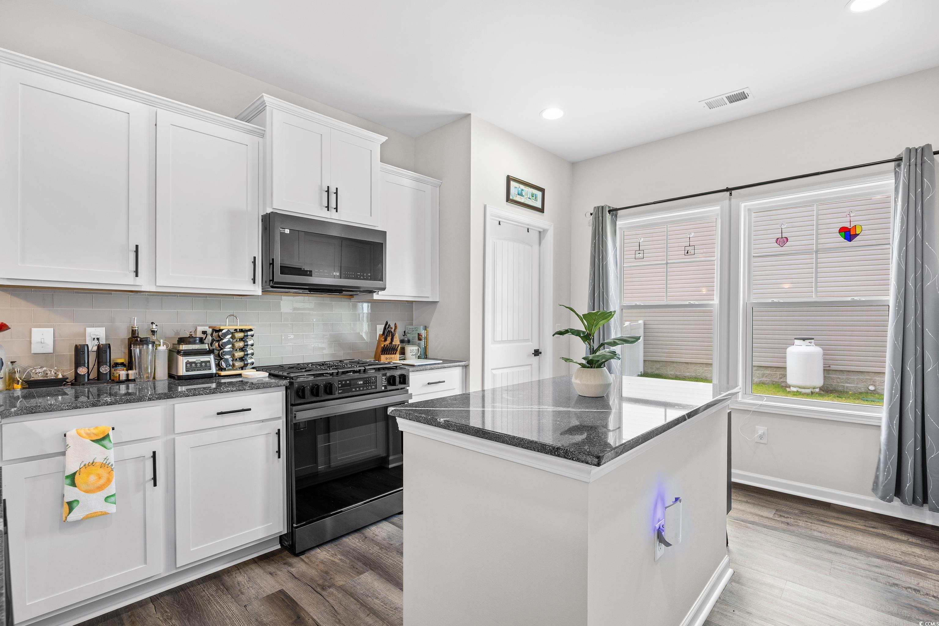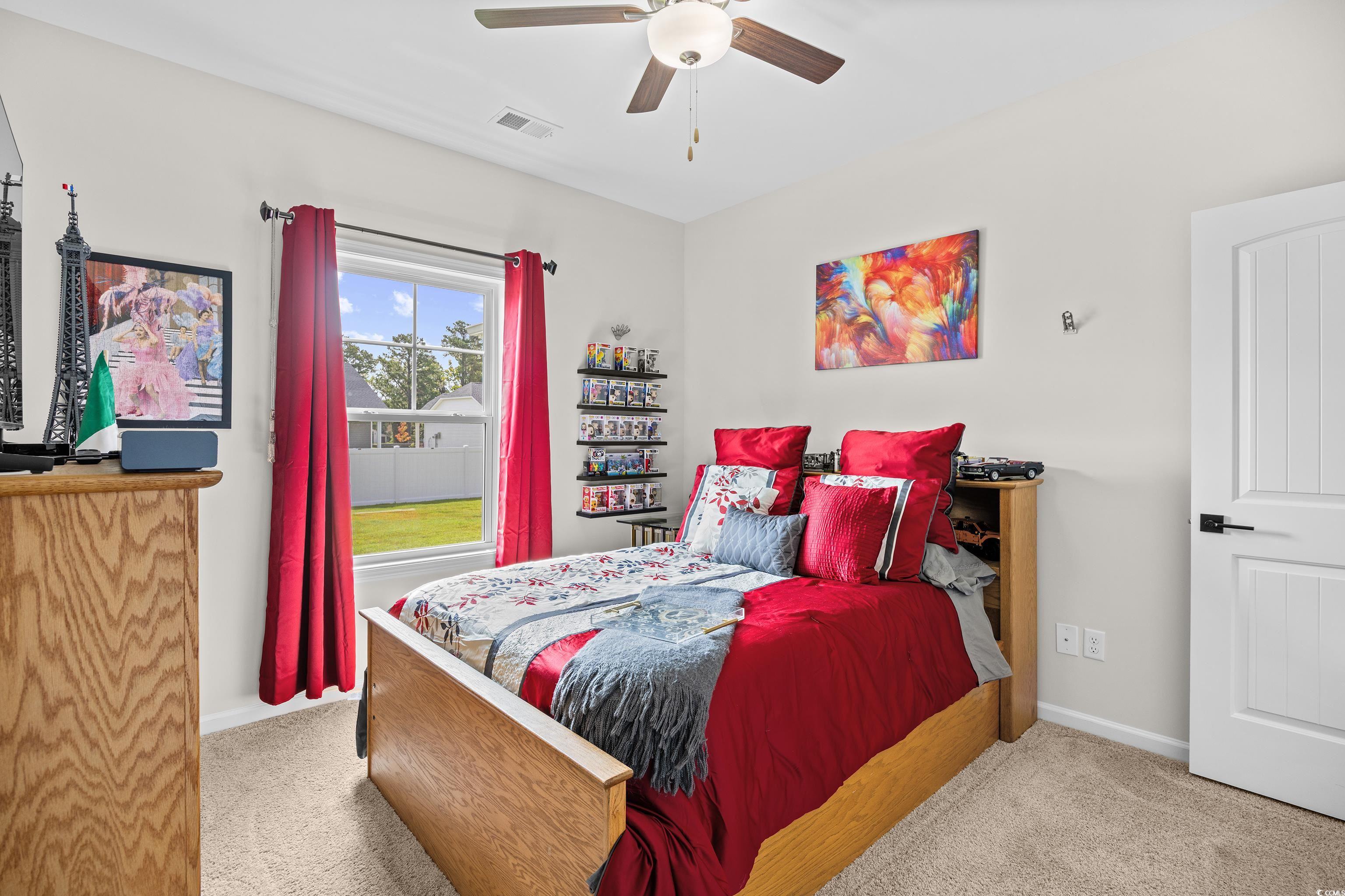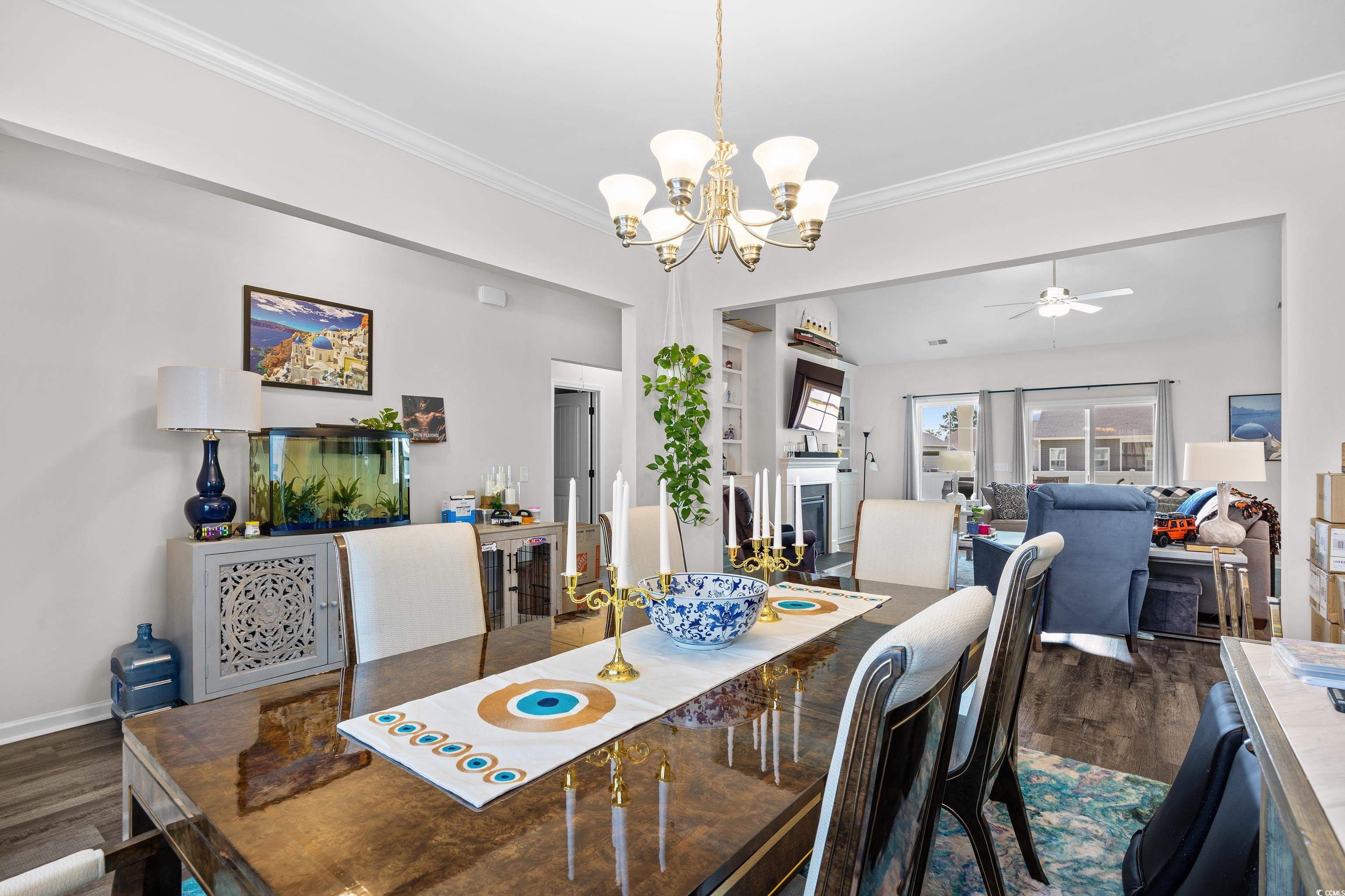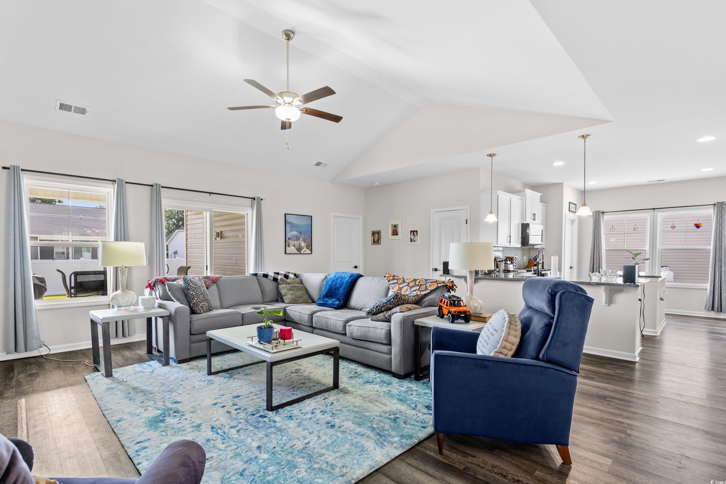 This popular Wisteria E ranch home is beautifully appointed with high quality upgrades! Vaulted ceiliings in the greatroom and Owner's suite make the well designed plan even more open and airy. Upgrades include a propane fireplace in the greatroom with a TV bracket in place above the fireplace-site built cabinets/bookshelves flank the fireplace and in the dining room and are all lighted; black accent upgraded hardware on cabinets, the kitchen is a cook's dream with a gas range; upgraded dishwasher; upgraded microwave; upgraded kitchen faucet and farm sink; tile backsplash, 3 cm granite countertops; large walk in pantry; kitchen island with storage; soft close doors and drawers, Luxury vinyl flooring everywhere except bedrooms; bathrooms have comfort height toliets and upgraded lighting; upgraded shower heads and faucets and a tiled shower with a tiled mudbed in the owner's bath. This home also has a nice covered patio on the back with raised cable and electrical outlets in place for a TV; a remote controlled ceiling fan; fully fenced back yard and irrigation system! Home also has a 220 outlet located in the garage, and gutters on the exterior. Beautifully landscaped yard featuring a raised retaining wall for raised flower bed with irrigation throughout the flowerbeds. This home is built on an elevated slab foundation, offering peace of mind, with no concerns about flooding or water intrusion. The raised design not only enhances durability but also provides a solid feel throughtout the home. Grissett Landing is located just 4 miles outside of downtown Conway located on the beautiful Waccamaw River. The community feautures a floating dock, a fire pit and green area for residents. Grissett is convenient to shopping, dining and approximately 25 to 30 minutes to the beach.