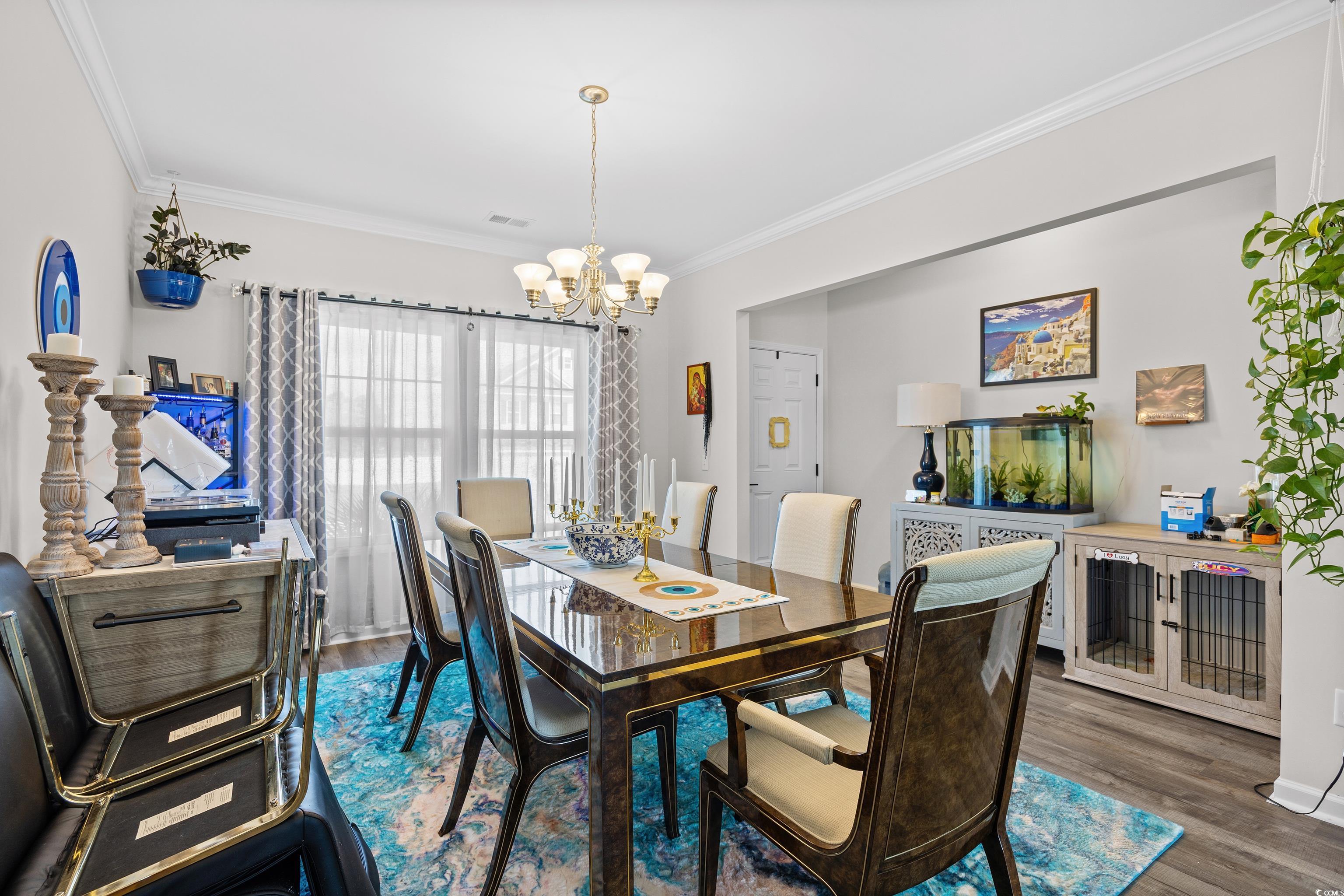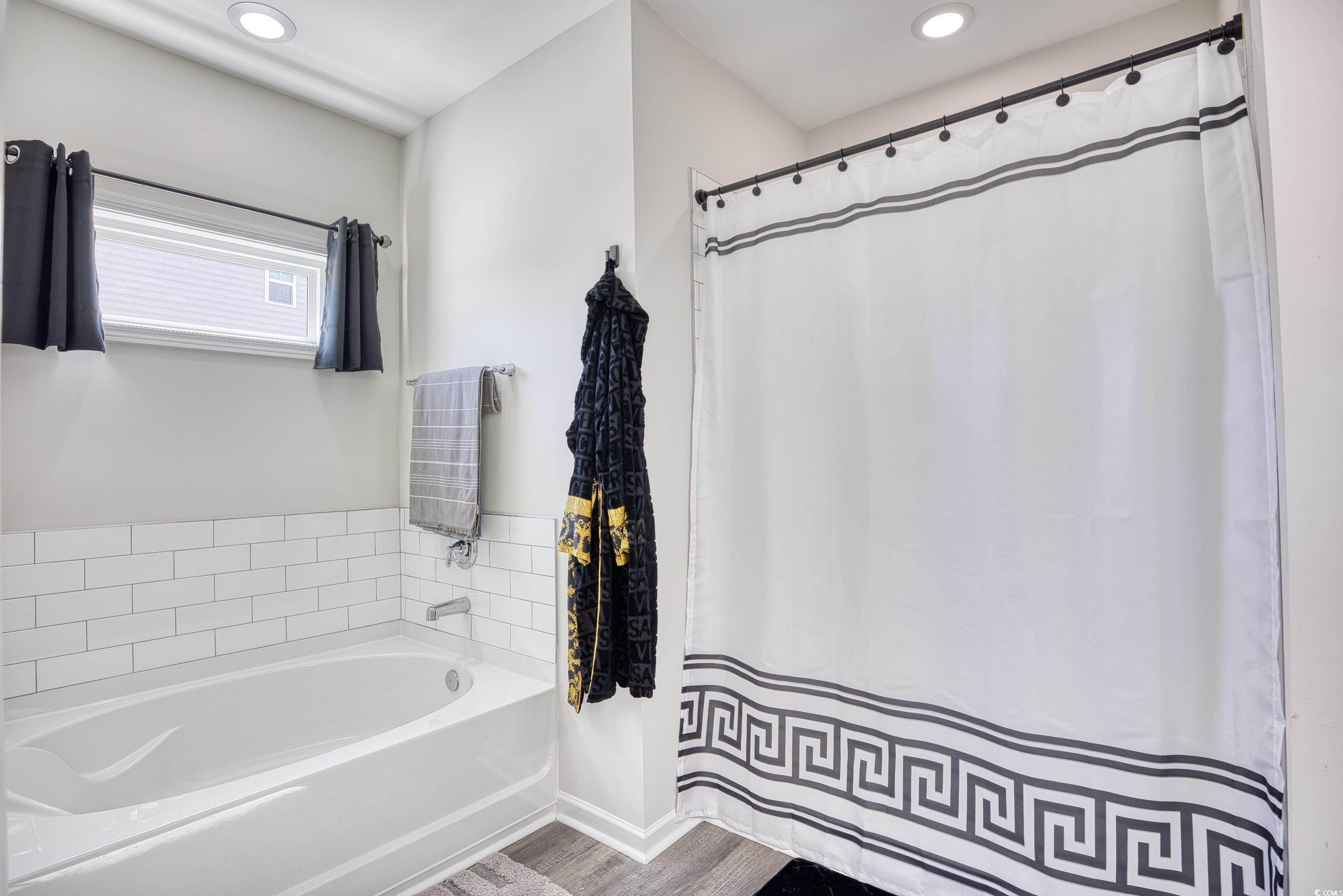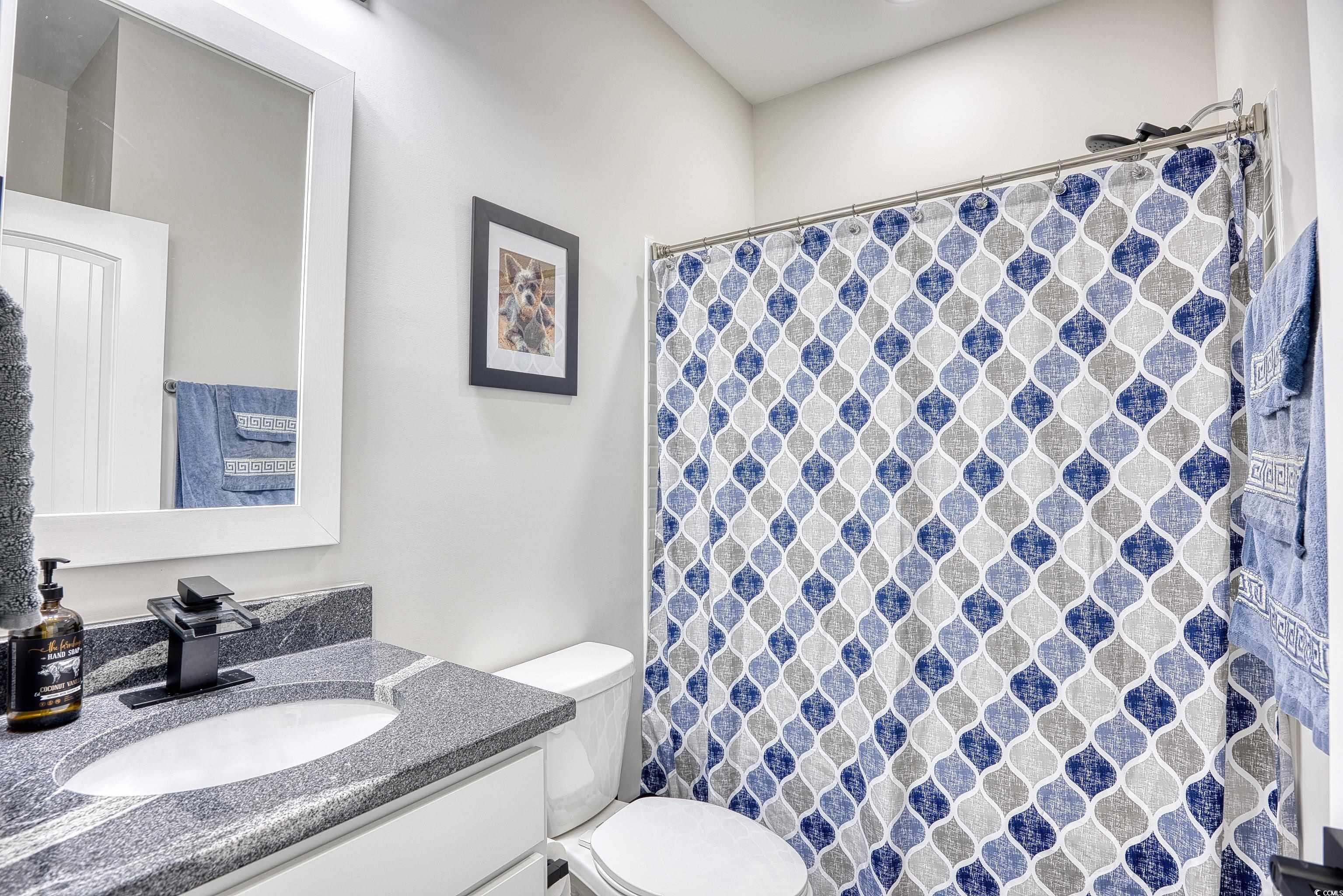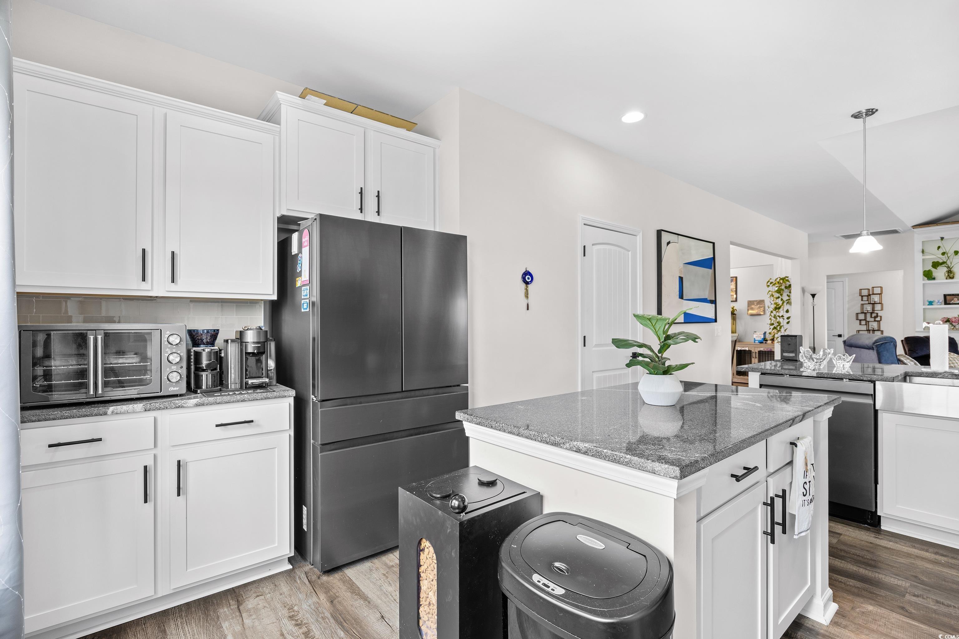 This popular Wisteria E ranch home is beautifully appointed with high quality upgrades! Vaulted ceiliings in the greatroom and Owner's suite make the well designed plan even more open and airy. Upgrades include a propane fireplace in the greatroom with a TV bracket in place above the fireplace-site built cabinets/bookshelves flank the fireplace and in the dining room and are all lighted; black accent upgraded hardware on cabinets, the kitchen is a cook's dream with a gas range; upgraded dishwasher; upgraded microwave; upgraded kitchen faucet and farm sink; tile backsplash, 3 cm granite countertops; large walk in pantry; kitchen island with storage; soft close doors and drawers, Luxury vinyl flooring everywhere except bedrooms; bathrooms have comfort height toliets and upgraded lighting; upgraded shower heads and faucets and a tiled shower with a tiled mudbed in the owner's bath. This home also has a nice covered patio on the back with raised cable and electrical outlets in place for a TV; a remote controlled ceiling fan; fully fenced back yard and irrigation system! Home also has a 220 outlet located in the garage, and gutters on the exterior. Beautifully landscaped yard featuring a raised retaining wall for raised flower bed with irrigation throughout the flowerbeds. This home is built on an elevated slab foundation, offering peace of mind, with no concerns about flooding or water intrusion. The raised design not only enhances durability but also provides a solid feel throughtout the home. Grissett Landing is located just 4 miles outside of downtown Conway located on the beautiful Waccamaw River. The community feautures a floating dock, a fire pit and green area for residents. Grissett is convenient to shopping, dining and approximately 25 to 30 minutes to the beach.