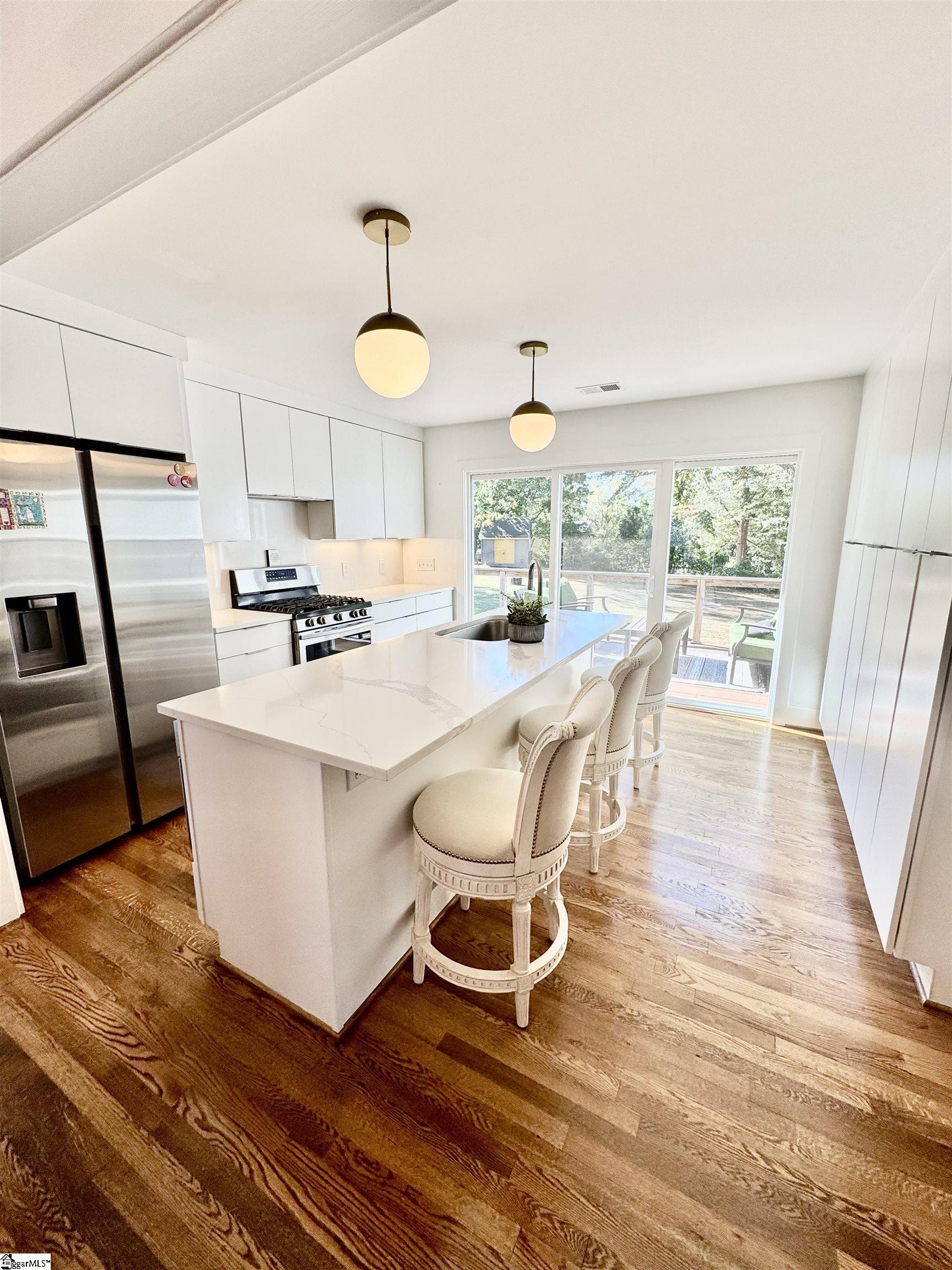 Welcome to this beautifully renovated mid-century style home in the heart of Overbrook, just minutes from downtown Greenville. Blending timeless design with modern finishes, this property provides style, function, and an unbeatable location in one of the city’s most walkable and desirable neighborhoods. From the spacious main level to the expansive finished basement, every detail has been thoughtfully considered to create a home that feels both stylish and practical. The main level features four spacious bedrooms and two full baths, designed with flexibility in mind. Two bedrooms have been combined to create a suite-style retreat, ideal for a primary suite, guest room, or shared kids’ space. If desired, the original wall can easily be restored to return to a traditional four-bedroom layout. The open living and dining area flows seamlessly into the fully redesigned kitchen, which showcases modern cabinetry, quartz countertops, a gas range, and elegant gold-and-stainless fixtures. Bright and inviting, this space is perfect for casual everyday living or hosting friends and family. Just off the kitchen, a convenient laundry and mudroom leads to a large deck overlooking the flat, wooded, and fully fenced backyard. This rare oversized lot provides plenty of room for gardening, play equipment, pets, and outdoor gatherings. There is also ample space to add a garage, providing future flexibility and value. The finished walk-out basement is a true highlight, providing over 1,700 square feet of bright, light-filled space. Currently used as a second living room, home office, and kids’ playroom, this level also includes a full bathroom and private access to the backyard. Whether you envision a guest suite, gym, creative studio, or additional entertaining area, the basement adapts easily to your lifestyle. From here, step out to a private rear patio, a quiet retreat that feels tucked away while still keeping you minutes from everything Greenville has to offer. Beyond the home itself, the location is exceptional. Overbrook is one of Greenville’s most beloved and fastest-growing neighborhoods, known for its tree-lined streets, strong sense of community, and unbeatable access to downtown. Residents enjoy walking to local cafes, gift shops and ice cream shops as well as nearby Timmons Park, which features tennis courts, playgrounds, and trails. Outdoor enthusiasts will love the easy access to the Swamp Rabbit Trail, providing miles of scenic biking, running, and walking paths. Downtown Greenville—with its award-winning restaurants, Falls Park on the Reedy, shopping, and entertainment—is only a short drive or bike ride away. Additional features include updated systems, preserved mid-century details, and a thoughtful renovation that balances character with modern convenience. The flexible floor plan works beautifully for a variety of lifestyles, whether you’re a growing family, a professional working from home, or someone who loves to host and entertain.
