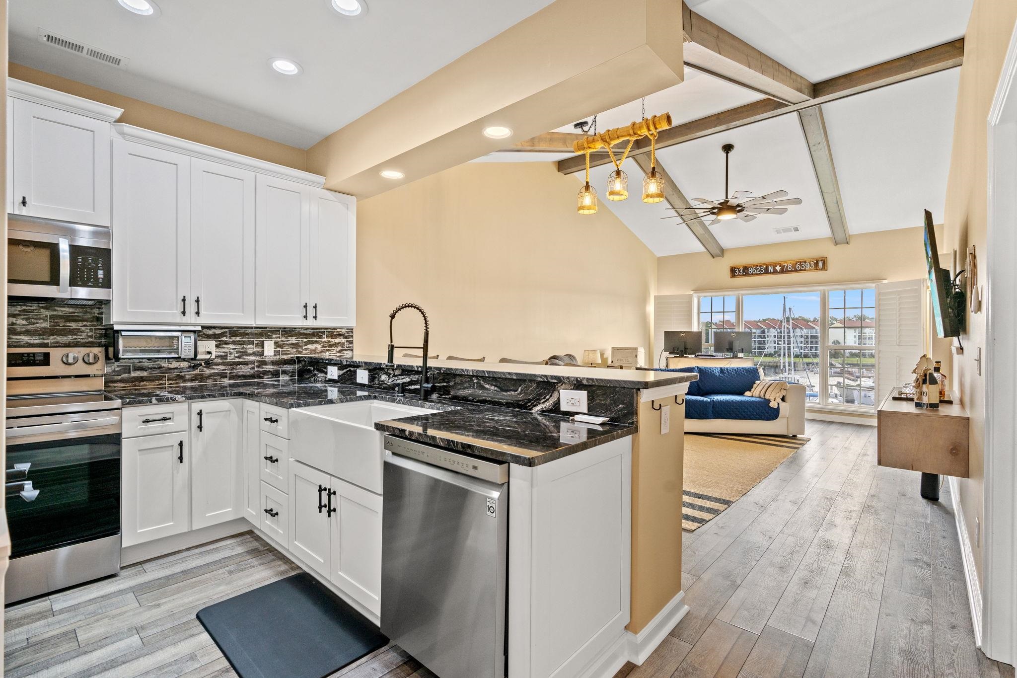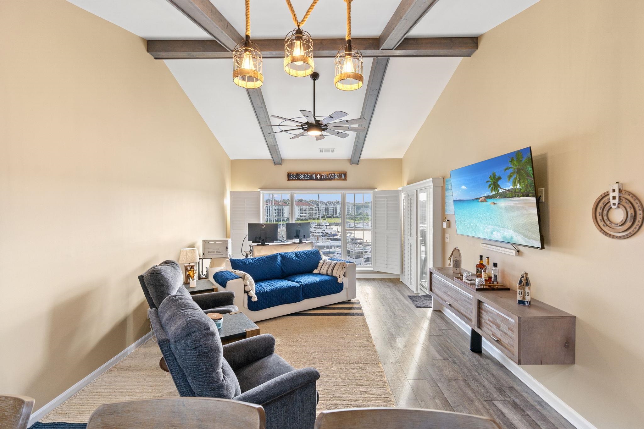Fully Renovated Top-Floor Oasis with amazing ICW Views - Experience the pinnacle of coastal living in this completely renovated, top-floor 2BR/2BA condo at the prestigious Yacht Club at Lightkeepers Village. This rare turnkey unit boasts vaulted ceilings accented by custom beams and sweeping views of the marina, harbor, and Intracoastal Waterway (ICW). The gourmet kitchen features a smart home suite of LG appliances, granite countertops, a full glass backsplash, and a hands-free faucet. High-end finishes extend throughout with LVP flooring, plantation shutters, and a custom-built drop zone. Both bathrooms are spa-inspired, offering tile walk-in showers, frameless doors, and rainfall shower systems with handheld sprayers. Modern tech is fully integrated with a Ring doorbell, Nest thermostat, WiFi digital locks, and USB outlets. Significant infrastructure upgrades include new tilt-in windows and a storm door with a retractable screen. Located steps from the Little River waterfront, world-class fishing, and dining. Offered fully furnished—just bring your toothbrush and enjoy the sunset.
