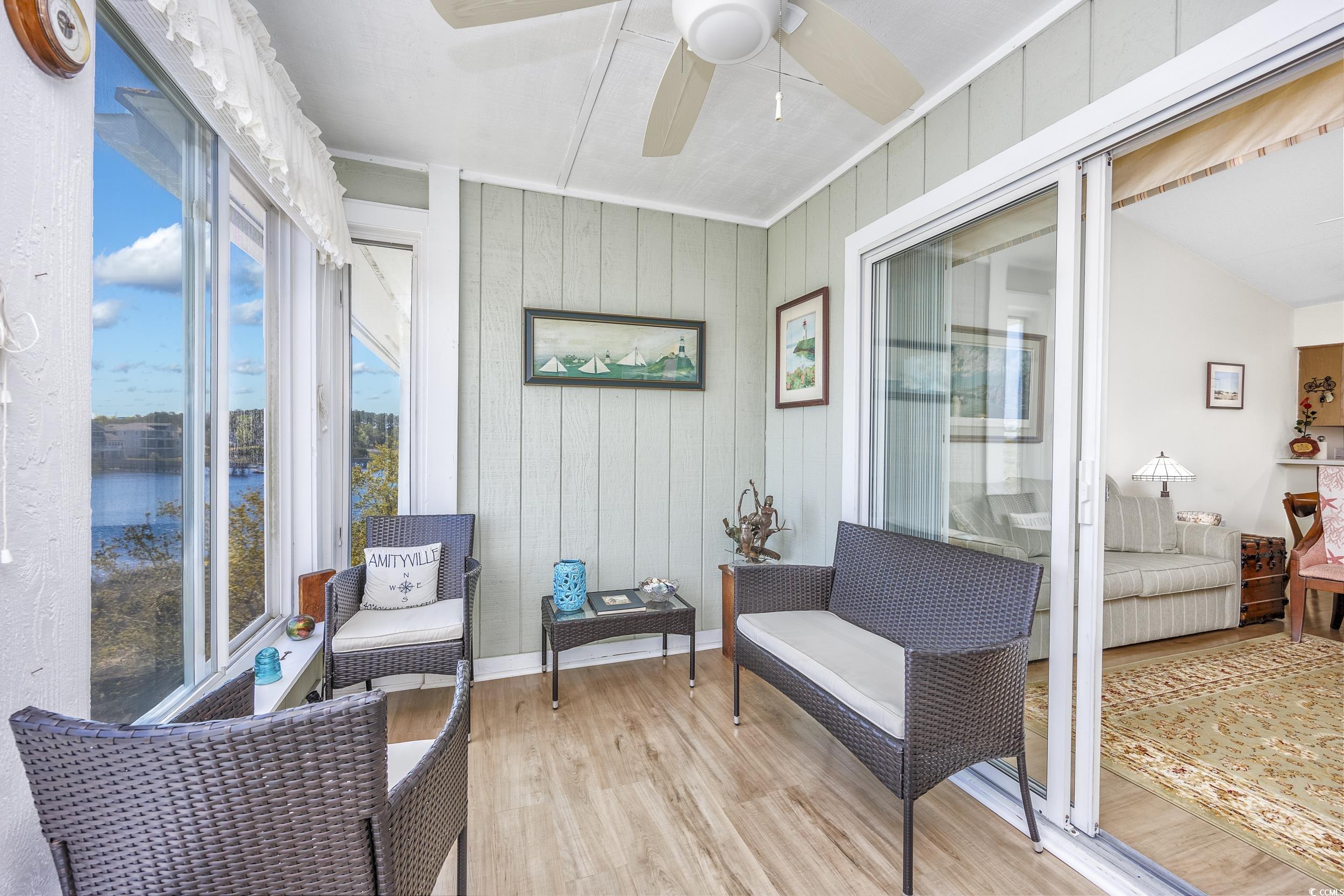 MOTIVATED SELLER!! Outstanding waterway views! Enjoy views of the waterway from most rooms in this condo. Enjoy your morning coffee year round on the enclosed, climate controlled Carolina Room as you watch the sun rise and the boats go by! Waterway views can also be enjoyed from the primary bedroom, the living room, and the kitchen. NEW HVAC INSTALLED MARCH 2025! Only two flights of stairs to access the condos outstanding view. The many windows make the condo bright and airy. Enjoy watching the activity on the waterway as you prepare dinner in the fully equipped kitchen with plenty of storage. Enjoy the sun rise from your bed in the primary bedroom that opens onto the Carolina Room, has two closets, and a comfortable en suite bathroom. Extra storage is available below the window seat looking out over the waterway. The living room/dining room is spacious, offers vaulted ceiling, a built in bar, and opens onto the Carolina Room. No unit above you means Spinnaker Bay H8 is peaceful and serene. You can relax in the quiet as you enjoy the views, or take advantage of the nearby pool on the many warm sunny days. The condo has recently had LVP flooring installed in living room/dining room, kitchen, Carolina room, and bedrooms. It includes all kitchen appliances and washer/dryer. Spinnaker Bay is close to the Little River waterfront, marinas, restaurants, golf, nature areas, and just minutes to the beach. When you return from a great day at the beach, store your beach toys in the outside storage. HOA includes building insurance, no flood claims since the building was new. Owners are allowed pets, only long term rentals are allowed.
