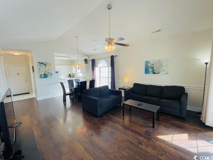 Beautifully maintained 2-bedroom, 2-bath end unit in the highly desirable Magnolia Place community, offering serene lake views, abundant natural light, and unbeatable central Myrtle Beach convenience. Sold fully furnished and equipped, this turn-key condo is ready for immediate enjoyment as a primary residence, vacation home, or investment property. Located less than a mile from Broadway at the Beach and The Atlantic Ocean, this property delivers the perfect blend of comfort, lifestyle, and location. The spacious end-unit layout features an open-concept living area, a well-appointed kitchen, dining space, and a private balcony overlooking the tranquil lake. The primary suite includes its own full bath, while the second bedroom and additional full bath provide ideal accommodations for guests. In-unit laundry adds everyday convenience. Magnolia Place is nestled within the scenic Myrtlewood Golf Course community, surrounded by lush landscaping, walking paths, and peaceful residential surroundings. Community amenities include multiple outdoor pools, picnic areas, and beautifully maintained grounds. Location is one of the standout features, with quick access to: Broadway at the Beach with entertainment, nightlife, and attractions The Atlantic Ocean and miles of sandy shoreline Coastal Grand Mall, shopping centers, and boutique stores Top dining options, cafés, and local restaurants Ripley’s Aquarium, WonderWorks, Topgolf, mini-golf, and family attractions Myrtle Beach International Airport—less than 10 minutes away A rare opportunity to own a fully furnished, turn-key lakefront end unit in one of Myrtle Beach’s most desirable golf course communities, just moments from the area’s best shopping, dining, and entertainment.