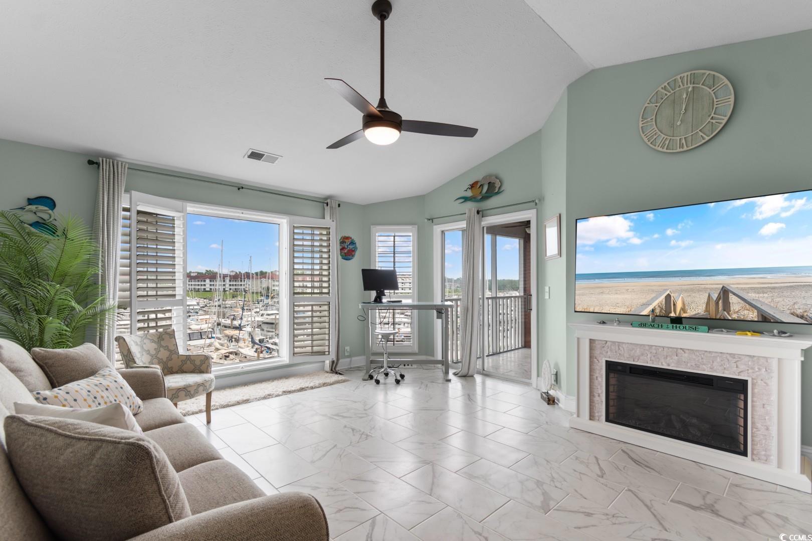 Welcome to 4633 Lightkeepers Way --- a beautifully updated, top-floor condo offering stunning marina and Intracoastal Waterway views in the highly desirable Lightkeepers Village community. This furnished, move-in-ready unit has been thoughtfully upgraded from top to bottom. Step inside to newer ceramic tile throughout, soaring cathedral ceilings that flood the living space with natural light, and elegant plantation shutters for added charm and privacy. The kitchen is equipped with a brand-new stainless steel refrigerator and oven, both barely used, while the bathrooms feature newer cabinets and sinks for a fresh, modern feel. Enjoy year-round comfort thanks to a newer HVAC system with smart thermostat and a new hot water heater. Additional upgrades include new ceiling fans and freshly painted bedrooms, creating a welcoming and stylish atmosphere. Relax in the spacious living area, complete with a new La-Z-Boy sleeper sofa with an upgraded mattress, perfect for hosting overnight guests. This top-floor unit also comes with peace of mind: a new roof was installed in 2023, and the entire property is designed for low-maintenance living. Residents enjoy fantastic amenities including two sparkling pools, a clubhouse, tennis and pickleball courts, and a scenic marina boardwalk that leads to breathtaking views of the Intracoastal Waterway, and a beautiful lighthouse with scenic views. Best of all, you're just minutes from Cherry Grove Beach and all the coastal activities you love. Don't miss your chance to own this immaculate condo in one of the area's most picturesque communities and schedule your private tour today!