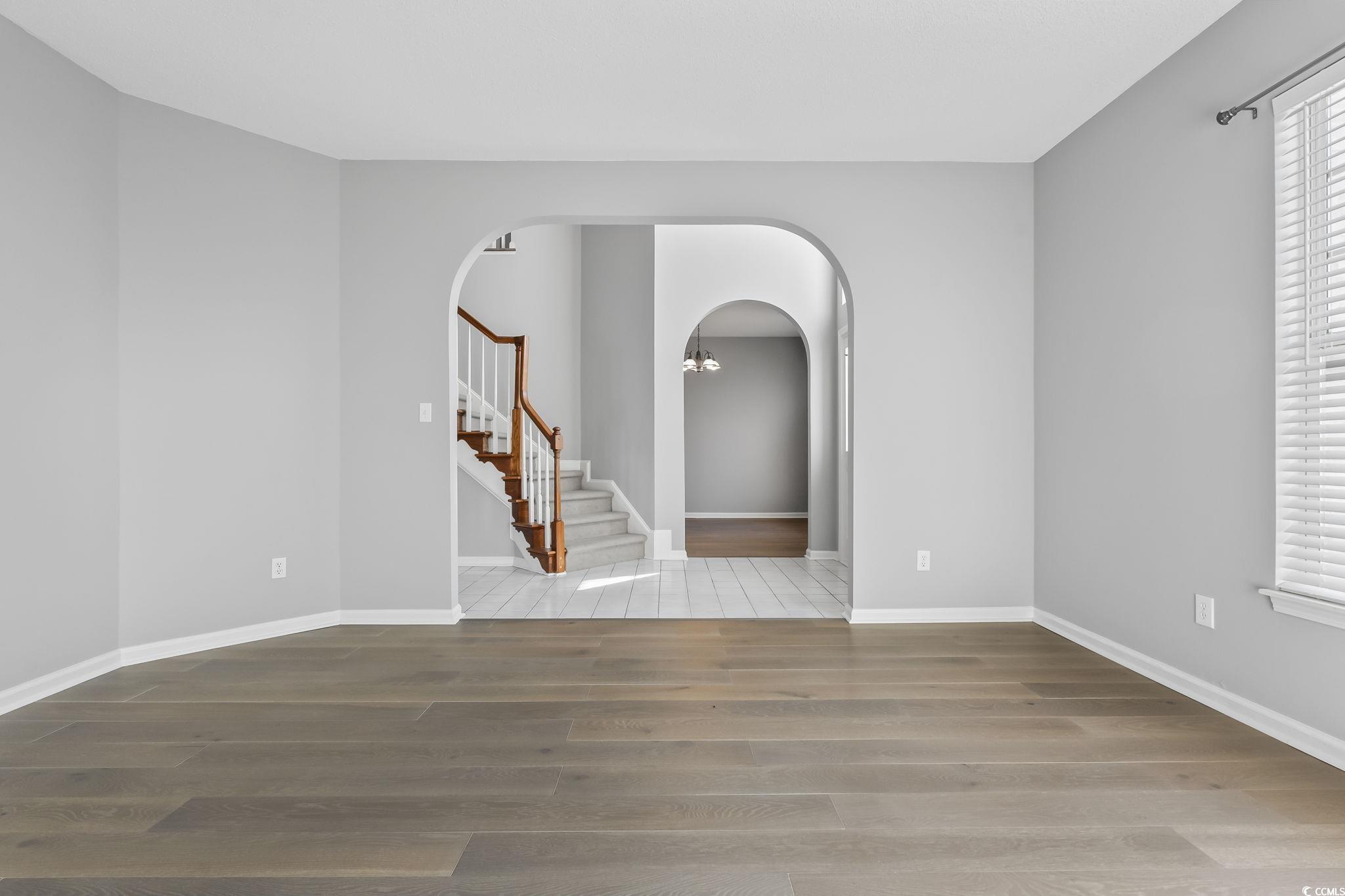 Located in the highly sought-after Carolina Forest area, this stunning two-story home offers exceptional curb appeal with its classic brick-and-siding exterior, welcoming arched entryway, and spacious two-car garage. Set on a beautifully maintained lot with mature surroundings, the property provides a peaceful and inviting backdrop that enhances its overall charm. Upon entry, you’re greeted by a bright, open foyer featuring soaring ceilings and elegant architectural arches that create an impressive first impression. The staircase is accented with warm wood handrails and crisp white balusters, adding timeless character. Neutral paint tones and abundant natural light throughout the home create an airy, fresh, and welcoming atmosphere. The main living areas showcase stylish wood-look flooring that flows seamlessly from room to room, offering both warmth and durability. Open sightlines and graceful arched doorways enhance the spacious feel, making the layout ideal for entertaining as well as comfortable everyday living. Just off the foyer, a separate formal dining room provides an elegant space for hosting dinners and special occasions, offering both privacy and convenience. The kitchen and breakfast area feature a bright, open-concept design perfect for gatherings. The kitchen is equipped with crisp white cabinetry, sleek dark countertops, stainless steel appliances, and a functional center island providing additional prep space and storage. Modern pendant lighting adds a stylish finishing touch. The adjoining breakfast area is filled with natural light from multiple windows adorned with classic plantation shutters, creating a warm and inviting setting. A beautiful chandelier defines the space, while the seamless flow into the living area makes hosting effortless. Upstairs, the home offers four generously sized bedrooms, including a spacious owner’s suite designed for comfort and privacy. The ensuite bath features dual owner’s closets, providing ample storage and organization. With its thoughtful layout, neutral palette, and move-in-ready condition, this home perfectly blends comfort, style, and functionality.