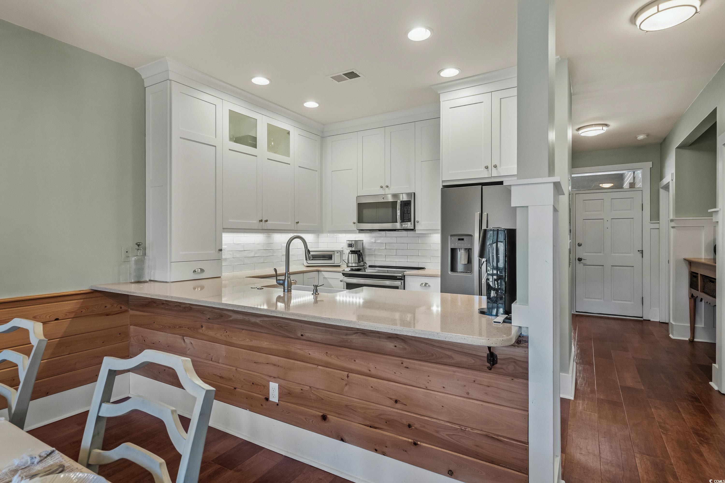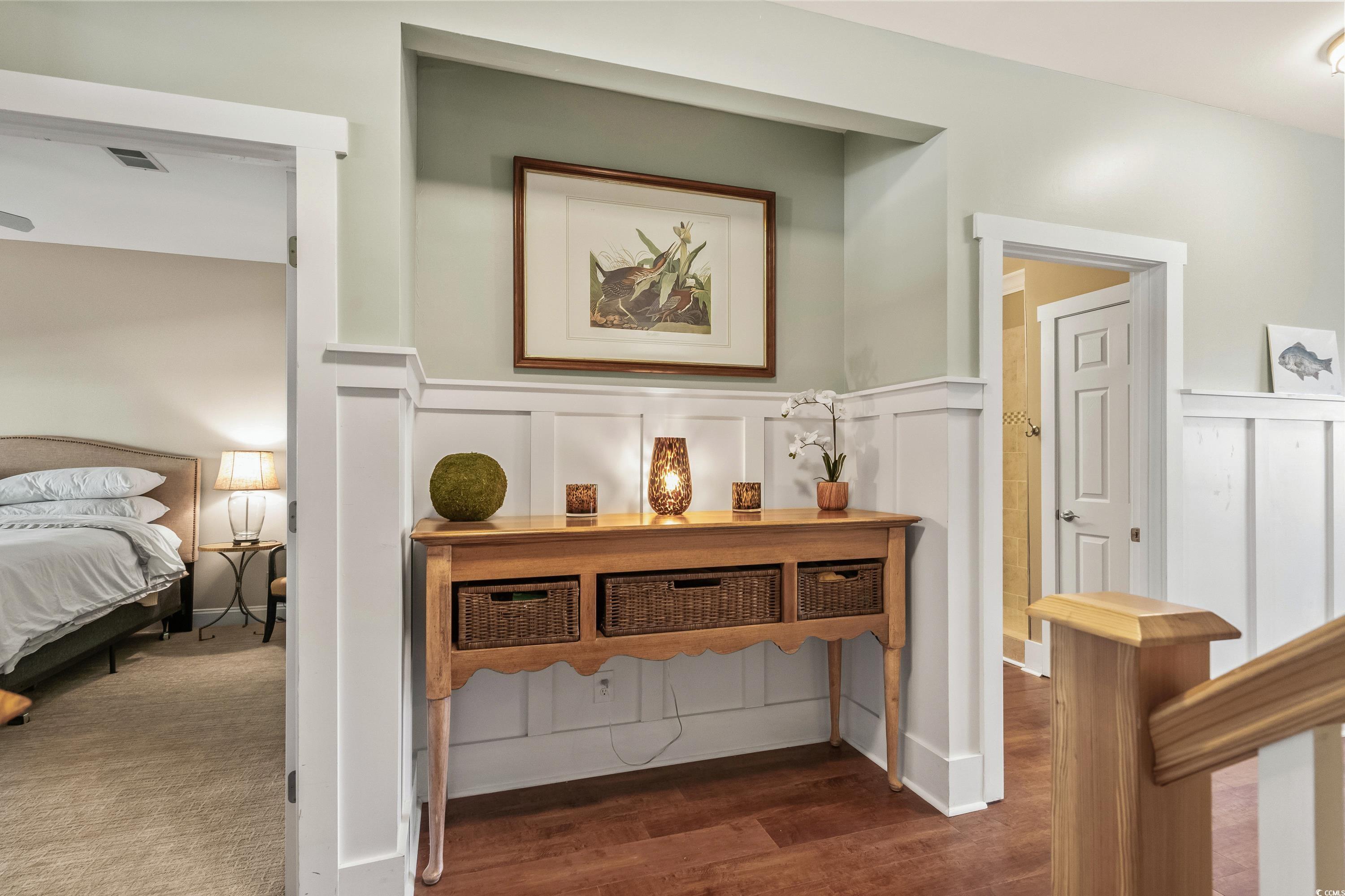 Back on the Market! No fault of the seller! Now is your chance to own in Pawleys Plantation! Explore this beautifully updated 3-bedroom, 3-bathroom villa offering luxury, flexibility, and lifestyle. This spacious home features Cherry-finish luxury vinyl plank flooring throughout the main level, a modern kitchen with quartz countertops, stainless steel appliances, a new electric induction cooktop, and white cabinetry with high-end finishes. Board and batten wainscoting flows into the great room, where custom plantation shutters and a large picture window bring in beautiful natural light. The main-floor primary suite includes a walk-in closet and a fully renovated bathroom with a tiled shower, double quartz vanity, and a large storage closet that can double as a pantry. Upstairs, the second primary suite features a cozy 42” fireplace with custom stone surround and wood mantel, a sitting area, walk-in closet, bonus storage room, and a full-size stacked laundry center. The oversized en-suite bath offers a freestanding Jetted Jacuzzi-brand tub, walk-in shower, and double quartz vanity. A third bedroom is located across the hall with its own updated en-suite bathroom and extended storage. The second floor has been completely remodeled with fresh paint and new plush carpeting. Additional features include an open carport with ample parking, an exterior storage room, and a screened-in back patio with EZE Breeze liners and custom shades. First-floor window treatments (rods, drapes, shades, shutters, and valances) are included. Short- and long-term rentals are allowed, including Airbnb, making this home a smart investment opportunity as well as a luxurious primary or second residence. Located minutes from Pawleys Island beaches, historic Georgetown, Brookgreen Gardens, and Huntington Beach State Park.