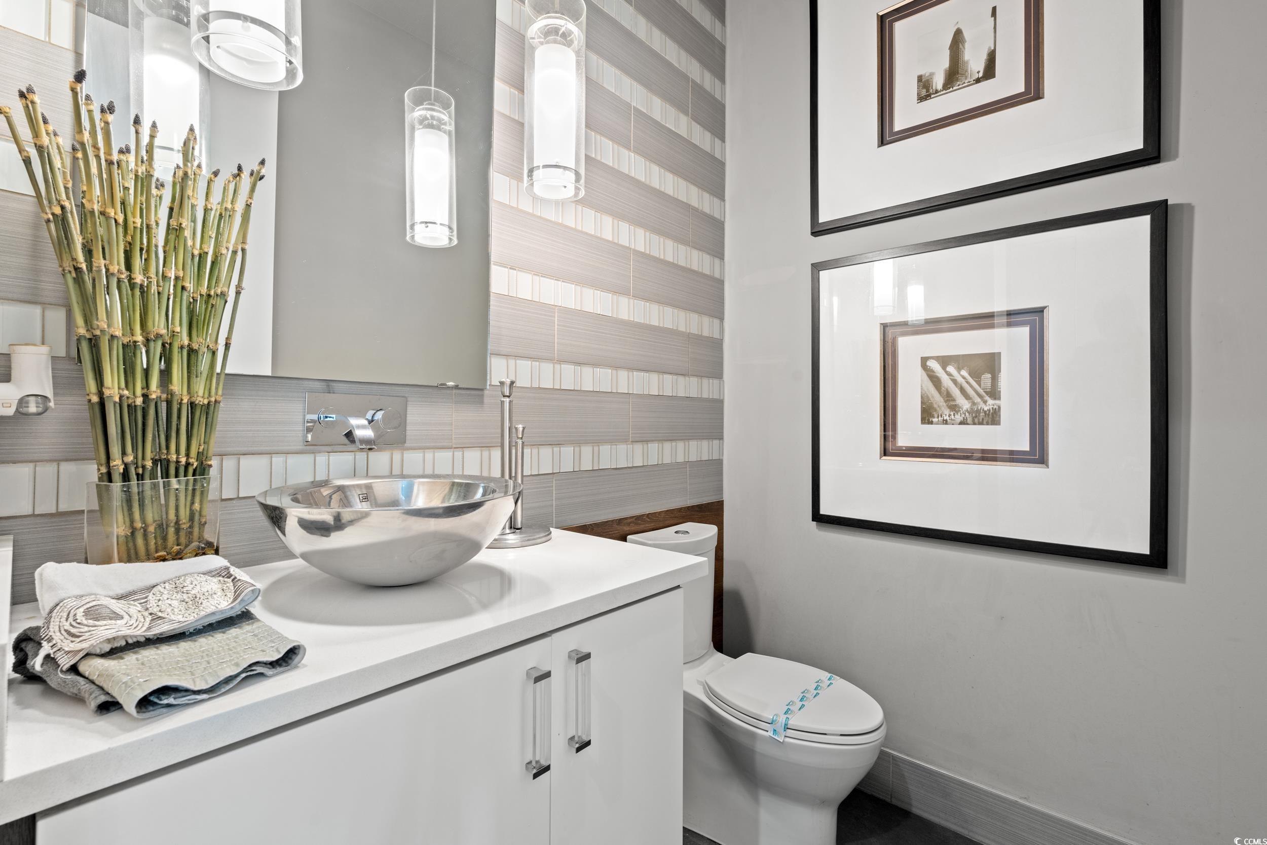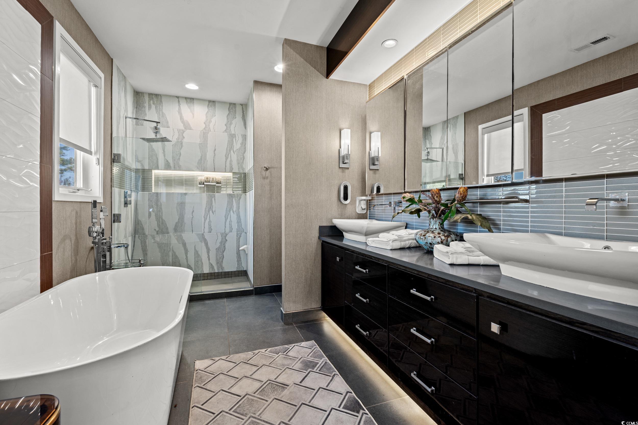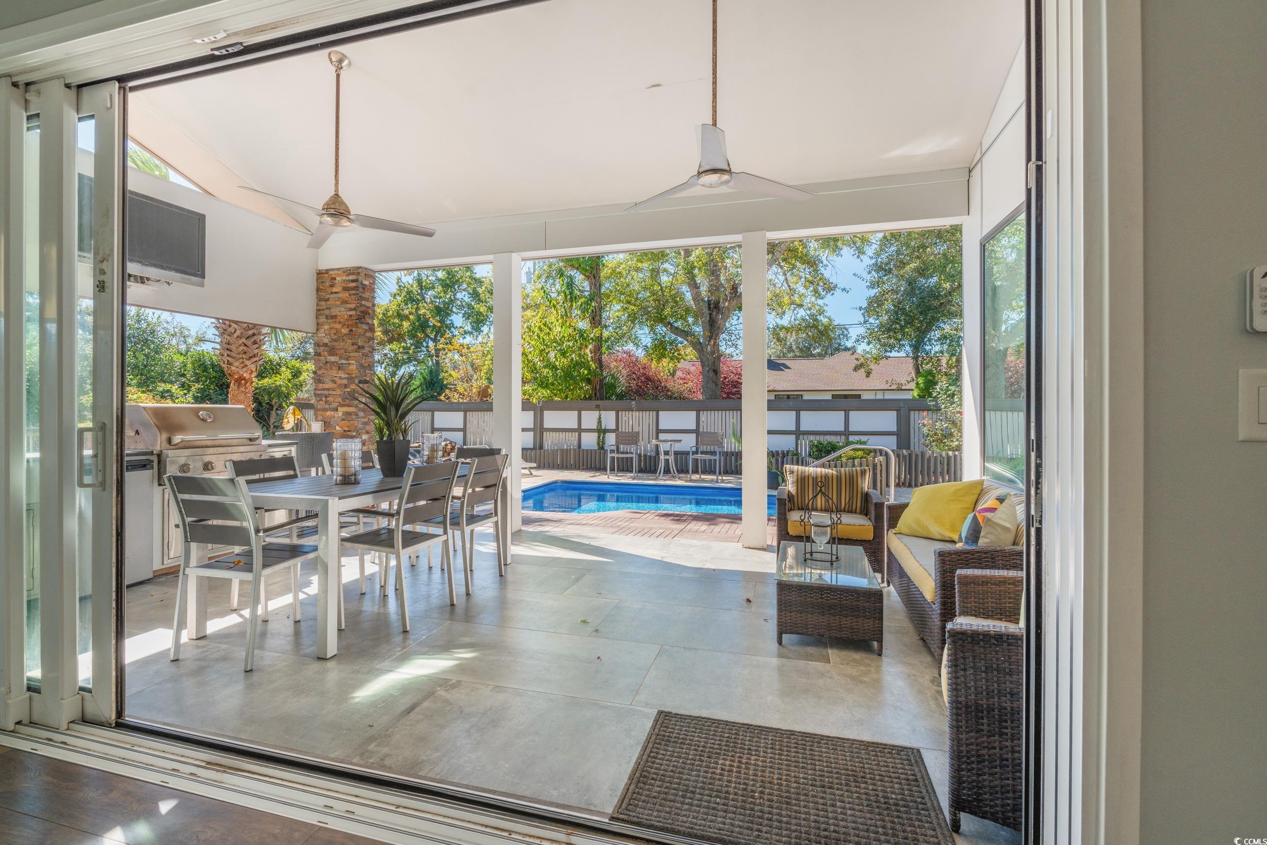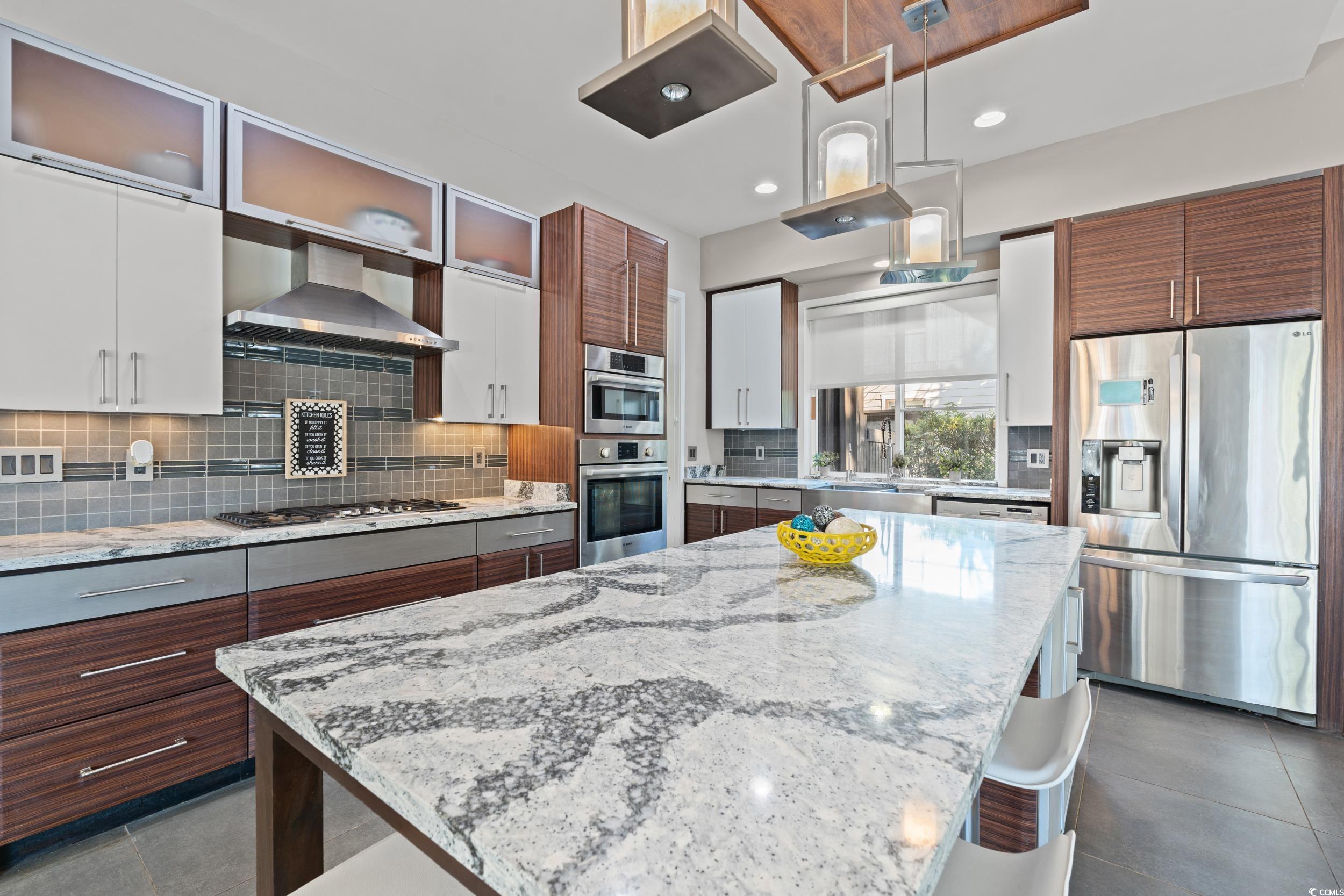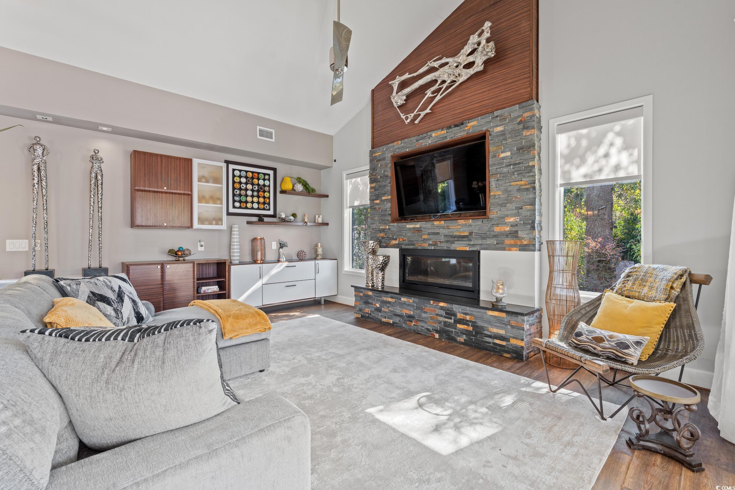 Experience the perfect blend of modern luxury, comfort, and coastal living in this fully furnished, move-in-ready home in the highly sought-after Pine Lakes community—just three short blocks from the beach! Thoughtfully designed and architecturally interesting, this home stands out with its clean lines, rich materials, and warm textures. The striking exterior showcases natural stacked stone and beautiful Brazilian Ipe wood detailing by the front door, trim, and second-floor primary balcony, creating a truly distinctive coastal-modern aesthetic. Built with quality and style in mind, this turn-key property sits on one of the last lots developed in Pine Lakes, offering incredible value compared to surrounding homes. Inside, you’ll find designer furnishings, impact-resistant windows and doors, a metal roof, tankless water heater, and a chef’s kitchen complete with premium appliances, natural gas cooktop, and tiger wood cabinetry. The open living space features a stacked stone gas fireplace, custom window treatments, and smart home technology—with Alexa-compatible systems controlling lighting, locks, thermostat, and security from anywhere in the world. Step outside to your private eco-friendly oasis, designed with native plants, fruit trees, and sustainable landscaping that attract butterflies, birds, and other local wildlife. Enjoy the heated and cooled cottage with a kitchenette and electric fireplace, the temperature-controlled greenhouse behind, and a sparkling in-ground pool surrounded by rosewood-toned Brazilian Ipe decking and elegant stacked stone accents. As a bonus the climate-controlled cottage space is not included in total heated square footage. Additional features include a primary suite with concealed wall safe, concealed table safes, a gaming/computer nook with a hidden twin bed, and best of all—no HOA! Whether you’re seeking a luxury beach retreat or a full-time residence close to everything Myrtle Beach has to offer, this home is truly one-of-a-kind. Just bring your toothbrush and start living your coastal dream!