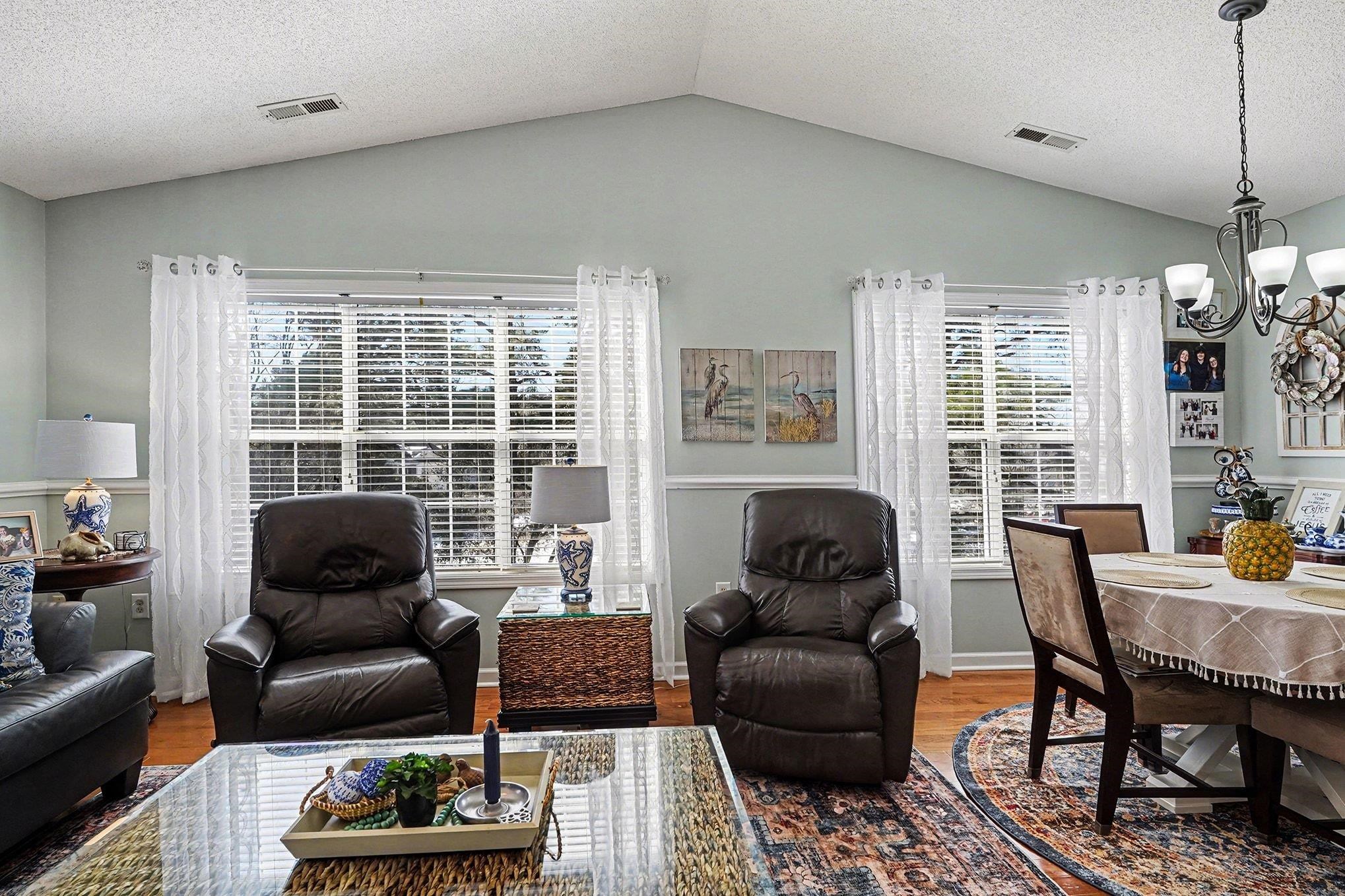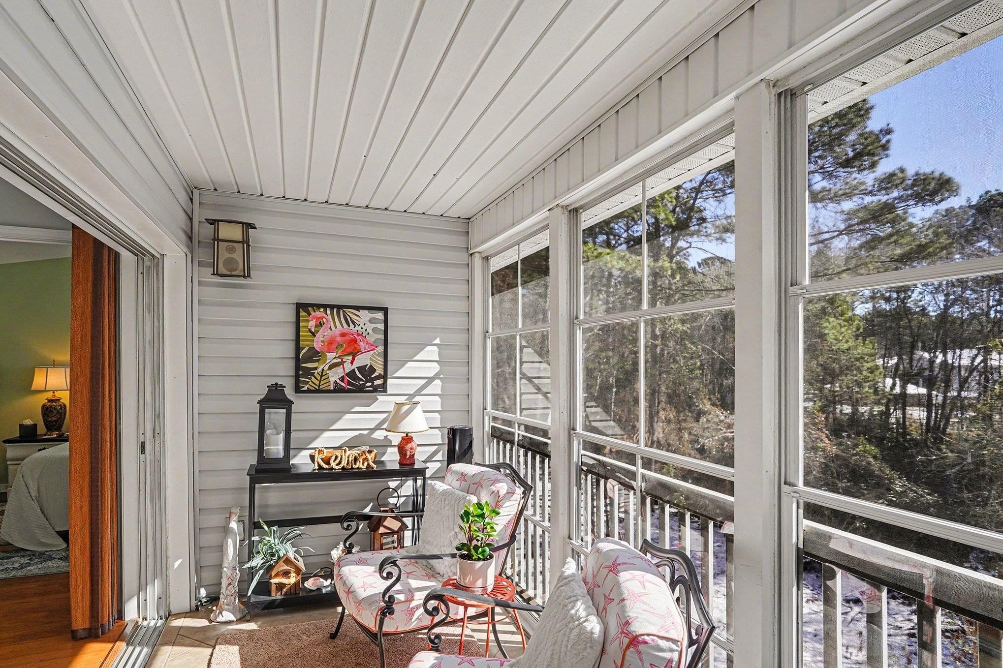 This top-floor end unit condominium offers elevator access and features two bedrooms and two bathrooms. The bright and airy residence includes vaulted ceilings and hardwood flooring throughout. The kitchen is finished with tile flooring, granite countertops, abundant cabinetry, a glass mosaic tile backsplash, and stainless steel appliances. A laundry area is conveniently located off the kitchen. A sliding door fully retracts into the wall, opening the living room to the balcony and creating a seamless indoor-outdoor living space. The large screened-in porch overlooks a quiet wooded area. The primary bedroom features vaulted ceilings and an ensuite bathroom with a double vanity and a fiberglass shower with a glass enclosure. Bay Meadows is ideally located just minutes from Myrtle Beach beaches, golf courses, shopping, and dining. The community is also conveniently close to Coastal Carolina University, Conway Medical Center, restaurants, shopping, and entertainment, making this property an excellent choice for a primary residence, vacation home, or investment opportunity.