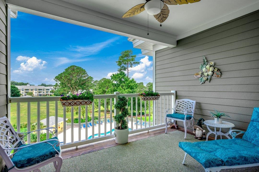 Welcome to this beautifully upgraded top-floor condo in an elevator building, where views of the golf course and one of the community pools greet you as soon as you enter. This 2-bedroom, 2-bath residence features a spacious open-concept design, elevated by high-end finishes and thoughtful details throughout. Located in the highly desirable Magnolia Pointe community, residents enjoy access to multiple outdoor pools, grilling areas, and two clubhouses all just minutes from the beach, shopping, dining, and entertainment. Inside, the bright and airy living space showcases new LVP flooring, a vaulted ceiling, chair rail detailing, and a large sliding glass door that perfectly frames the scenic surroundings. Step out onto the private porch to take in views of the 13th hole and 14th tee box. This inviting outdoor area includes custom wood-look tile flooring plus a ceiling fan with light. The kitchen combines style and function with granite countertops, tile backsplash and flooring, crown-molded cabinetry, a breakfast bar, and a full set of appliances including a newer Bosch dishwasher. The primary suite offers a peaceful retreat with a vaulted ceiling, ceiling fan, two closets (including a walk-in), and serene golf course views. The ensuite bath has been thoughtfully updated with dual vanities topped with granite, a custom walk-in tile shower, a comfort-height toilet, and modern lighting and mirrors. The guest bedroom also features a vaulted ceiling and is conveniently located near the second full bathroom, which includes a newer vanity top, updated mirror and lighting, a walk-in shower, and a comfort-height toilet. Additional highlights include an HVAC system replaced in August 2022, a full-size washer (new in October 2024) and dryer, a water heater installed in 2019, upgraded tile flooring in wet areas, air ducts cleaned in June 2021, and designer light fixtures throughout. Offering comfort, style, and an unbeatable location. This is coastal living at its finest.