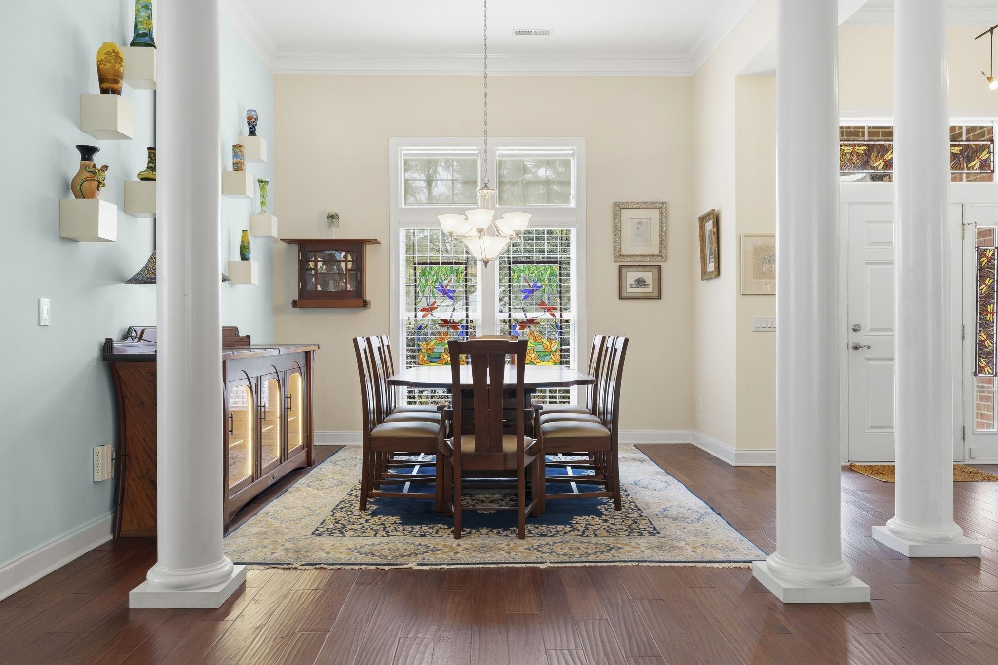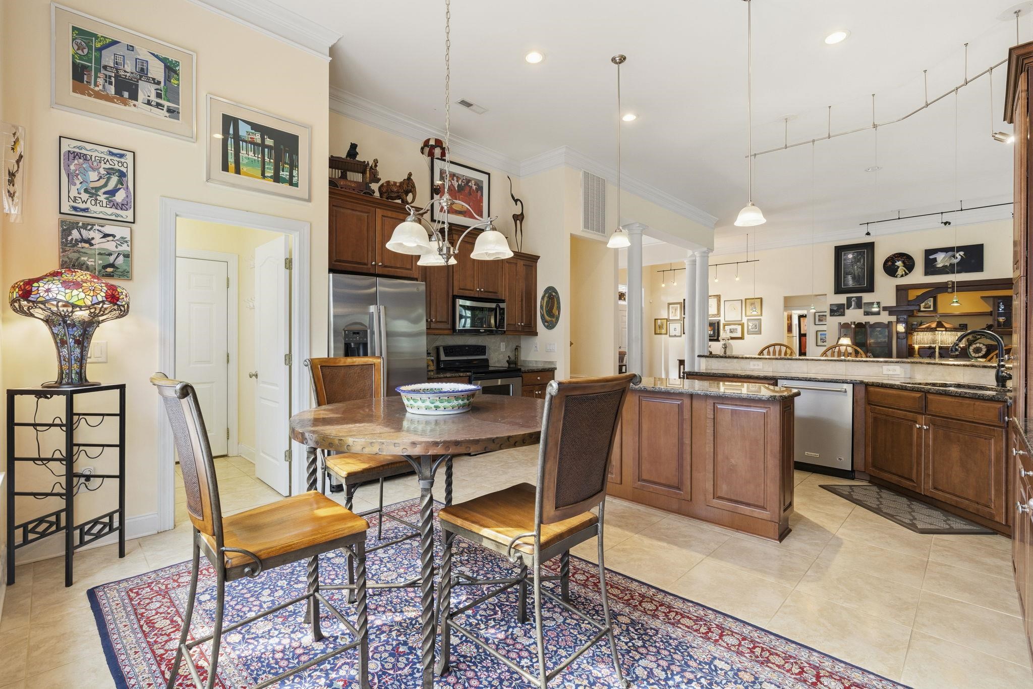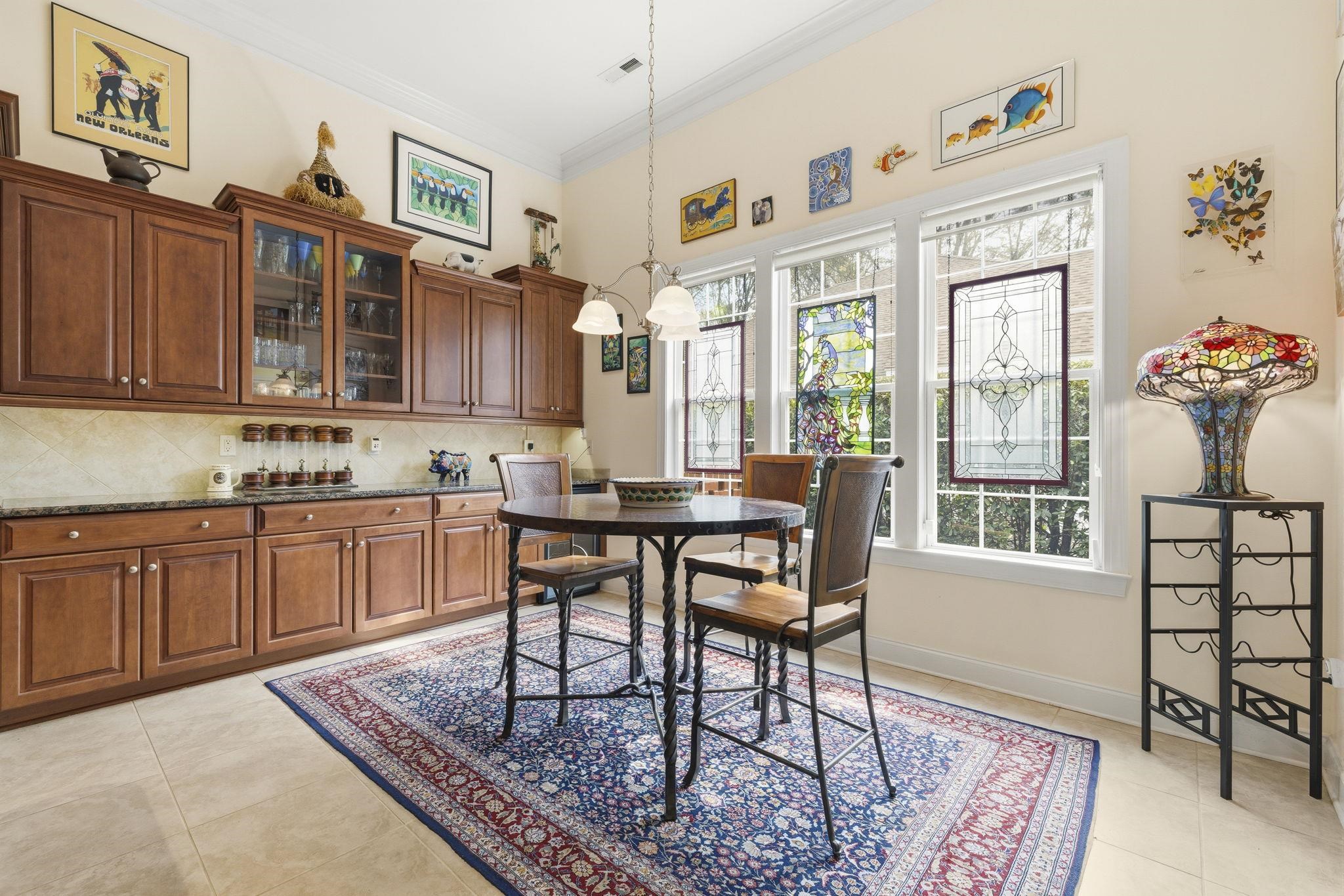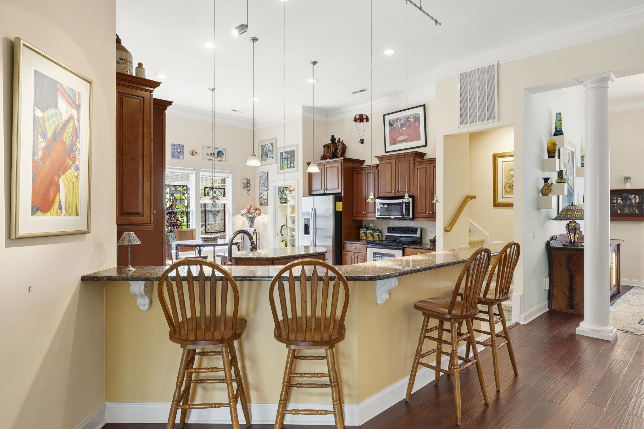 This custom-built residence offers the comfort and convenience of true single-level living, with all bedrooms and primary living spaces thoughtfully arranged on one floor. Elevated construction, distinctive architecture, and a backyard bordered by golf course property create a setting that feels private, open, and beautifully connected to the landscape. Located within one of the most distinctive sections of Tradition Club, 47 Brookridge Lane sits on a quiet cul-de-sac where the homes were individually designed and built, creating a streetscape that stands apart from many other areas of the neighborhood. The backyard borders golf course–owned property, providing a permanent green backdrop that enhances privacy while offering peaceful views across the landscape. Tall hedges frame the yard, while a paver patio creates an inviting outdoor setting for morning coffee or relaxed evening gatherings overlooking the course. Inside, scraped cherry wood floors and tall smooth ceilings create a warm and refined atmosphere throughout the home. The living room immediately draws attention with dramatic custom millwork crafted on site, featuring richly detailed built-ins, backlit shelving, granite surfaces, burl wood accents, and distinctive stained glass lanterns that add character and depth. The adjoining sunroom continues this inviting aesthetic with matching cabinetry and granite finishes while offering seamless access to the patio and backyard. The kitchen blends function and style with dark wood cabinetry, granite countertops, a center prep island, breakfast bar seating, wine cooler, and a concealed walk-in pantry designed to keep the space both organized and visually clean. The spacious primary suite offers a comfortable private retreat with soaring ceilings, a custom floating wood headboard, dual walk-in closets, and an ensuite bath featuring double sinks, a glass walk-in shower, and water closet. Three additional bedrooms provide flexibility for guests, hobbies, or workspace. Two share a full bath, including one currently serving as an office with custom built-ins that echo the home’s rich wood detailing. The third bedroom features its own ensuite bath and walk-in closet, creating a comfortable private guest suite. Additional highlights include a formal dining room with columns and transom windows, a laundry and mudroom connecting to the two-car garage, and a walk-up attic offering potential for future bonus space. A home warranty is included for added peace of mind. Residents of Tradition enjoy a beautifully maintained community designed around the Tradition golf course, along with excellent neighborhood amenities including tennis and pickleball courts, one of the largest community swimming pools in the Pawleys Island area, and a welcoming community clubhouse. Just beyond the neighborhood, convenient walking and bike paths connect residents to several Litchfield favorites—including a local bakery, restaurants, salons, and even a nearby brewery. Ownership also includes access to the private oceanfront community of Litchfield by the Sea—just a short golf cart ride away. Residents enjoy convenient parking for beach access, an oceanfront owners clubhouse, swimming pools, fishing and crabbing docks, and miles of beautiful shoreline along the coast of Pawleys Island. 47 Brookridge Lane is a home defined by craftsmanship and individuality—where thoughtful design and distinctive details create a warm and memorable living experience.
