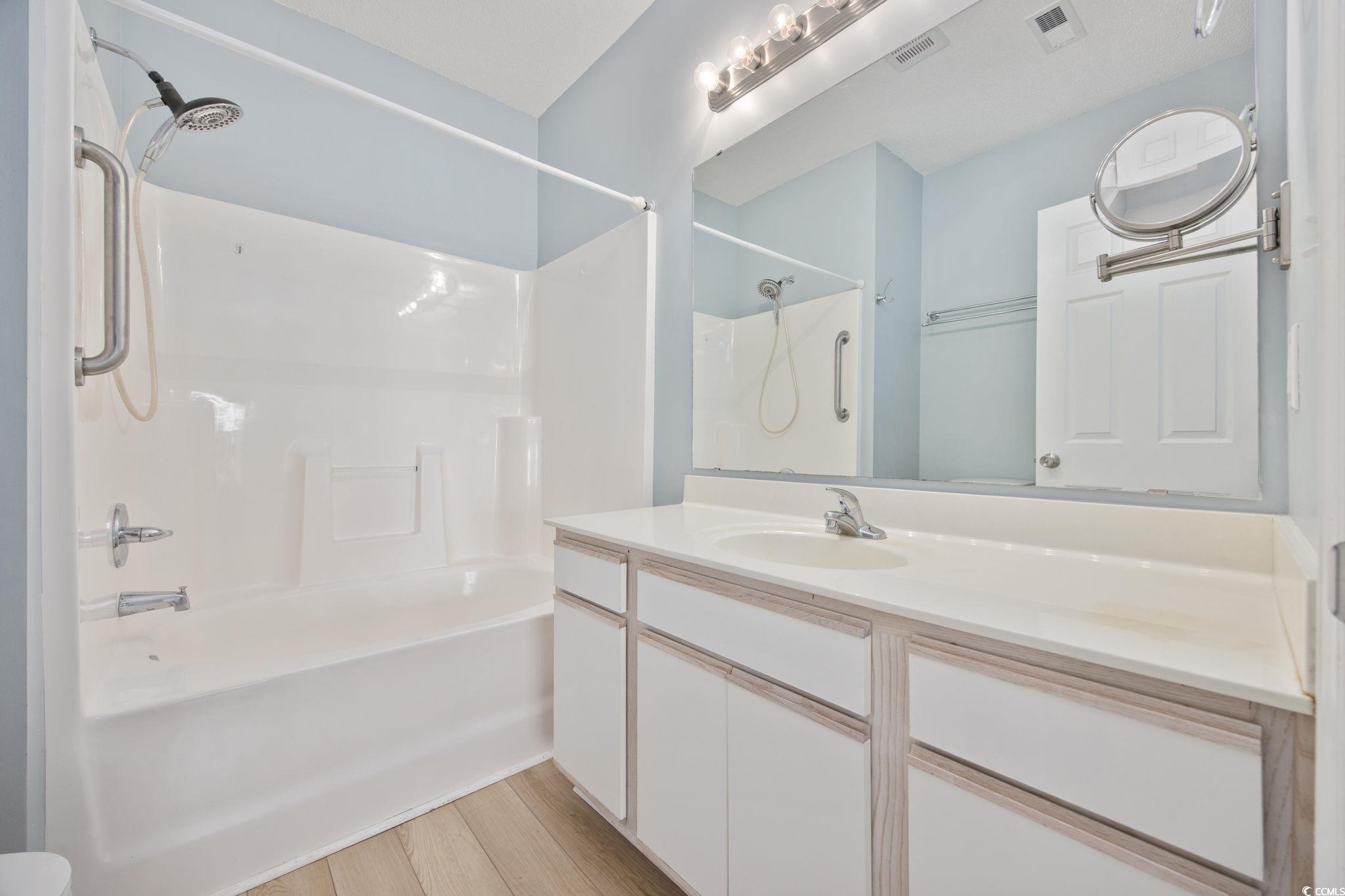 Move In Ready! First-floor! End-unit! Carolina Forest Condo living at its best! This bright, spacious, and meticulously cared-for 3BR/2BA condo in Windsor Green at Carolina Forest is looking for new owners. Offering an open layout with a smart split-bedroom design and a serene screened porch overlooking a peaceful pond, this home checks so many boxes. Attractive LVP flooring in the foyer leads to two well-sized guest bedrooms, each with ceiling fans. One features its own walk-in closet and LVP floors. The nearby full bath offers LVP flooring, a comfort-height toilet, and a tub/shower combination. The kitchen is filled with natural light and includes stainless steel appliances, granite countertops, pendant lighting, abundant cabinetry, and a breakfast bar. A separate laundry room sits just off the kitchen and comes complete with a full-size washer and dryer, plus a roomy storage rack. The living and dining areas sit between the guest rooms and the primary suite, and this end-unit’s extra windows, along with the double sliding doors, flood the space with sunlight. Both the living room and primary bedroom enjoy pond views and direct access to the screened porch. The primary suite also features a spacious walk-in closet and an ensuite bath with linen storage and a tub/shower combo. An additional outdoor storage closet is located on the front porch. Windsor Green offers an outdoor pool, playground, recreation center, and beautifully maintained grounds. This community is ideally situated near Tanger Outlets, local and national dining options, golf courses, and walking/biking paths along the boulevard. Just a short drive to the beach and MYR airport. Whether you’re seeking a coastal getaway, a primary home, or an investment opportunity, this condo is a standout. Book your private showing today! **Some photos virtually staged or digitally altered.**