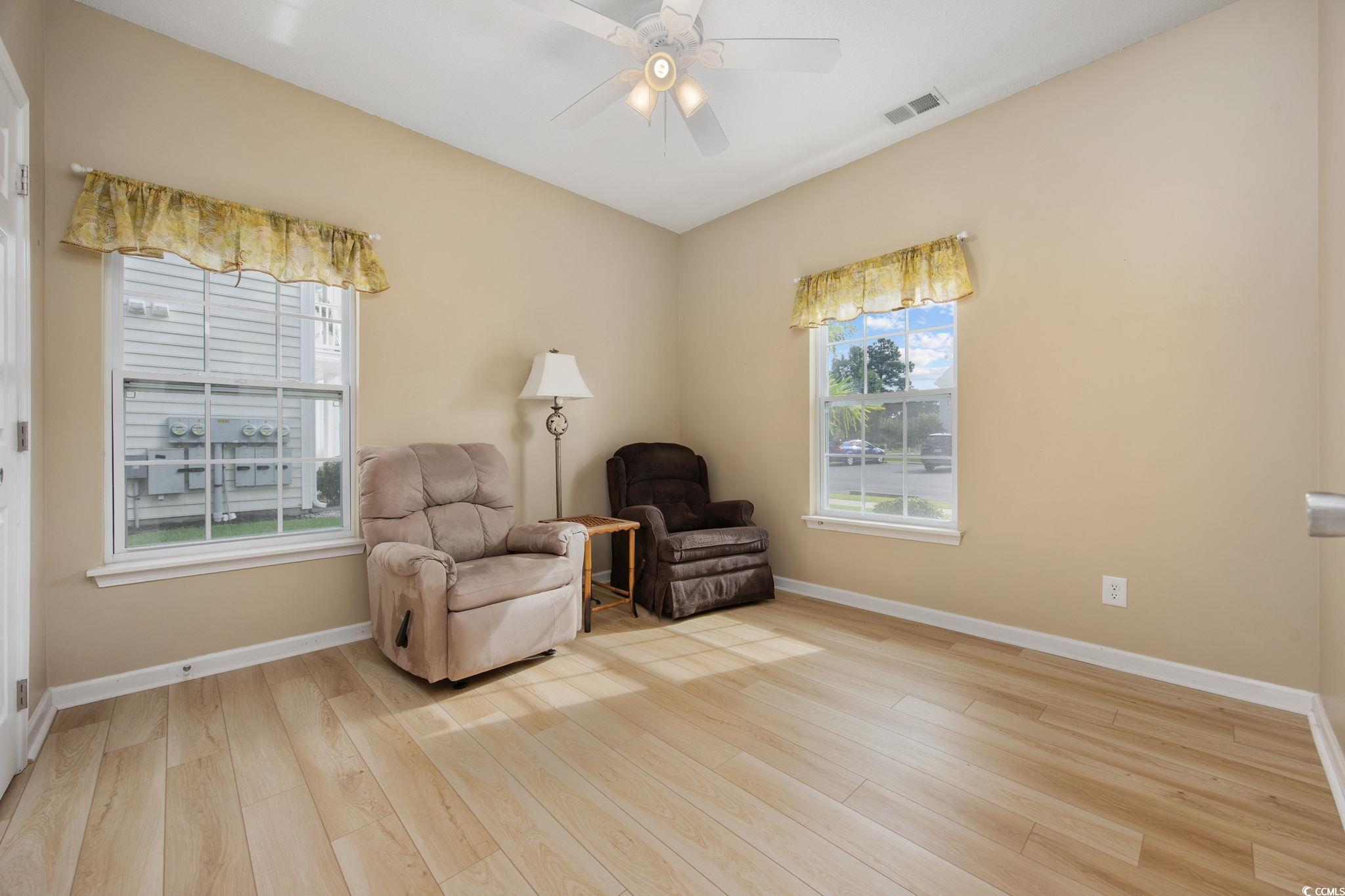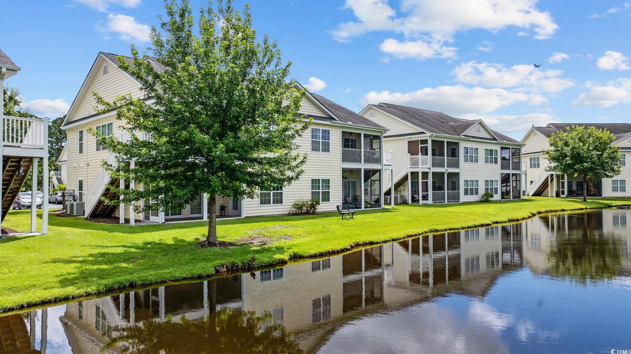 First-floor and end-unit living at its best! This bright, spacious, and meticulously cared-for 3BR/2BA condo in Windsor Green at Carolina Forest is looking for new owners. Offering an open layout with a smart split-bedroom design and a serene screened porch overlooking a peaceful pond, this home checks so many boxes. Attractive LVP flooring in the foyer leads to two well-sized guest bedrooms, each with ceiling fans. One features its own walk-in closet and LVP floors. The nearby full bath offers LVP flooring, a comfort-height toilet, and a tub/shower combination. The kitchen is filled with natural light and includes stainless steel appliances, granite countertops, pendant lighting, abundant cabinetry, and a breakfast bar. A separate laundry room sits just off the kitchen and comes complete with a full-size washer and dryer, plus a roomy storage rack. The living and dining areas sit between the guest rooms and the primary suite, and this end-unit’s extra windows, along with the double sliding doors, flood the space with sunlight. Both the living room and primary bedroom enjoy pond views and direct access to the screened porch. The primary suite also features a spacious walk-in closet and an ensuite bath with linen storage and a tub/shower combo. An additional outdoor storage closet is located on the front porch. Windsor Green offers an outdoor pool, playground, recreation center, and beautifully maintained grounds. This community is ideally situated near Tanger Outlets, local and national dining options, golf courses, and walking/biking paths along the boulevard. Just a short drive to the beach and MYR airport. Whether you’re seeking a coastal getaway, a primary home, or an investment opportunity, this condo is a standout. Book your private showing today! **Some photos virtually staged or digitally altered.**