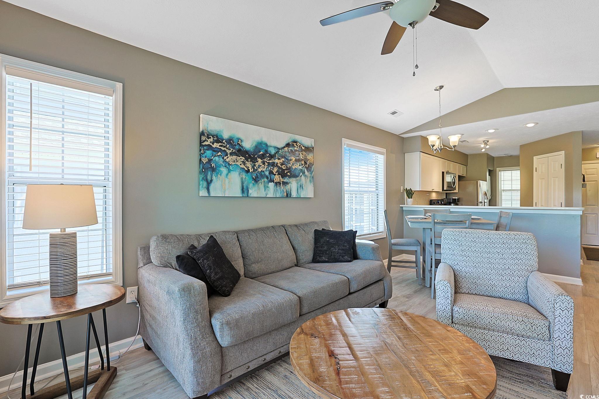 Introducing this well kept end unit 2 bedroom 2 bathroom condo in the River Oaks Condo community. From your balcony you can enjoy tranquil lake & golf views. Inside you will find wood look LVP flooring, stylish furnishings, vaulted ceilings with fans, a classic living/dining room that showcases a sliding glass door that opens up to the relaxing balcony. The family friendly kitchen is equipped with a stainless steel appliance package, breakfast bar, practical pantry, quartz countertops, tile backsplash, laundry nook, along with ample cabinet spaces. The primary bedroom includes a double bi-fold door closet, ceiling fan, private access to the primary bath that features a vanity with a single sink & makeup desk, and a water closet with a timeless step-in shower. This delightful condo is completed with an additional bedroom, full guest bath, and a common area closet. This condo affords you easy access to the beach and golfing along with all of the other activities and happenings inMyrtle Beach including fun eateries, award winning off-Broadway shows, public fishing piers, and intriguing shopping adventures along the Grand Strand. Conveniently located to your everyday needs, including grocery stores, banks, post offices, medical centers, doctors’ offices, and pharmacies. Check out our state of the art 3-D Virtual Tour.