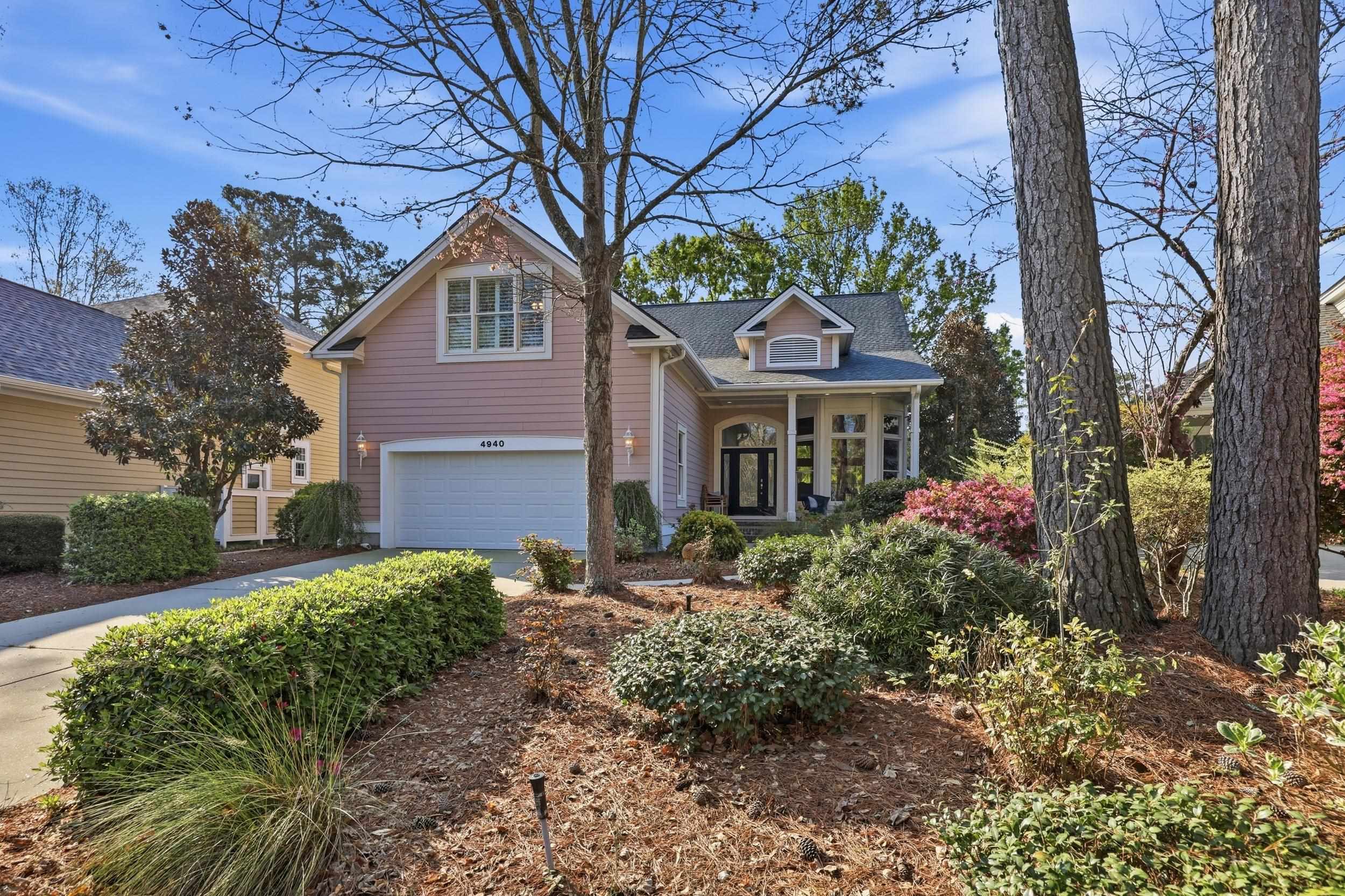 Beautiful 3BR 2.5BA Lowcountry style home in Tidewater Plantation featuring rare pond views and a private wooded setting. Enjoy peaceful water views from the living room, breakfast area, screened porch, and main level primary suite. Open floor plan with vaulted ceilings, engineered hardwood flooring, crown molding, and a fireplace with gas logs. The kitchen offers 42” cabinetry, two pantries, excellent storage, and flows seamlessly into the main living spaces. The primary suite is located on the first floor and includes dual closets and a spacious bath with convenient access to the oversized laundry room. Upstairs provides flexible space ideal for guests, plus additional storage including a climate controlled bonus room. Additional features include Andersen low E windows, central vacuum system, large covered front porch, screened in lanai, irrigation system, two car garage, dual HVAC units. Located in a 24 hour gated golf community offering pools, tennis courts, fitness center, on site dining, and private oceanfront beach cabana access. Just minutes to the beach!