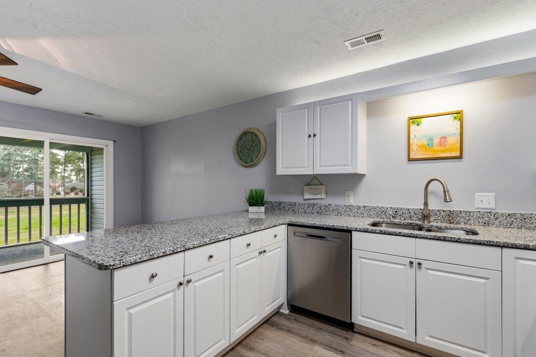 Modern Elegance at Island Green: Fully Renovated & Turnkey. Welcome to 500 Fairway Village Dr, Unit 8M, a meticulously renovated coastal sanctuary that feels like a brand-new home. Used exclusively as a private second home, this unit has been transformed with high-end finishes and unique structural upgrades that set it apart from anything else in the Fairway Village community. Step inside to a bright, modern aesthetic where every detail has been addressed: Brand-new LVP flooring flows throughout the space, complemented by a fresh, contemporary paint palette and all-new, stylish light fixtures. Completely reimagined with stunning new granite countertops and a full suite of new stainless-steel appliances. Forget the standard popcorn texture, every ceiling in the home has been professionally redone for a clean, modern look. A refreshed and updated bathroom offers a spa-like feel. Unit 8M offers features you won't find in standard Island Green layouts: The bedroom ceiling was intelligently converted to a drop-down design to accommodate new attic stairs, providing rare and valuable attic storage space. New, high-quality sliding glass doors lead out to the porch, improving insulation and ease of use. Enjoy the coastal breeze on your large screened-in porch. This expansive outdoor living area serves as a private oasis for morning coffee or evening cocktails, overlooking the tranquil, gated grounds of the Island Green community. With its rare attic storage, high-end renovations, and the pristine feel of a private second home, this turnkey gem is a must-see that won't stay on the market for long.