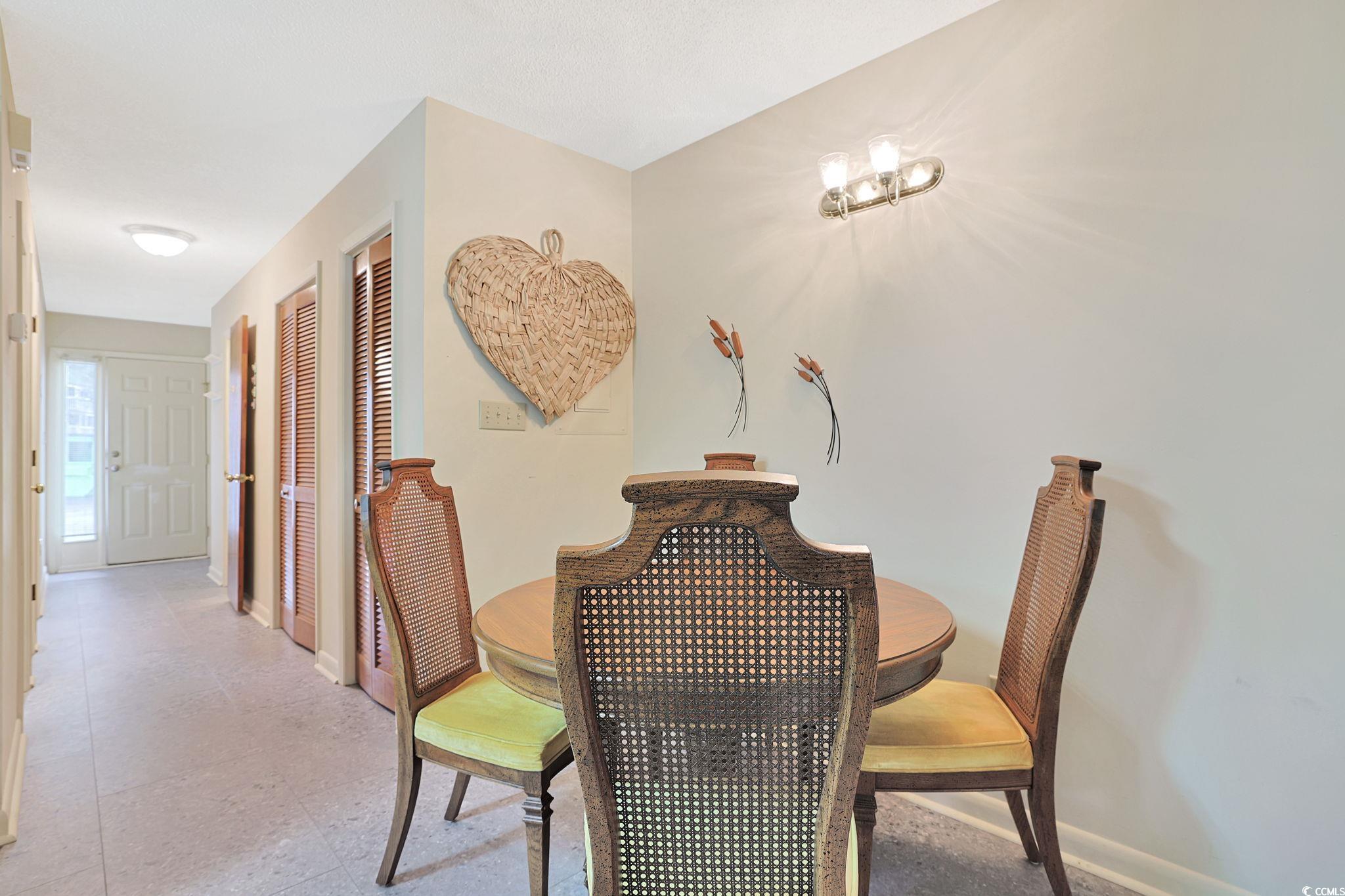Presenting this comfortable first floor end unit 1 bedroom 1.5 bath condo located in the desirable Fairway Village complex in the Island Green community. This delightful condo features LVP and ceramic tile flooring, a guest powder room, laundry closet with a stackable wash/dryer, extra closet spaces, an inviting living room with a ceiling fan that showcases a sliding glass door that opens up to the peaceful Carolina room, insulated and with new windows. The kitchen is equipped with a range, dishwasher, refrigerator, a breakfast bar, ample cabinet spaces with new doors & drawers, and a dining area. The primary bedroom offers a ceiling fan and a double bi-fold door closet. The primary bath includes a single sink vanity, a comfort station, a classic tub/shower combo. This condo affords you easy access to the beach and golfing along with all of the other activities and happenings in Myrtle Beach including fun eateries, award winning off-Broadway shows, public fishing piers, and intriguing shopping adventures along the Grand Strand. Conveniently located to your everyday needs, including grocery stores, banks, post offices, medical centers, doctors’ offices, and pharmacies. Check out our state of the art 3-D Virtual Tour.