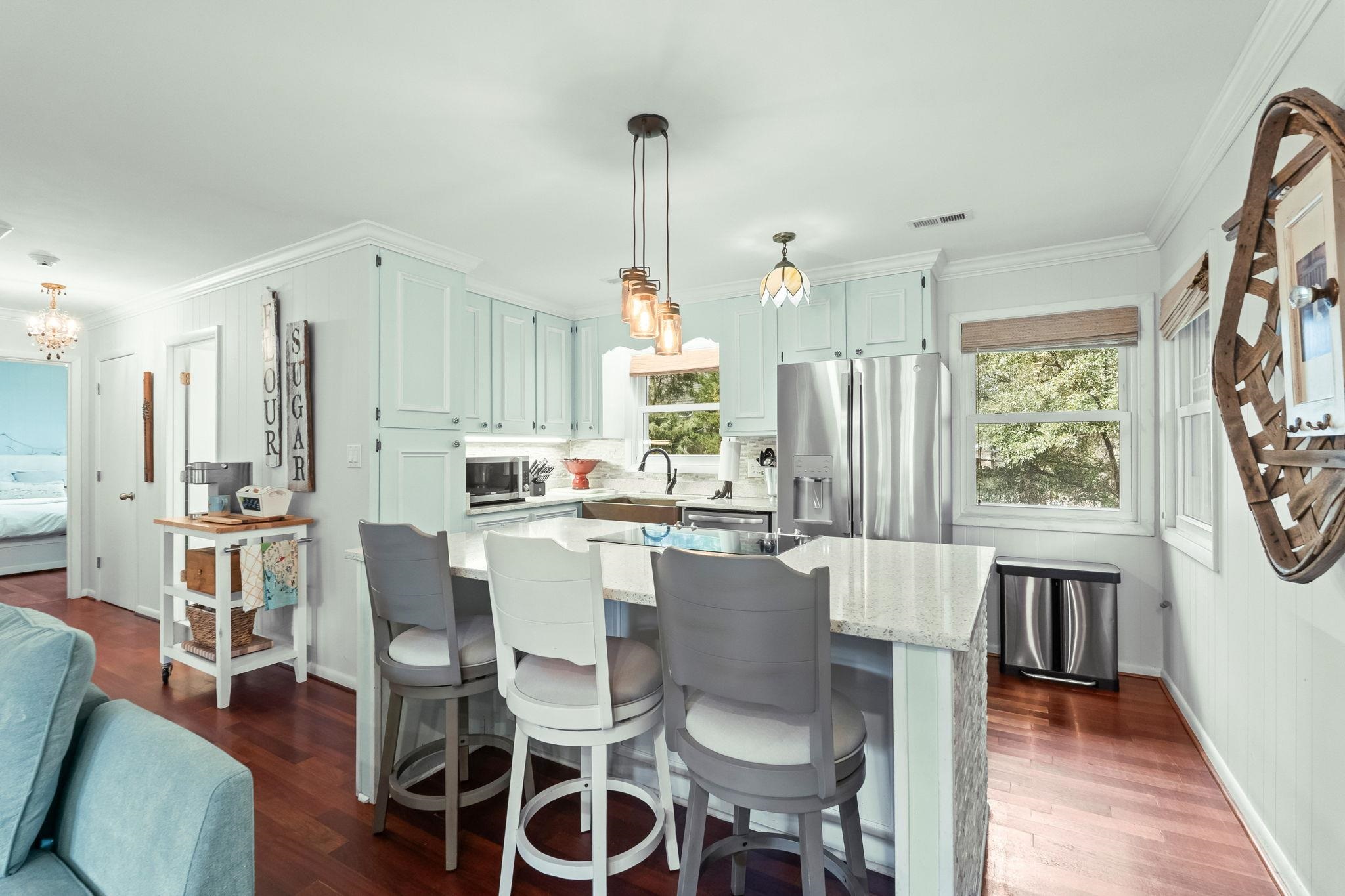 Coastal. Spacious. Well-maintained. 500 Roller Coaster Lane in the Ocean Drive section of North Myrtle Beach offers a 2400 heated sqft 4-bedroom, 3-bath home just a short walk or golf cart ride to the beach, with no HOA and no HOA fees. Sold furnished. This 2-story, 4-sided brick residence sits beneath mature oak trees and features a large paver driveway, carport, covered storage area for golf cart, bikes and/or beach gear, and a metal roof installed in 2018 with gutter guards installed in 2025. Major systems include two heat pumps with the upstairs unit replaced in 2022 and a hot water heater installed in 2023. Smooth ceilings run throughout, and a security system is in place. Property is not in a high-risk flood zone (Flood Zone X). The 1st level includes 2 bedrooms and 1 renovated bathroom. Wood-like tile flooring extends throughout, creating a durable and cohesive space ideal for beach living. The combined family room, dining area, and wet bar (includes sink and 2024 refrigerator) provide flexibility for everyday living or entertaining as the party spills out into the fully fenced backyard. This area could also be used as a Recreation Room. The updated bathroom has a 5’ tiled shower with seat and glass doors, all new vanity, toilet, lighting, and plumbing fixtures. 2 bedrooms: the first is set up as a guest bedroom while the 2nd is currently used as a double office (easily used as a bedroom too). The laundry room includes a side-by-side washer and dryer (new in 2024) along with a convenient laundry chute from the upstairs hall bath. Upstairs you have another 2 bedrooms and 2 full baths both with stylish ceiling fans. The ¾” tongue-and-groove cherry wood floors add warmth and character. The kitchen, living room and dining area have an open concept with tons of natural sunlight. The kitchen is designed for both function and style with granite countertops, a copper farmhouse sink and backsplash, stainless steel appliances including a French door refrigerator (2025) and Frigidaire dishwasher, and a center island with range and breakfast bar seating. The spacious 17'x 11' living room has comfortable seating and a wall mounted TV. The adjacent dining area offers attractive outdoor views and direct access to a large 12'x20' deck over the carport, ideal for grilling, entertaining, or enjoying both coastal days and evenings. The primary bedroom features a pocket door, ceiling fan and a renovated (2023) en-suite bath with barn door entry, tiled shower with sliding glass doors, new vanity, updated light & plumbing fixtures, and new tile flooring. The additional guest bedroom includes a ceiling fan and easy access to the hall bath with tile floors, updated toilet, and shower. The fully fenced backyard is designed for low maintenance, entertaining and privacy with a 6’ privacy fence and two gates on either side of house (one double, one single). River rock landscaping, paver walkways and patio areas, and Astroturf-style grass eliminate the need for grass maintenance. A hot tub creates a relaxing retreat after a day at the beach. A detached shed for additional storage. In the front of the house, there is a swing and an outdoor shower that makes rinsing off sand easy and convenient as you come in from the beach. This home offers flexibility for primary residence, second home, or investment in one of North Myrtle Beach’s most desirable areas. Short-term rentals, long-term rentals, pets, motorcycles and golf carts are all allowed. Come see this beautifully, well-maintained beach home so close to everything North Myrtle Beach has to offer: parks, shopping, restaurants, fishing, golfing, entertainment…and don’t forget the amazing Intracoastal Waterway and the oh-so-close sandy beaches of the Atlantic Ocean! Schedule your showing today and secure your place near the ocean.