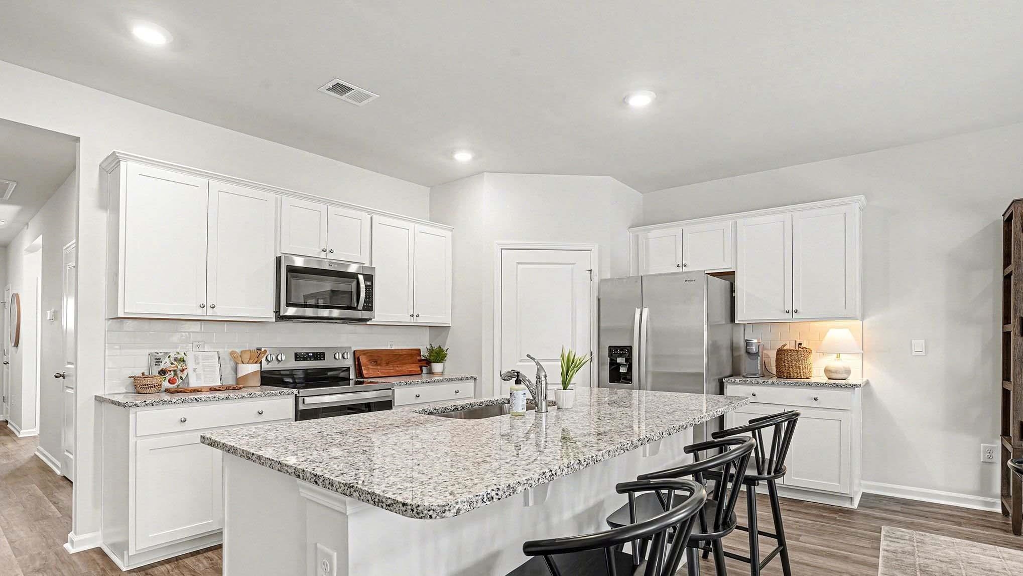Welcome to Auberon Woods located off Highway 90 with easy access to numerous restaurants, shopping centers, attractions, golf courses, and beaches. This thoughtfully designed one level home is one of our most popular floor plans! With an open concept living room, dining room and kitchen, this home is bright, spacious, and designed for entertaining guest or comfortably interacting with family. The kitchen features granite countertops, a tile backsplash, 36" cabinets, a walk in corner pantry, stainless steel appliances including a refrigerator, and island with breakfast bar! Your primary suite awaits off the back of the home with a spacious walk-in closet and master bath with double sinks, a linen closet and 5' shower. Three secondary bedrooms are at the front of the home providing separation from the primary suite. Enjoy the coastal air from the back porch as you wind down in the evening! 2 car garage with garage door opener. This is America's Smart Home! Each of our homes comes with an industry leading smart home technology package that will allow you to control the thermostat, front door light and lock, and video doorbell from your smartphone. *Photos are of a similar Cali home. Pictures, photographs, colors, features, and sizes are for illustration purposes only and will vary from the homes as built. Home and community information, including pricing, included features, terms, availability and amenities, are subject to change and prior sale at any time without notice or obligation. Square footage dimensions are approximate. Equal housing opportunity builder.