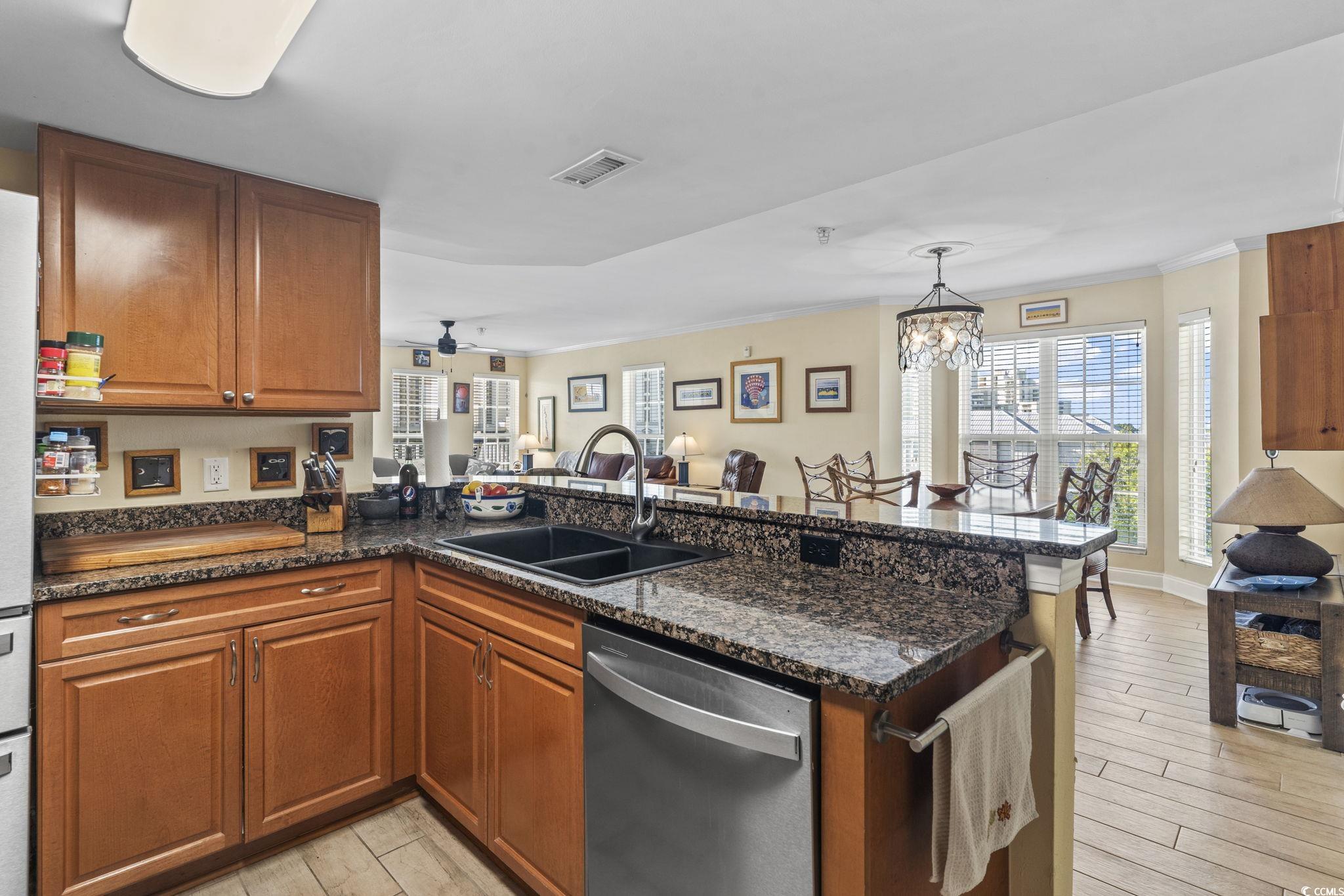 Top floor end unit. Best view in the building. This 3 bedroom, three bath unit includes Stainless Steel appliances, granite countertops, tile flooring throughout. Updated primary bath. Spectacular views of the marsh and ocean. Ocean Marsh complex features an in-ground pool, kiddie pool, and jacuzzi, picnic area. Complex is nicely landscaped with 2 elevators and covered parking. Take a golf cart or simply walk to the ocean and Barefoot Landing. Don't miss this special opportunity.