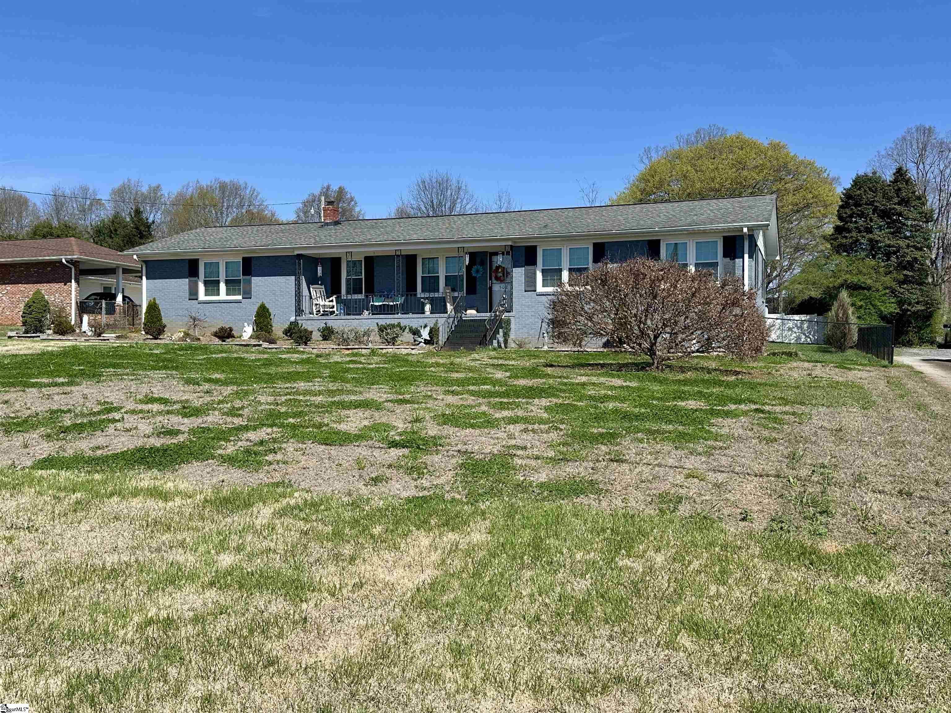 This updated BRICK ranch dream home is situated atop a ridge in a walkable area on almost a HALF ACRE. PROFESSIONALLY LANDSCAPED with beautiful butterfly bushes, camellia, dogwood trees, Japanese maple and more - it includes A NEW SPRINKLER SYSTEM and paving stone curved walkway leading to the ROCKING CHAIR FRONT PORCH. You will be charmed as you step inside to the RECENTLY PAINTED interior and captivated by the natural light spilling in through the nearby NEW SUNROOM. In fact, the entire home has been fitted with NEW WINDOWS all around. Perfect for the cooler months is the brick feature wall including a FIREPLACE with gas logs. This classic 3 bedroom 2 bath features: NO CARPET all HARDWOOD floors in main part of house, TILE in bathrooms, LVP in Sunroom; all the STAINLESS APPLIANCES in the kitchen convey with the home. The kitchen cabinets were recently painted and coordinating TILE BACKSPLASH added. Overlooking the private, FENCED backyard and soon to become one of your favorite places to relax, the recently added SUNROOM includes NEW MINI-SPLIT for heating and cooling. The HVAC in the original part of the home was NEW 2022. The attached DOUBLE GARAGE is also outfitted with a large workshop and laundry area. An OUTLET FOR GENERATOR PLUG was added within the last two years. The FENCED BACKYARD includes additional paved parking or patio space, along with a storage building. Enjoy the quiet lifestyle of NO HOA while being just minutes from all the shopping, dining, and local favorites that Easley has to offer. Take a leisurely walk along main street and to the Doodle Trail, The Silos, or the new Southern Weaving Food Hall. Walking distance to PRISMA HEALTH EASLEY BAPTIST HOSPITAL, and local school, McKissick Academy of Science and Technology. Experience the best of small-town living along with the best of small-city convenience. Don't miss the video tour and make your plans to tour in person soon - with over $50k in improvements over the last 3 years: THIS could be the ONE!