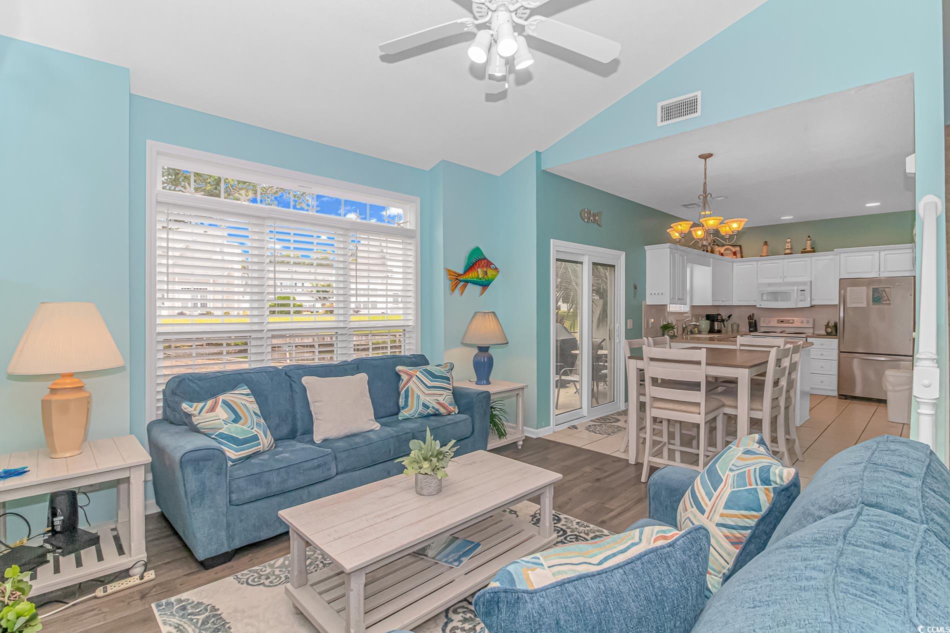 Welcome to this beautifully maintained and fully furnished townhouse-style condo in the highly sought-after Fairway Oaks community, located in the heart of Cherry Grove in North Myrtle Beach. Offering serene pond views, a move-in ready atmosphere, and a prime location just steps from the Surf Golf and Beach Club, this home is perfect as a primary residence, vacation retreat, or investment property with short-term rentals allowed. The condo features a spacious open-concept layout, with a bright and inviting living, dining, and kitchen area that’s ideal for entertaining. The large kitchen offers plenty of counter and cabinet space, a breakfast bar, and comes fully stocked with cooking utensils, plates, glassware, wine glasses, baking supplies, coffee maker, and more. The main floor also includes a half bath for guests and a dedicated laundry room with a full-size modern washer and dryer. The primary bedroom is conveniently located on the ground level and includes a king-size bed, flat-screen TV, and an ensuite bathroom with dual sinks, a tub/shower combo, and all towels and linens included. Upstairs, you’ll find two additional spacious bedrooms with three beds total, each with its own TV and shared access to a full bathroom with a tub/shower. The home features central AC, ceiling fans, a fireplace, TVs in every room with Spectrum cable or app access, wireless internet, and a queen-size sleeper sofa in the living room for extra guests. The large dining table seats six, with additional seating at the breakfast bar for four more. Step outside to enjoy the large private patio overlooking the peaceful pond and fountain. The patio includes two outdoor dining tables, six chairs, and a barbecue grill—perfect for relaxing evenings or entertaining friends and family. Fairway Oaks is a picturesque community, home to both year-round residents and vacationers. It’s a relaxing coastal escape that offers quick access to everything Cherry Grove Beach and the greater North Myrtle Beach/Myrtle Beach area has to offer. Whether you’re looking for beach days, golf outings, family fun, or an adult getaway, this location delivers. This unit is ideally located within the community, just steps from the swimming pool and playground. Fairway Oaks is also pet-friendly and golf-cart friendly, allowing both gas and electric carts, making beach access and neighborhood exploration even easier. With upgraded features, a functional layout, and a highly desirable location, this home truly has it all. Whether you're looking for a place to call home or a high-performing rental property, this one won't last long. Schedule your private showing today!