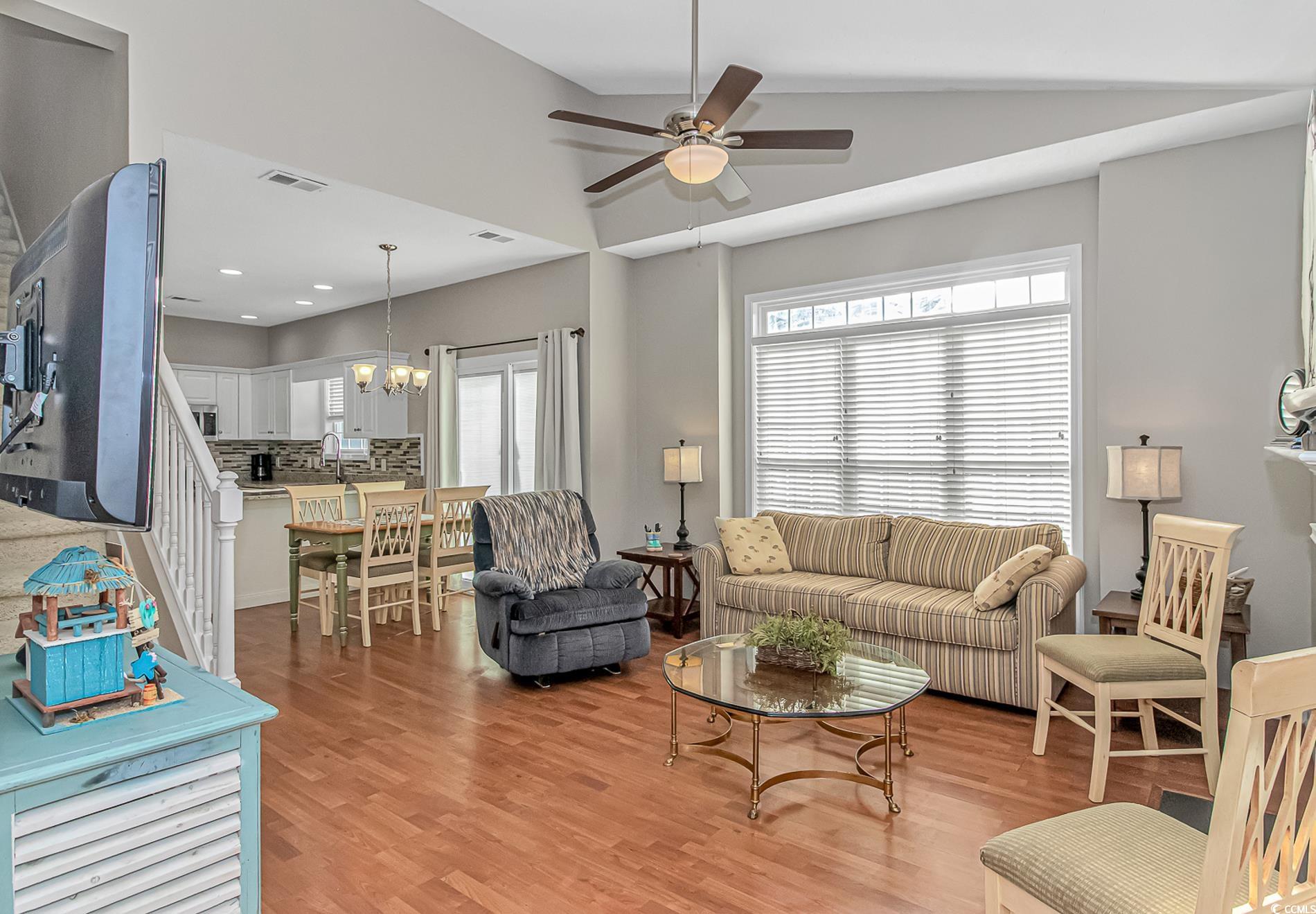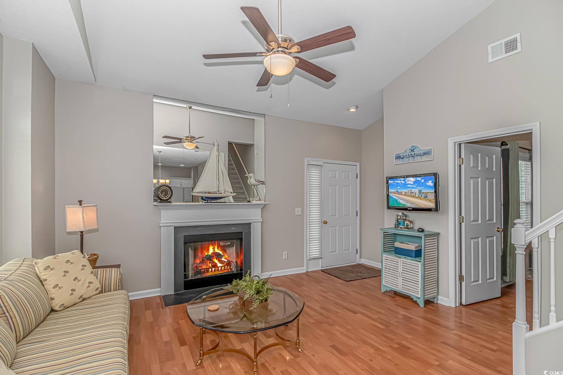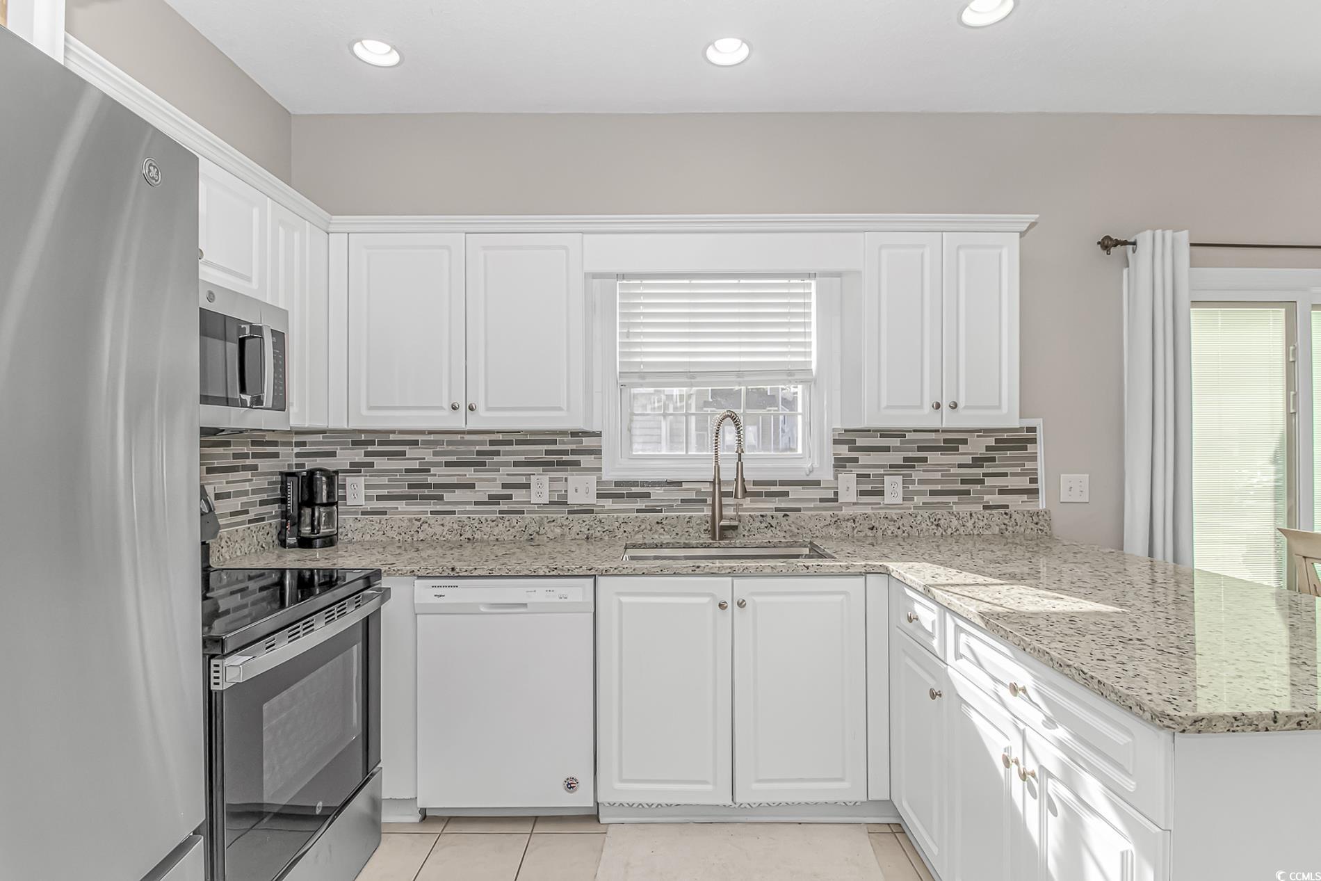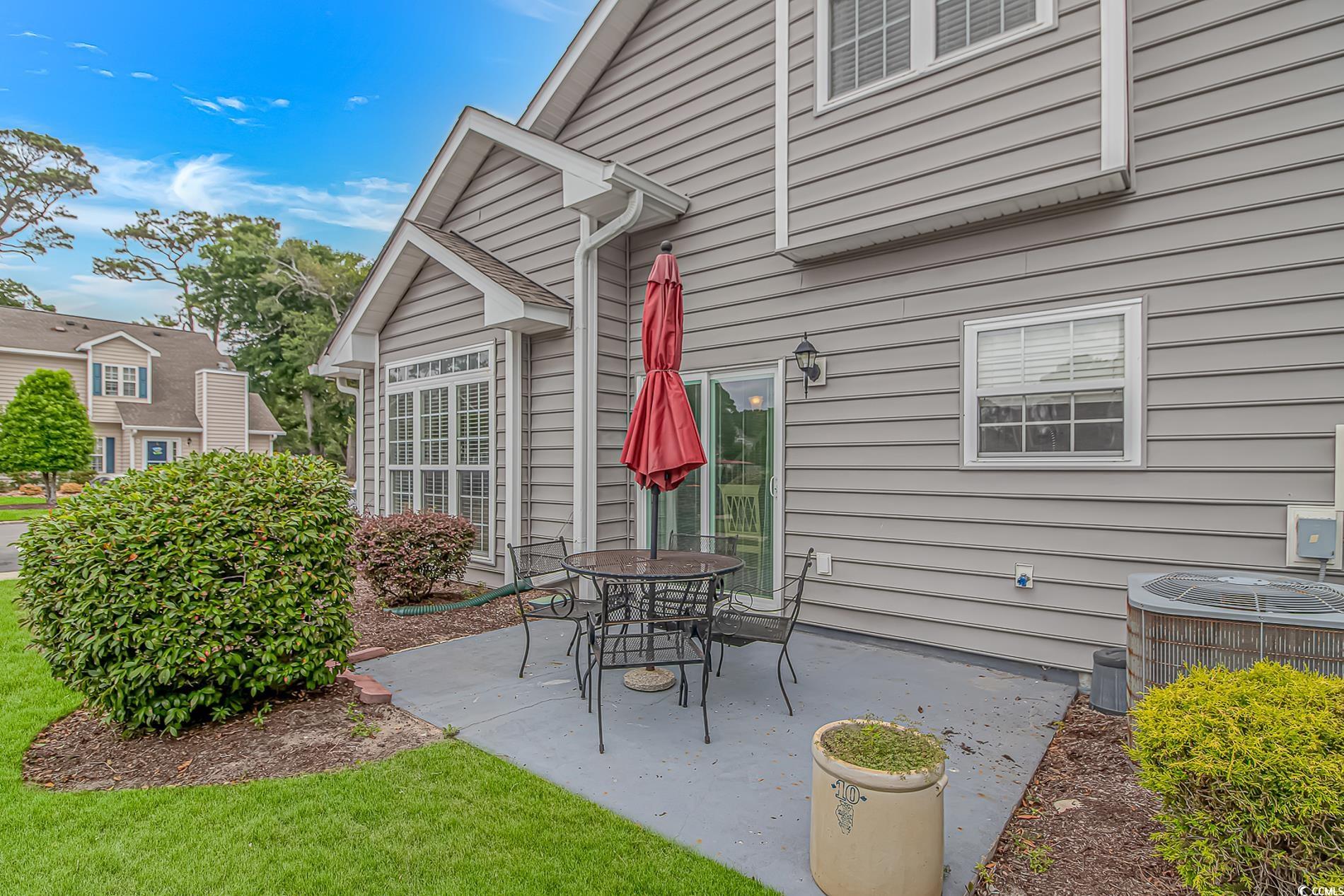 Excellent location in Cherry Grove just 3 blocks to the beach! The very well thought out floorplan includes three bedrooms and two baths with the primary bedroom on the first floor. Welcome your guests into the living area featuring a gas fireplace, high ceilings, and lots of natural light. The dining area allows access to the patio space thru new sliding glass doors with blinds between the double paned glass for ease of cleaning and a pleasing view. The gorgeous updated kitchen has solid surface counters with beautifully coordinated tiled backsplash and a large stainless steel sink with commercial sprayer type faucet, and best of all it's equipped with brand new appliances! All bedrooms are large and include generously sized walk in closets. Freshly painted interior. Golf carts are allowed in this community with access to tons of shopping, dining, and entertainment close by. Just a short 3 1/2 block walk to the beach and you can spend your days with your toes in the sand or enjoy a dip in the large community pool. This home is being sold furnished, so just bring your flip flops and you're ready to move in! All this and the washer and dryer are included too. Schedule your private showing today before this one slips away!