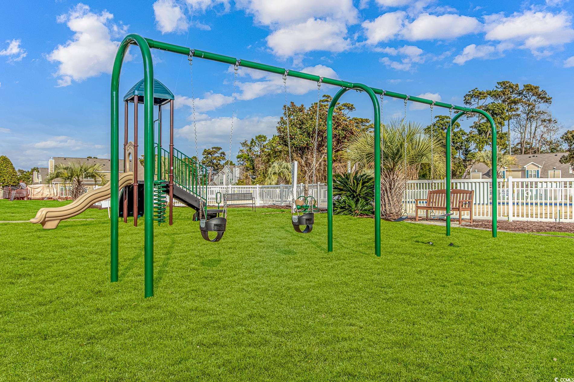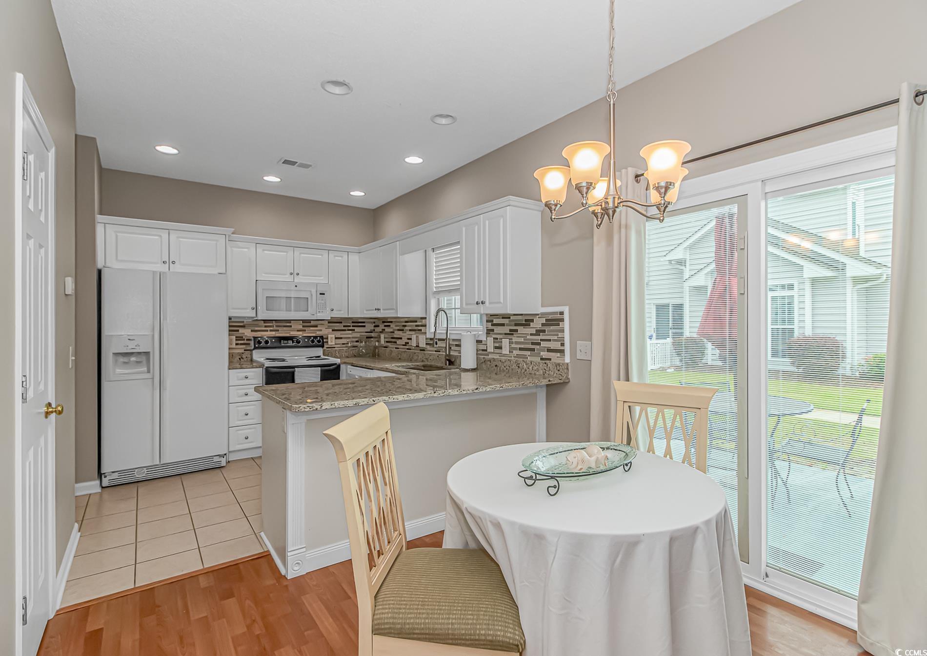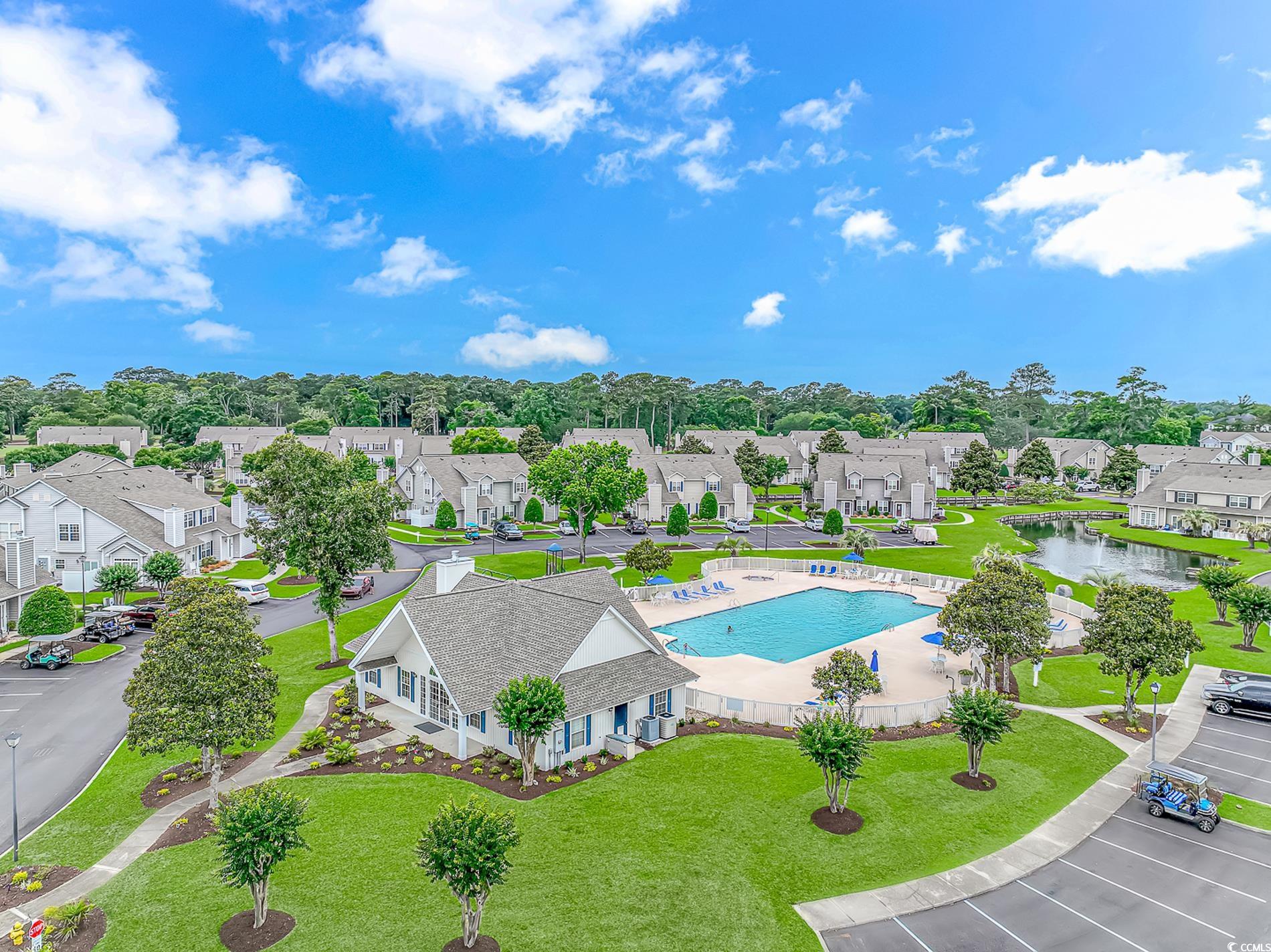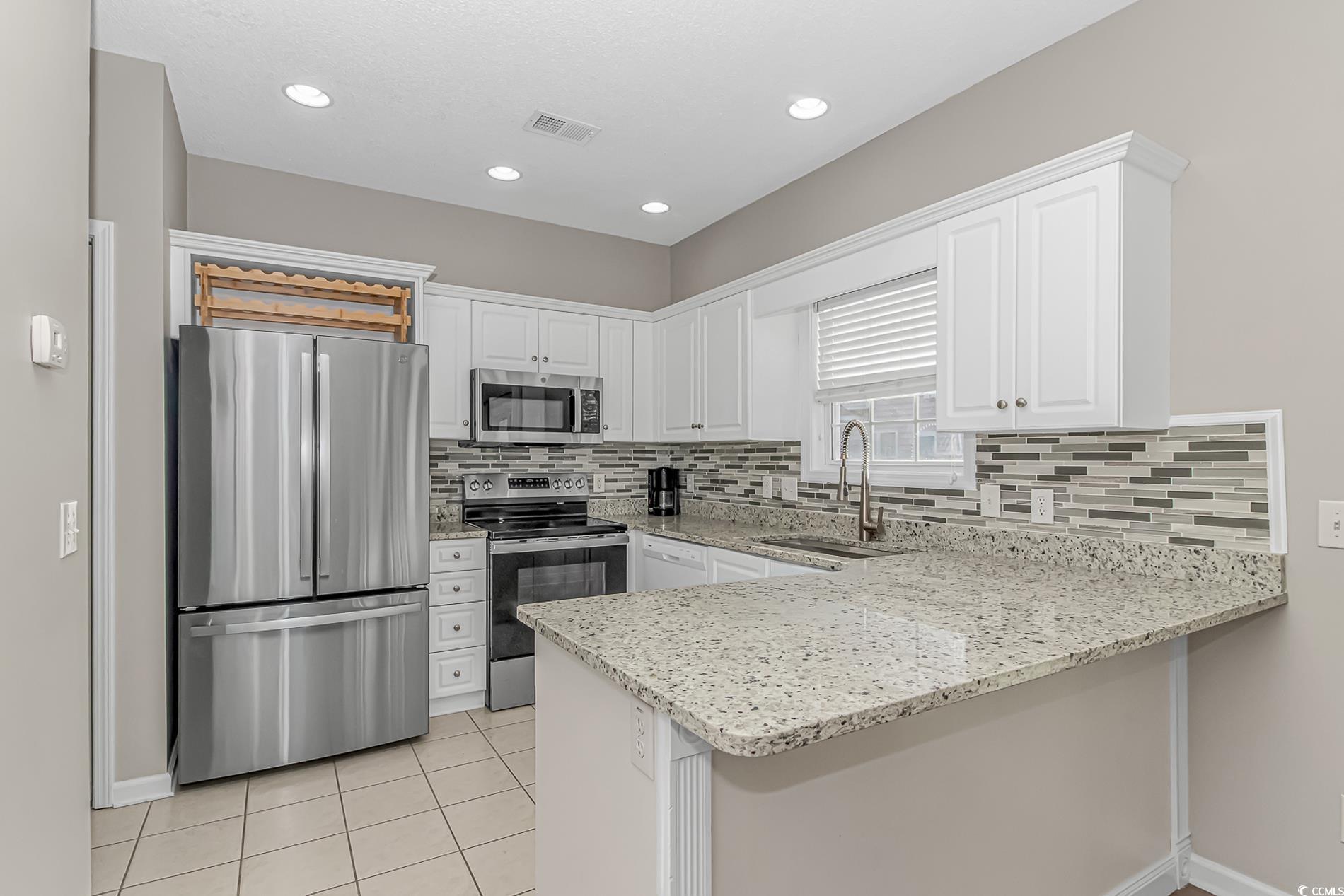 Excellent location in Cherry Grove just 3 blocks to the beach! The very well thought out floorplan includes three bedrooms and two baths with the primary bedroom on the first floor. Welcome your guests into the living area featuring a gas fireplace, high ceilings, and lots of natural light. The dining area allows access to the patio space thru new sliding glass doors with blinds between the double paned glass for ease of cleaning and a pleasing view. The gorgeous updated kitchen has solid surface counters with beautifully coordinated tiled backsplash and a large stainless steel sink with commercial sprayer type faucet, and best of all it's equipped with brand new appliances! All bedrooms are large and include generously sized walk in closets. Freshly painted interior. Golf carts are allowed in this community with access to tons of shopping, dining, and entertainment close by. Just a short 3 1/2 block walk to the beach and you can spend your days with your toes in the sand or enjoy a dip in the large community pool. This home is being sold furnished, so just bring your flip flops and you're ready to move in! All this and the washer and dryer are included too. Schedule your private showing today before this one slips away!