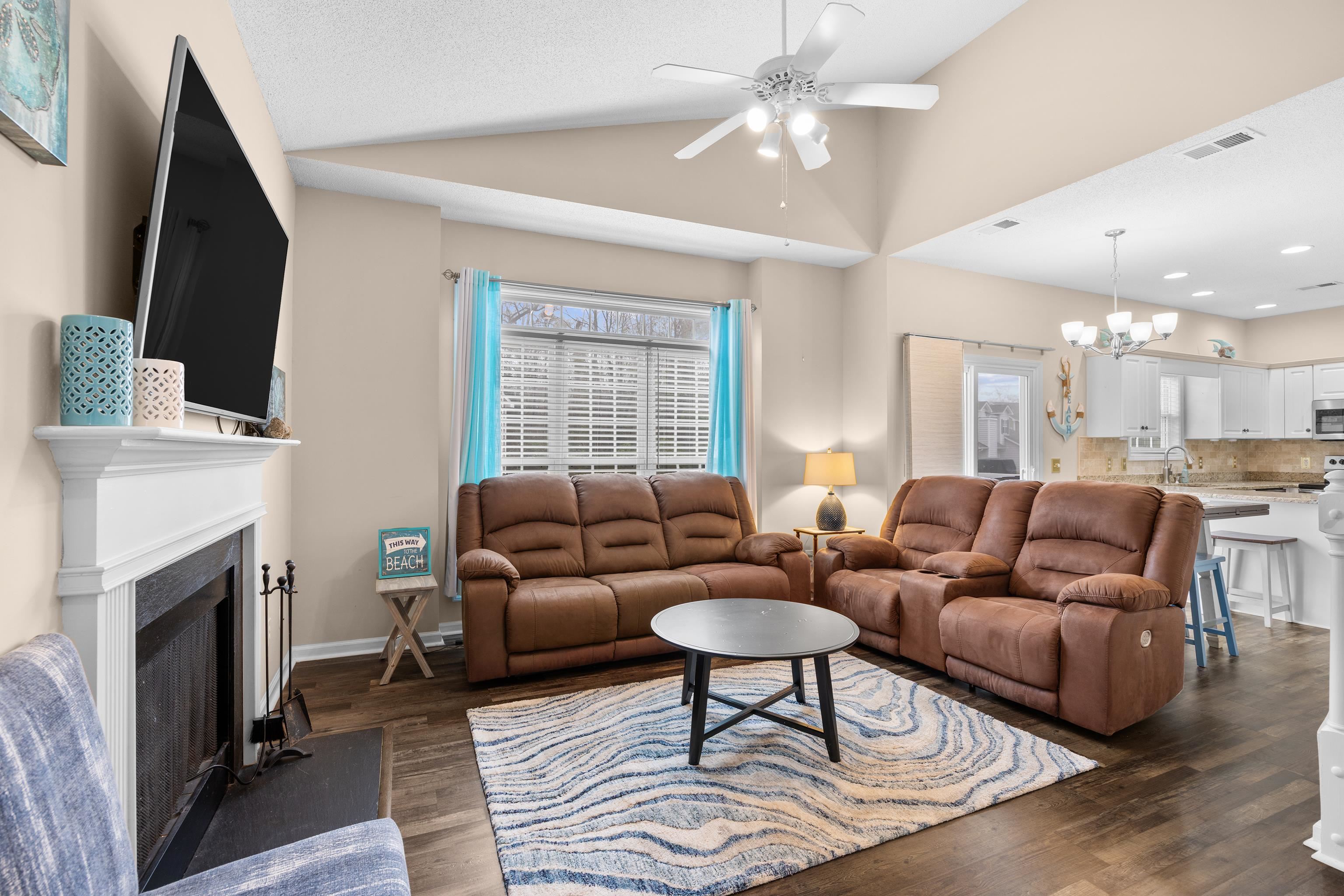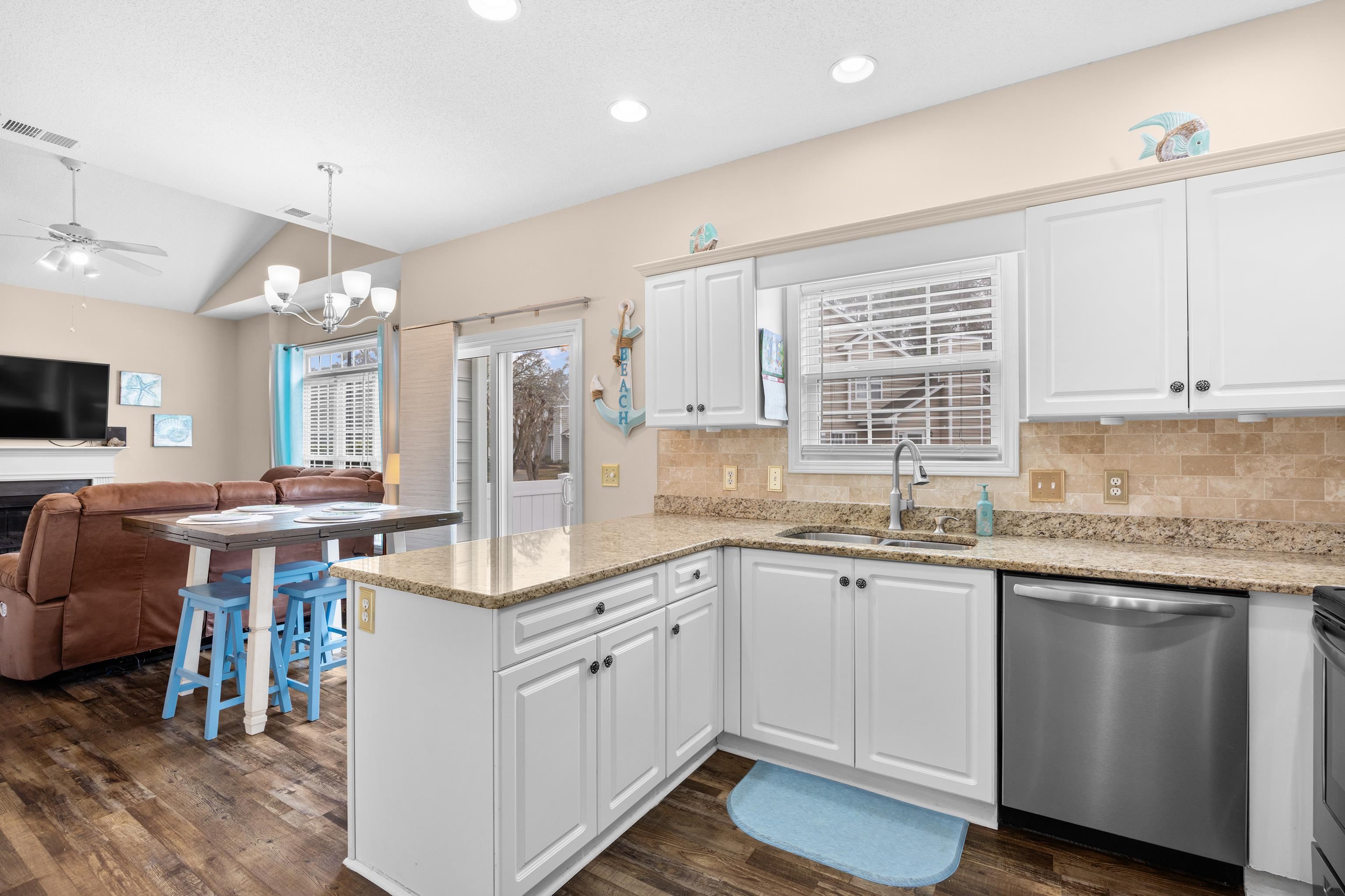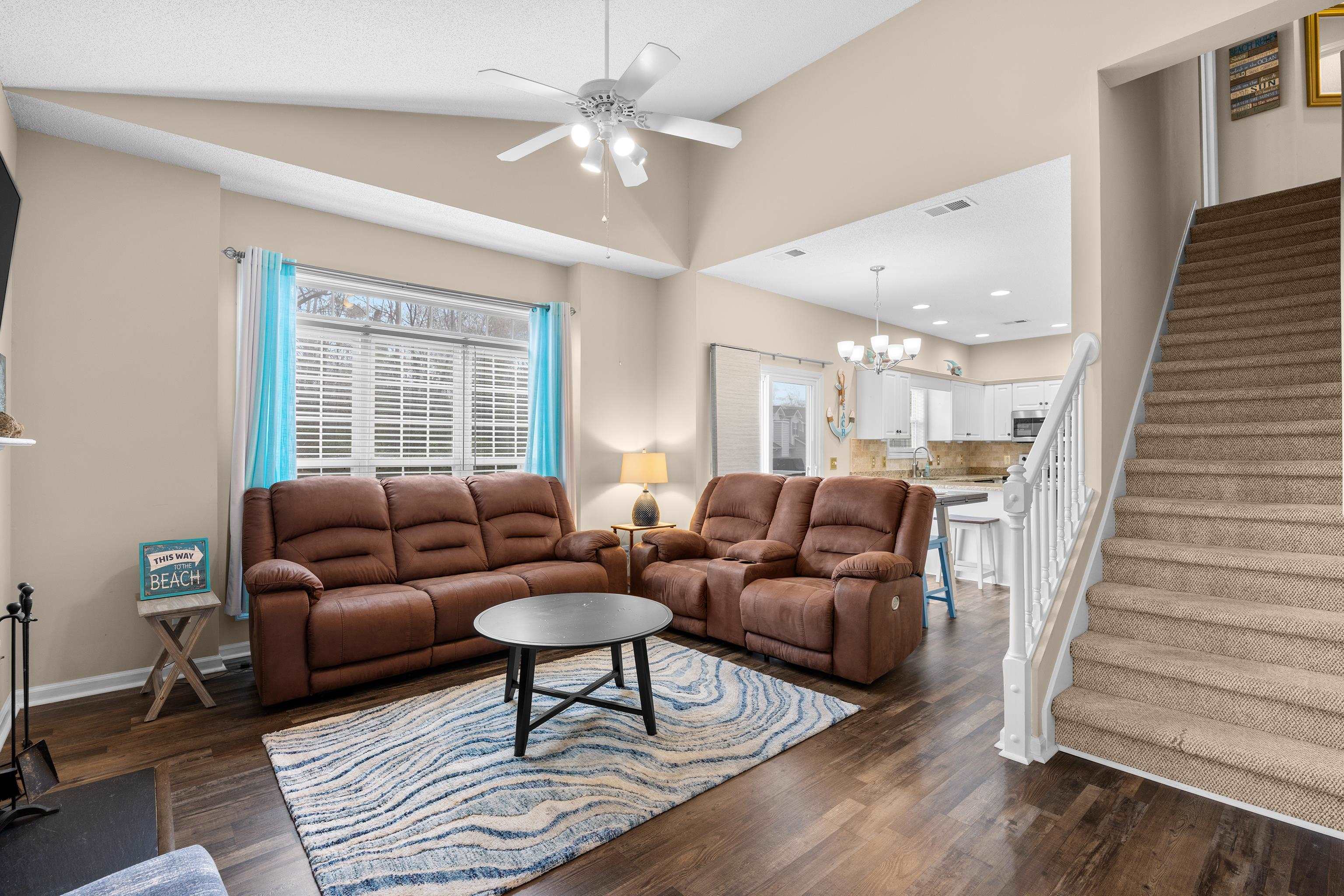 Welcome to this beautifully maintained 3-bedroom, 2-bath townhome-style condo located in the desirable Fairway Oaks community in the Cherry Grove section of North Myrtle Beach. Just a short golf cart ride to the beach, this spacious home offers the perfect blend of coastal living and comfort. The open-concept floor plan features a bright living area with vaulted ceilings and a cozy fireplace that flows seamlessly into the dining space and kitchen, complete with granite countertops, tile backsplash, and stainless-steel appliances. The first-floor suite includes a walk-in closet and updated bath with a walk-in shower, while two additional guest bedrooms and a full bath are located upstairs, providing privacy for family and guests. Enjoy relaxing outdoors on the private patio overlooking peaceful golf course views. Fairway Oaks offers great amenities including a community pool, clubhouse, and golf-cart-friendly access to nearby beaches, shopping, dining, and entertainment. Whether you're looking for a primary residence, vacation getaway, or investment opportunity, this property offers excellent versatility in a sought-after coastal location.