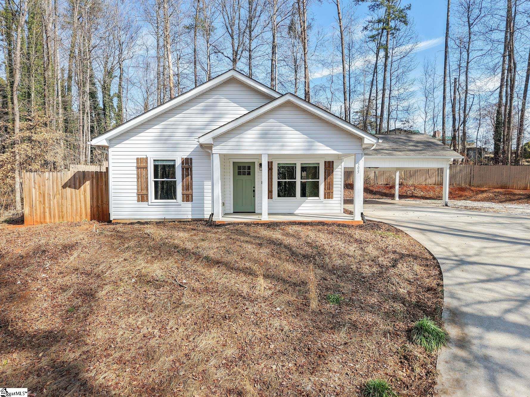 Two-year-old home situated on approximately .66 acres with a private wooded setting and long concrete driveway. Built in 2022, this home presents in like-new condition with modern finishes and an open layout. The main living area features vaulted ceilings, recessed lighting, ceiling fan, and durable plank flooring throughout. The kitchen includes white cabinetry, granite countertops, stainless steel appliances, pendant lighting, and a center island with bar seating. Open flow between kitchen and living space allows for flexible furniture placement and everyday functionality. Exterior features include a covered front porch, covered side parking area, and extended concrete driveway. The lot offers a wooded backdrop providing separation from neighboring properties while still being conveniently located near town.