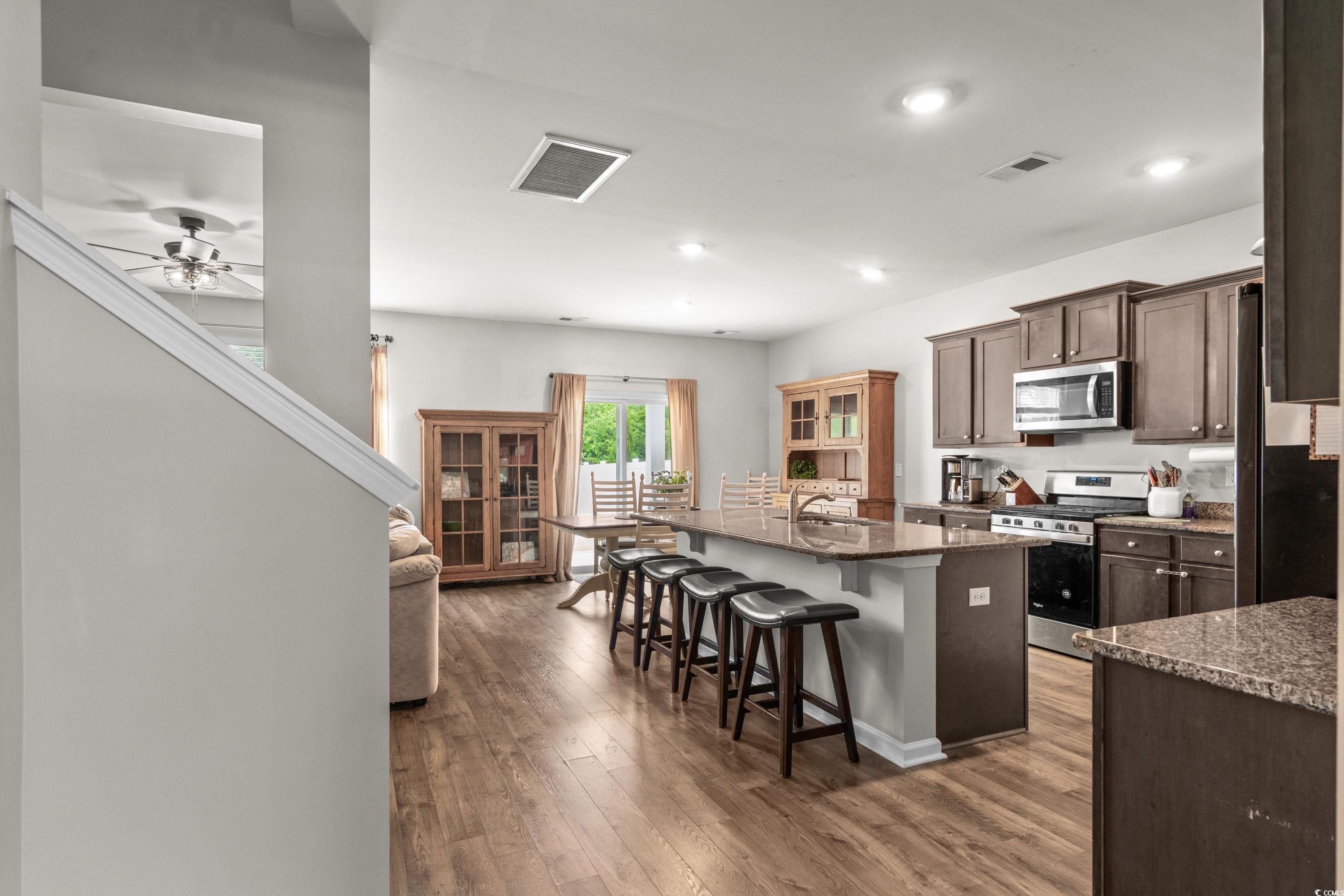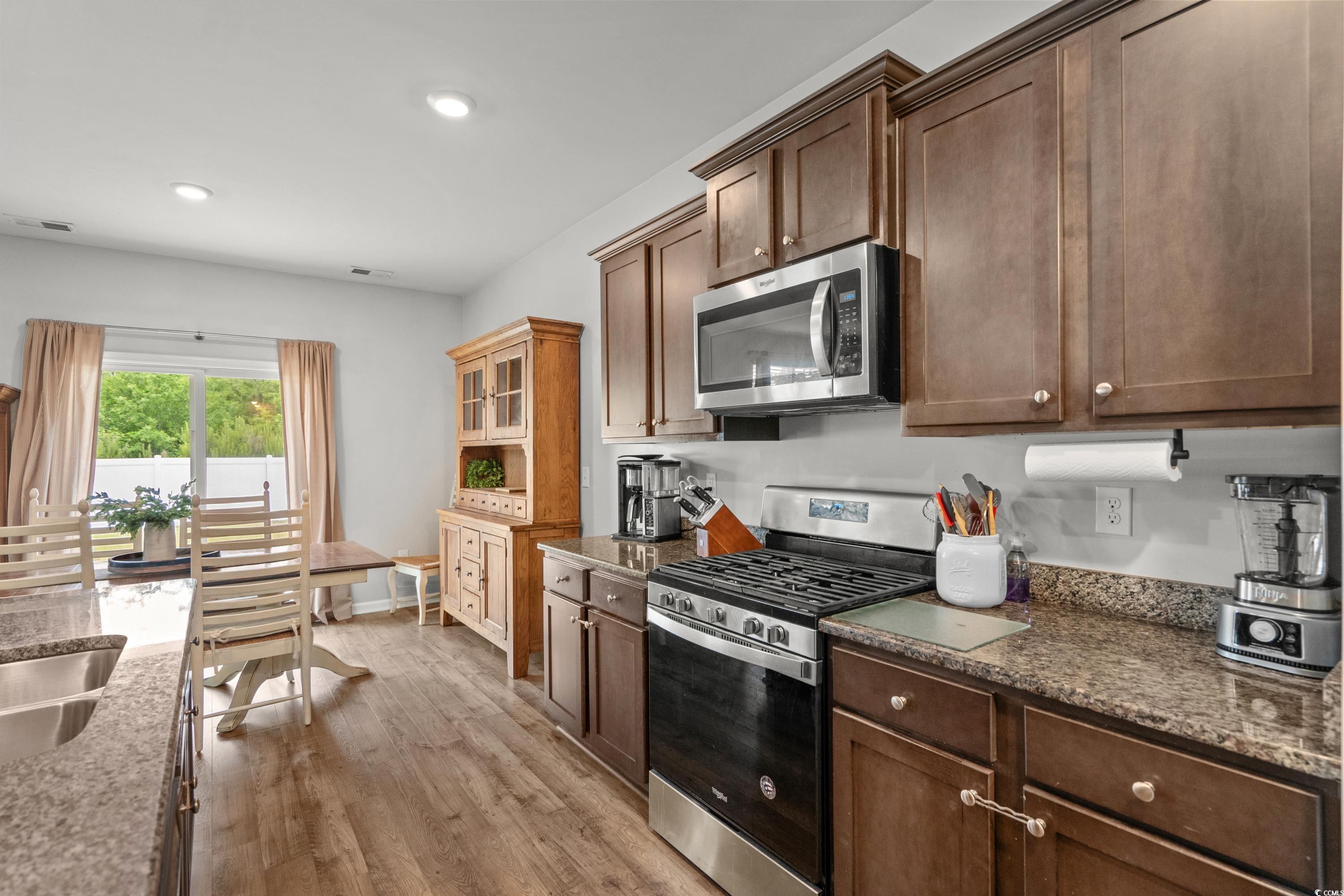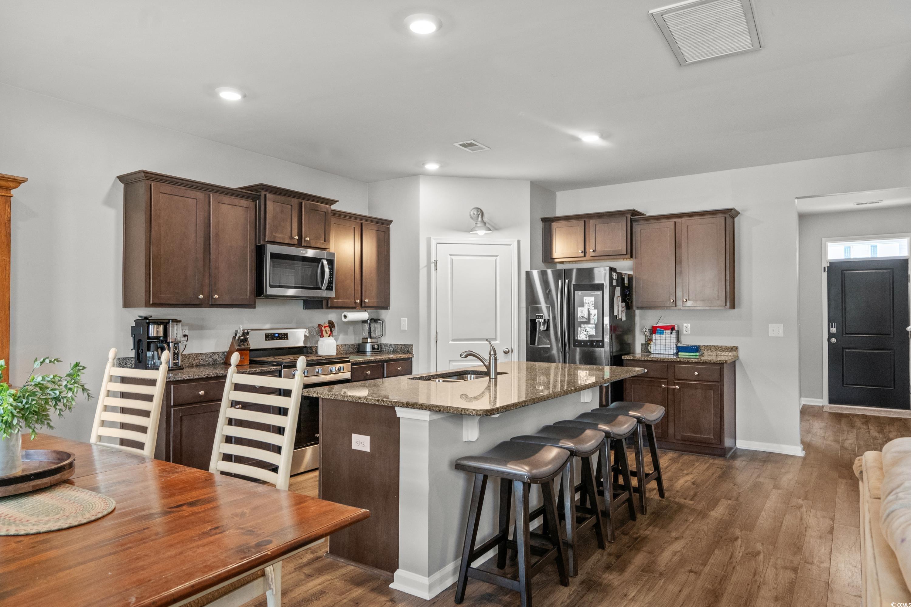 OPEN HOUSE: Sun 11/9 from 1-3PM. This beautiful traditional 2 story home has it all and is conveniently located in The Parks at Carolina Forest! This home contains 5 spacious bedrooms and 3 full bathrooms with a bonus flex room on the second floor. As you enter the home you are greeted with a large, well designed open floor plan that has plenty of space for the whole family to enjoy. The kitchen contains sleek granite countertops and stainless steel appliances and an oversized pantry with plenty of storage space. The kitchen opens elegantly into the dining room/ spacious living room space. In addition, there is a formal dining room / additional flex place on the first floor. Great for entertaining all! The home contains durable LVP floors throughout the first floor main living spaces and comfortable carpeting on the second floor. There is 1 bedroom and a full bathroom on the first floor. The remaining 4 bedrooms and 2 full bathrooms are located on the second floor. The oversized fenced in yard backs up to a private wood line which is an additional bonus. It has plenty of space to add a pool, garden, etc. This home is situated just minutes to the beach, top local restaurants and has easy access to Highway 31 and 17 where you can be in North Myrtle Beach or Murrells Inlet in just a few short minutes. The Parks at Carolina forest has amazing amenities including an exercise fitness center, pool, indoor pickleball court, fire pit and playground. Schedule an appointment today!