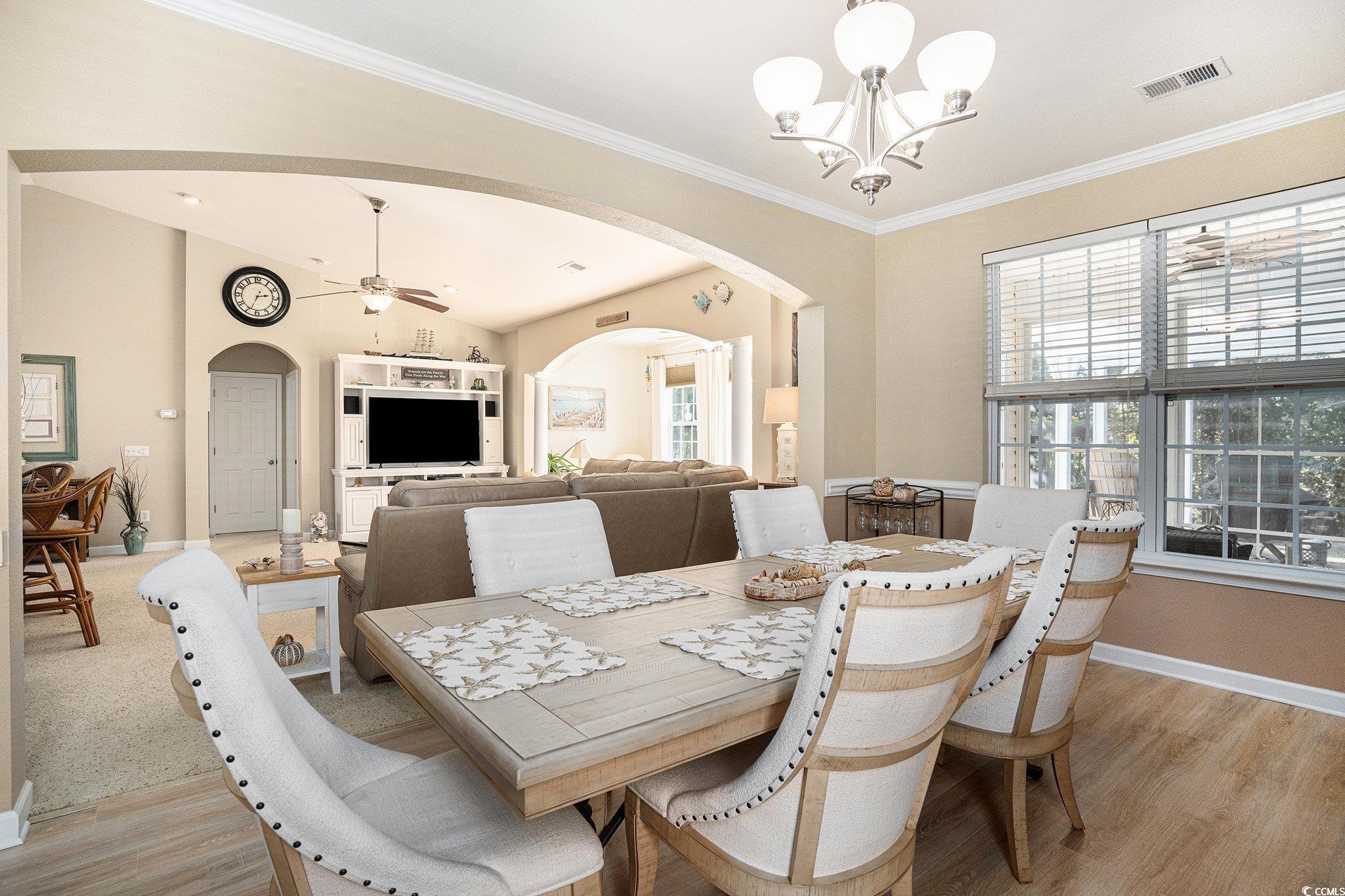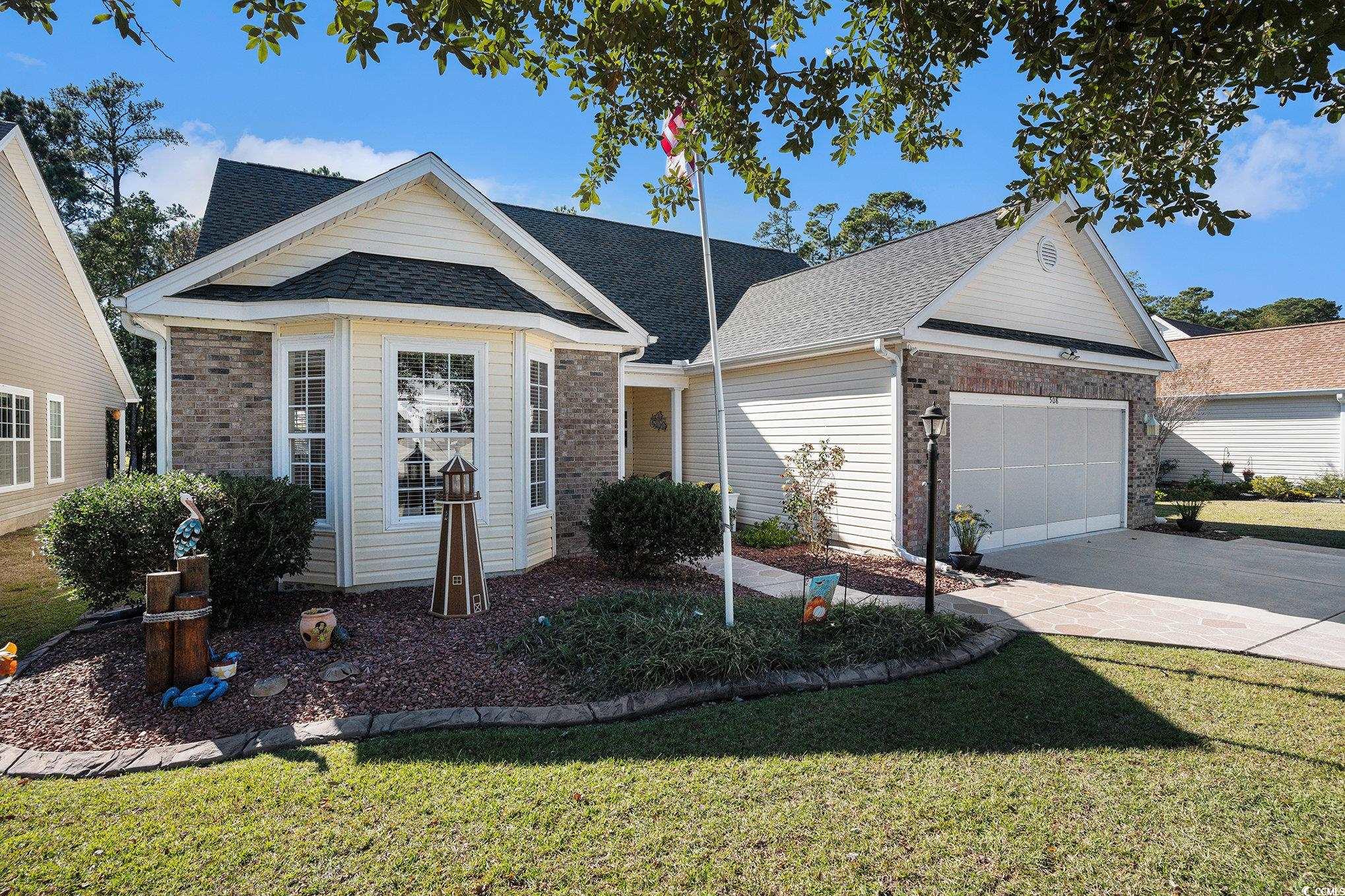 Welcome to this beautifully maintained home nestled in the desirable Hidden Lakes Village community of Little River. This inviting three-bedroom, two-and-a-half-bath residence offers a bright, open layout designed for effortless everyday living and comfortable entertaining. A charming front porch welcomes you home, setting the tone for the warmth that continues inside. The spacious living room features plenty of natural light, and an open flow into the dining and kitchen areas. Neutral tones and graceful archways add character, while the adjoining sitting area is filled with sunshine and serene outdoor views which is perfect for relaxing with family or hosting guests. The kitchen is both functional and inviting, featuring dark cabinetry, light countertops, and a classic tile backsplash for that timeless feel. A breakfast bar opens to the living area, providing the perfect spot for casual meals and conversation, while a center island offers additional workspace and storage. Just beyond, is a breakfast nook that has plenty windows that bathe the space in natural light, creating a bright and airy setting for morning coffee or relaxed dining. For larger gatherings, the formal dining room provides an elegant touch with crown molding, chair rail details, and a statement chandelier. It’s a seamless blend of casual comfort and timeless sophistication. The spacious primary suite serves as a peaceful retreat with soft colors, plush carpet, and ample room for a bedroom set. The adjoining en-suite bath includes a dual-sink vanity, deep soaking tub, and separate walk-in shower. A generous walk-in closet with custom shelving completes the space, offering both organization and convenience. Two additional bedrooms provide versatility — ideal for guests, family, or a home office — each featuring abundant natural light and generous closet space. A dedicated laundry room offers extra storage and easy access from the main living areas, and a convenient half bath adds functionality when entertaining. The Carolina Room is designed to bring the outdoors in with expansive windows, flooding the space with light and views of the backyard. Whether used as a cozy reading nook, sunroom, or flexible sitting area, this bright retreat is perfect for year-round enjoyment. Step outside to discover your own backyard sanctuary. The covered patio is ideal for grilling or morning coffee, or lounging and entertaining. Thoughtful landscaping with palms and flowering plants enhances the coastal feel, and the wooded backdrop offers privacy and tranquility with no rear neighbors. It’s the perfect balance of nature and comfort — whether hosting friends or simply unwinding after a long day. Hidden Lakes Village residents enjoy a wonderful coastal lifestyle with community amenities that include a sparkling putdoor pool, tennis courts, pickleball, and sidewalks throughout the neighborhood. Located just minutes from shopping, dining, golf, and the beautiful beaches of Cherry Grove and North Myrtle, this home combines peaceful living with unbeatable convenience. Make sure you ask for a copy of the floor plan. Buyer is responsible for verification.